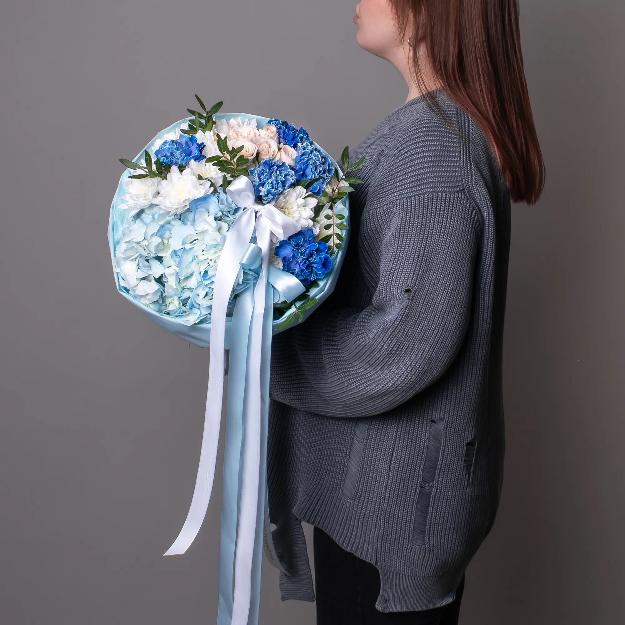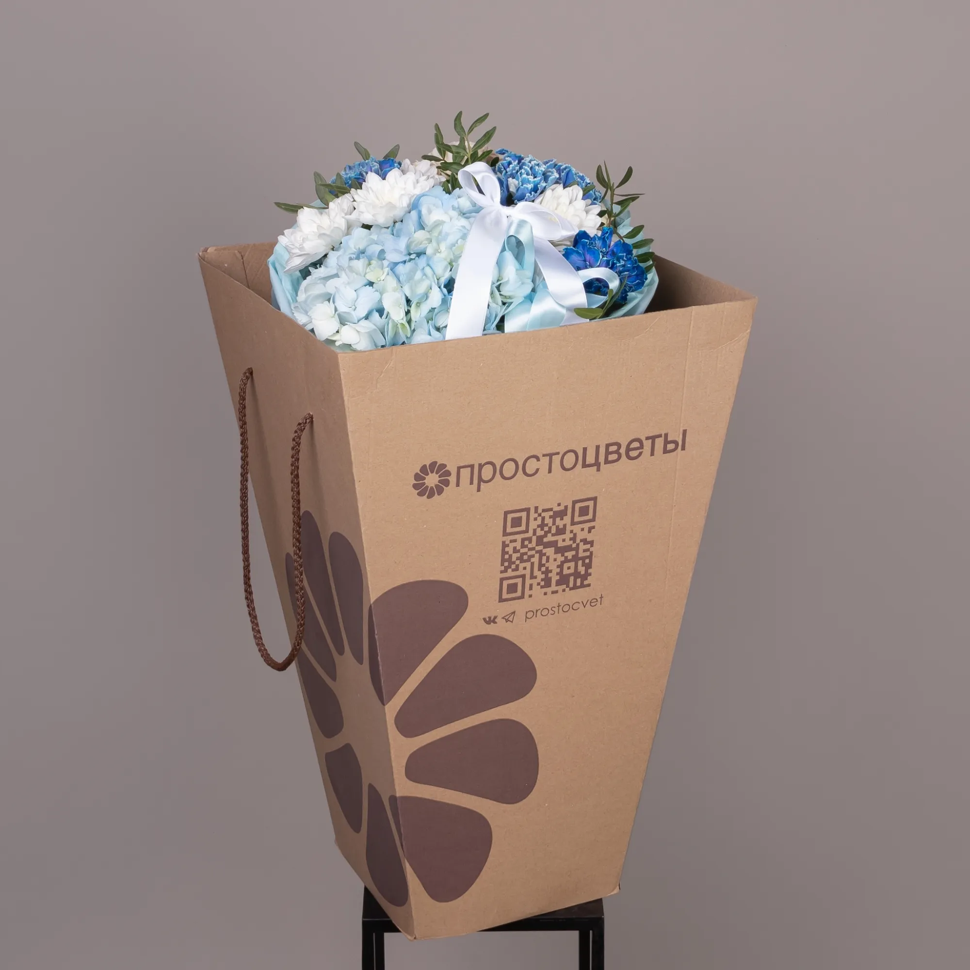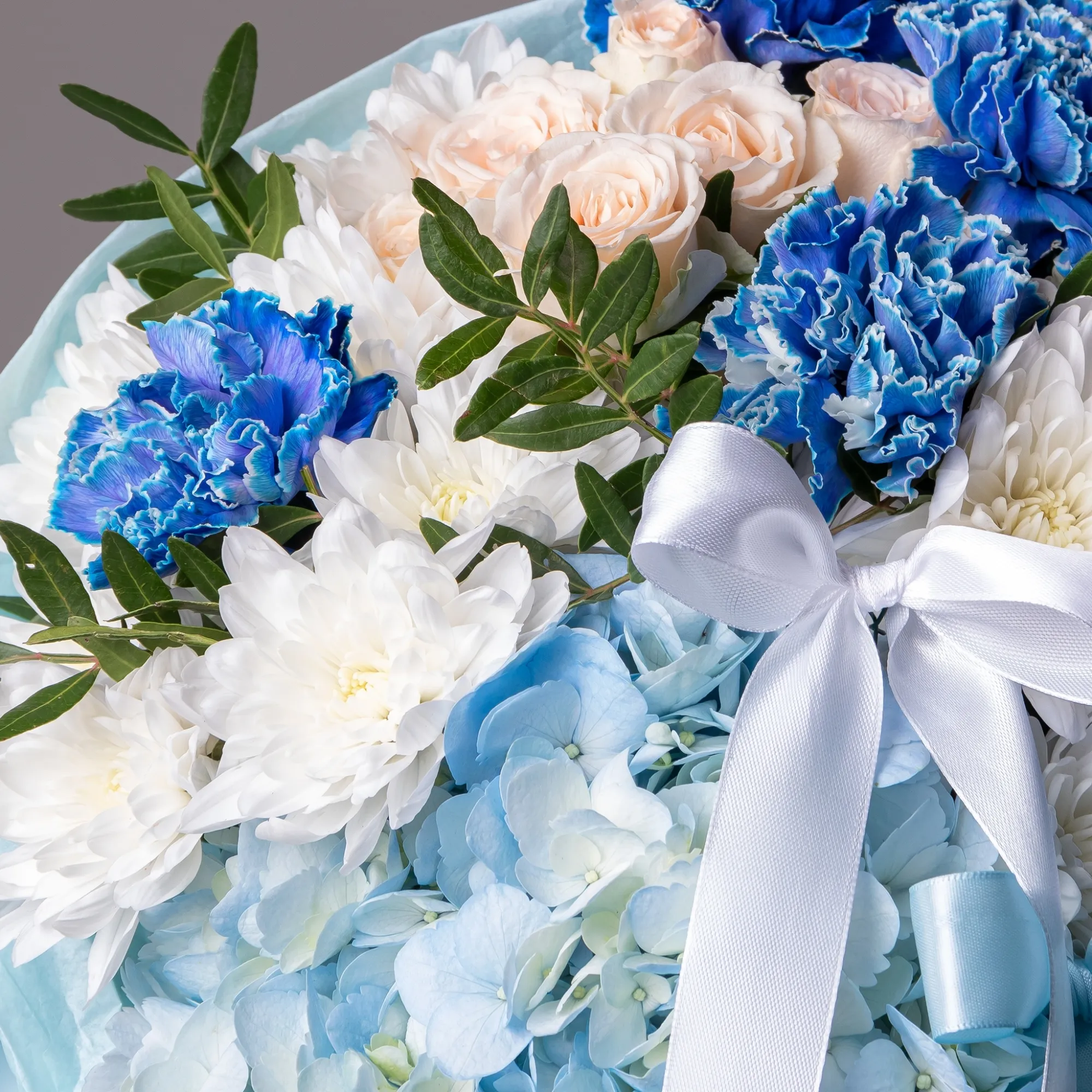 В составе букета "Небесное счастье M" кустовая роза "Софи", белая хризантема, голубая гидрангия, голубая гвоздика, дополнен листьями фисташки. Идеально подойдет для *Предложение руки и сердца* - нежная композиция в пастельных тонах создаст романтичную атмосферу для важного момента, также подходит для *Годовщины свадьбы* - изысканный букет в голубых оттенках символизирует верность и постоянство, идеально подойдет для празднования годовщины. Закажите букет с доставкой или заберите самовывозом. И помните, что цветы - это просто.