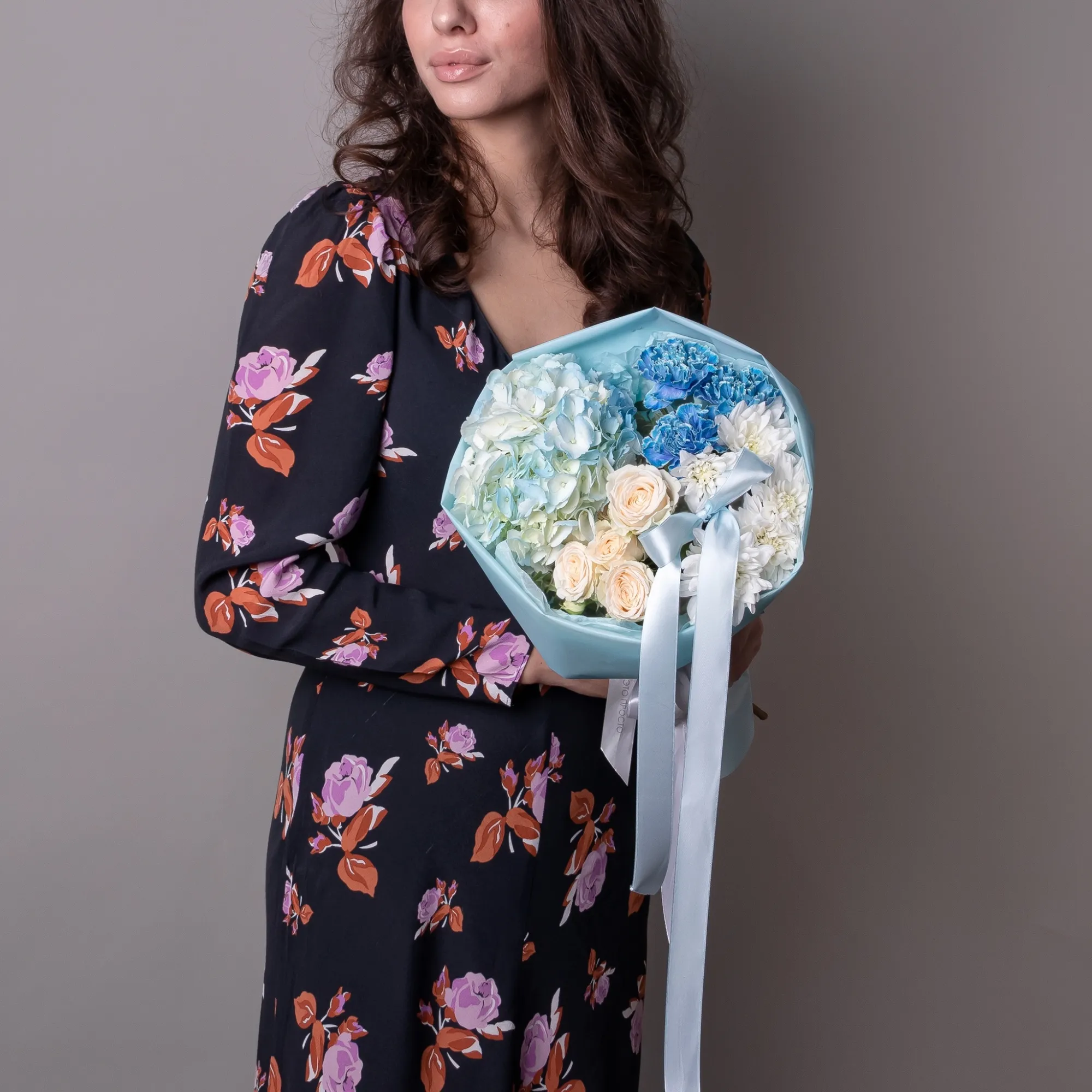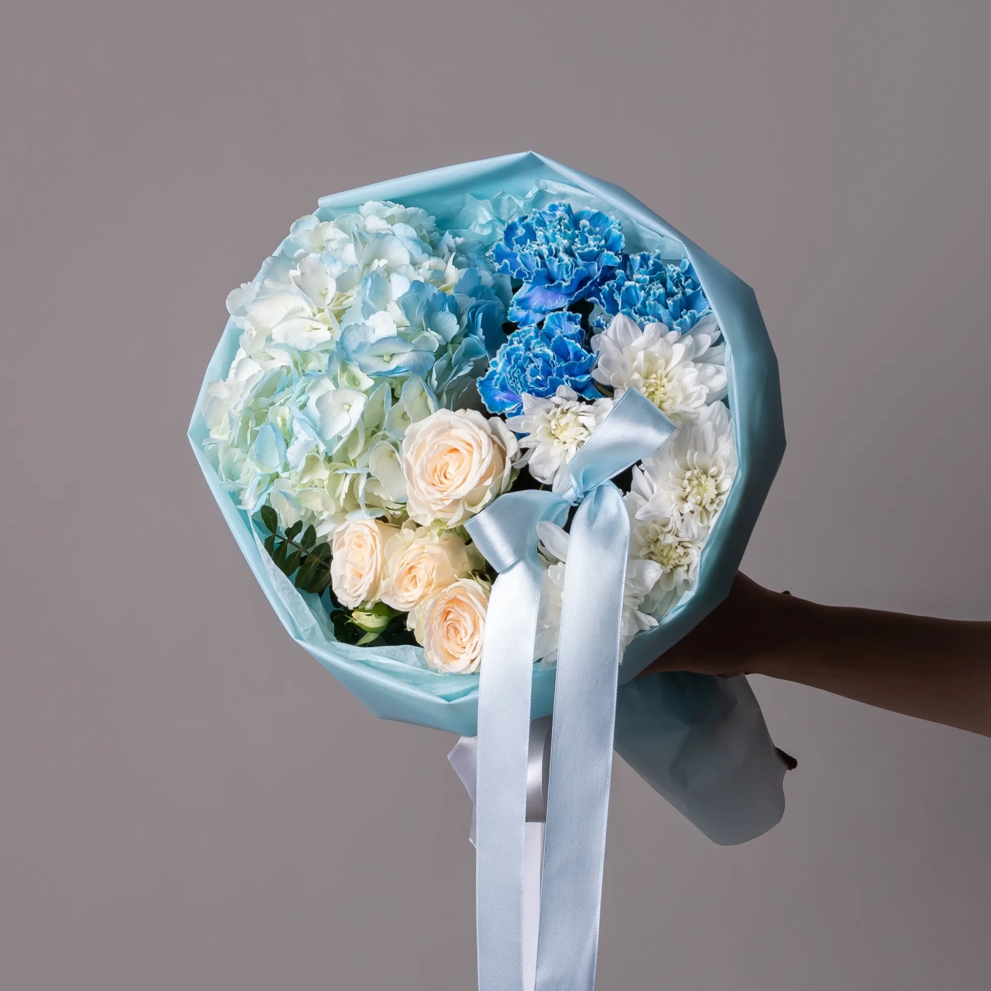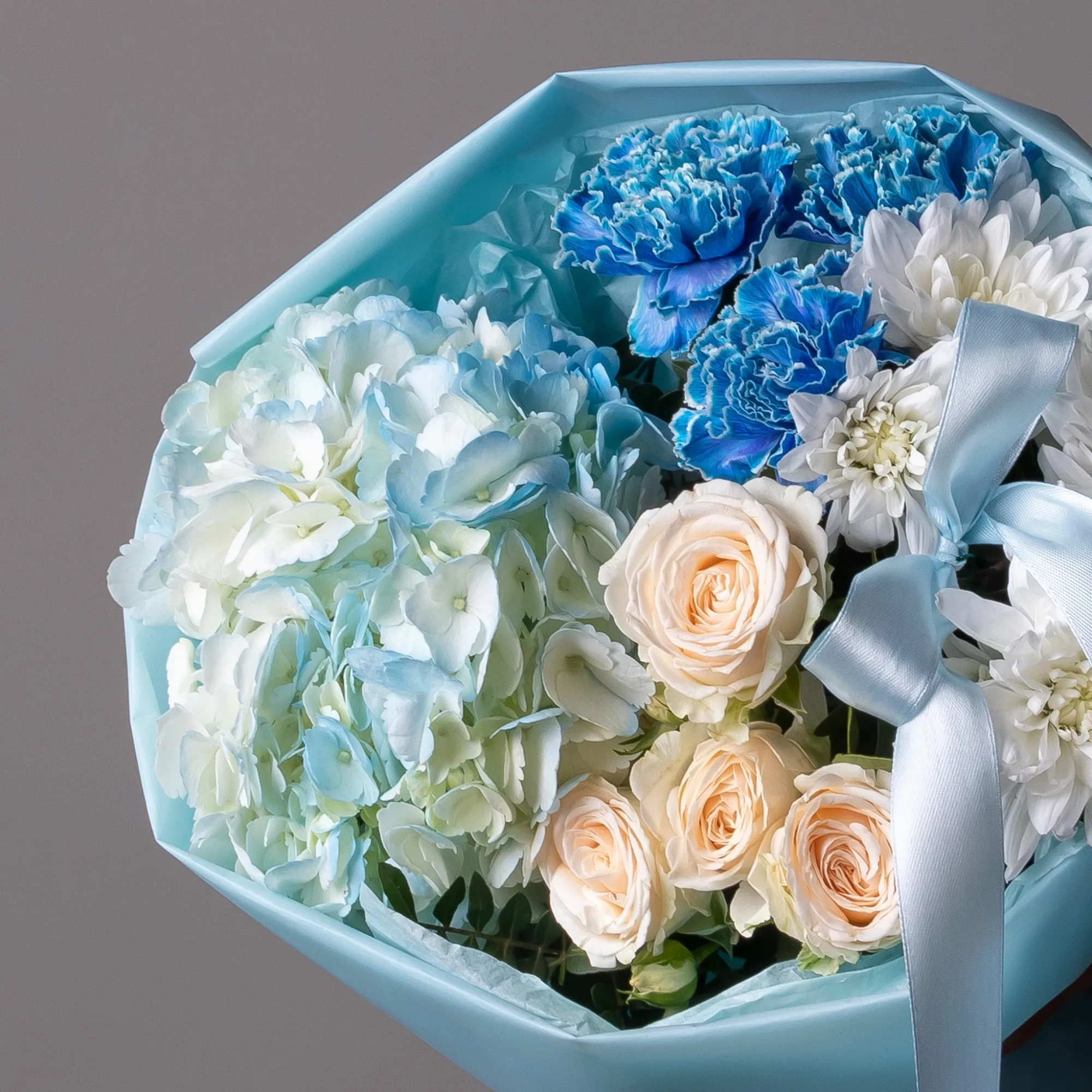 В составе букета "Небесное счатье XS" кустовая роза "Софи", белая хризантема, голубая гидрангия, голубая гвоздика, дополнен листьями фисташки. Идеально подходит для подарка на *Романтическое свидание*- компактный букет в нежных голубых и белых тонах идеально подойдет для создания уютной атмосферы и выражения чувств. А также для *Поздравления с важным событием*- изящная композиция в спокойных тонах станет уместным подарком для достижения целей или начала нового этапа в жизни. Закажите букет с доставкой или заберите самовывозом. И помните, что цветы - это просто.