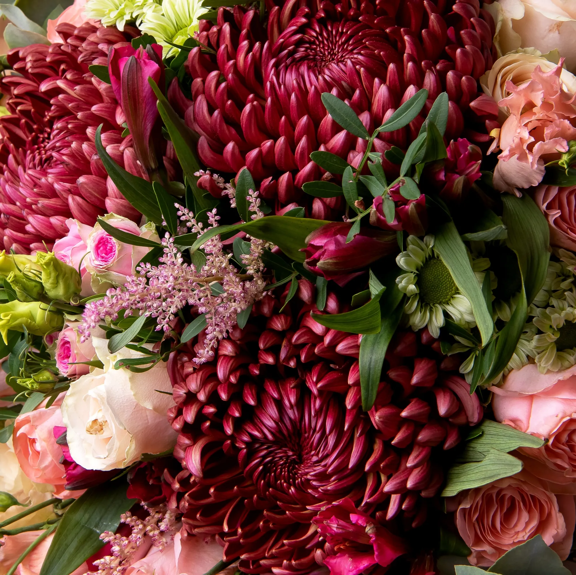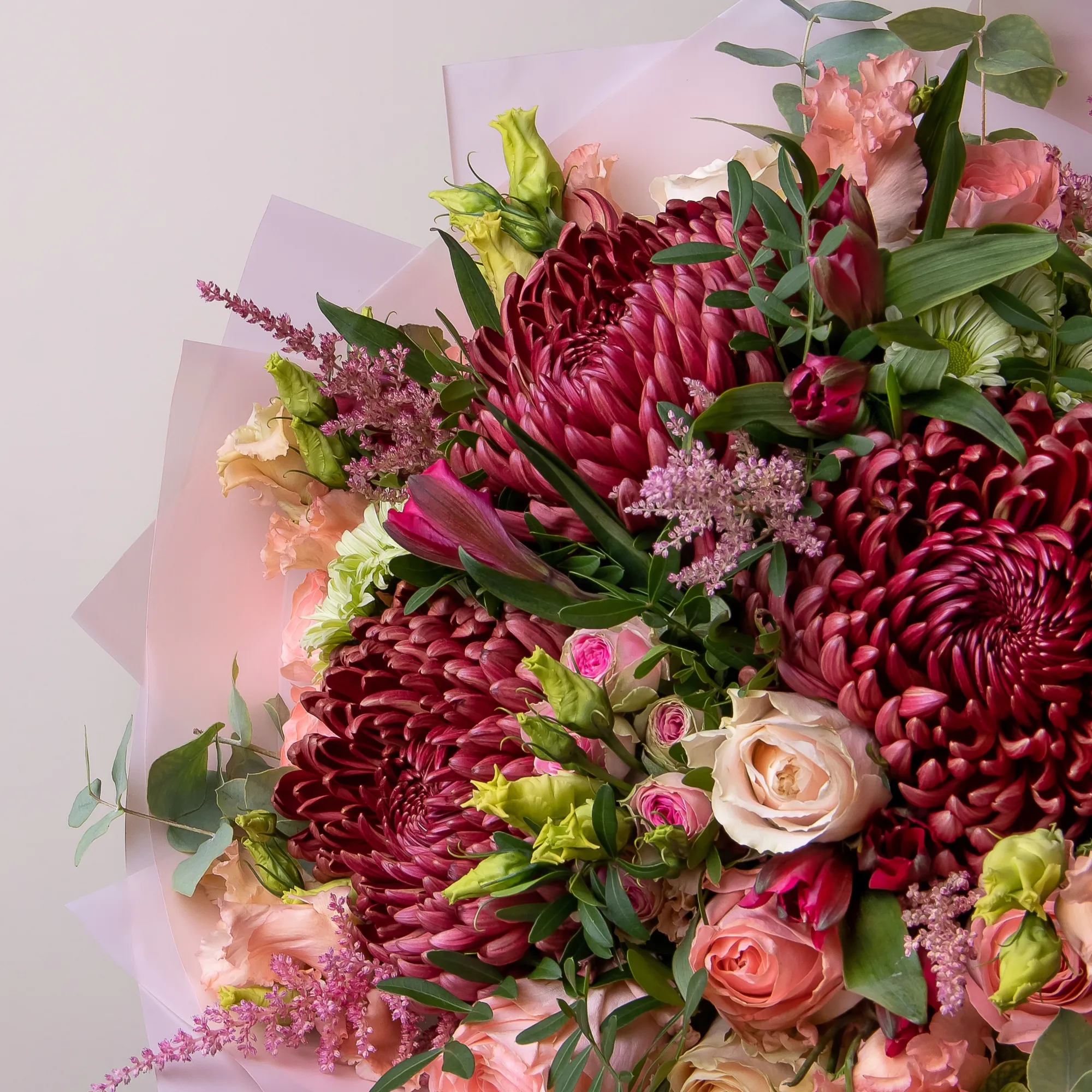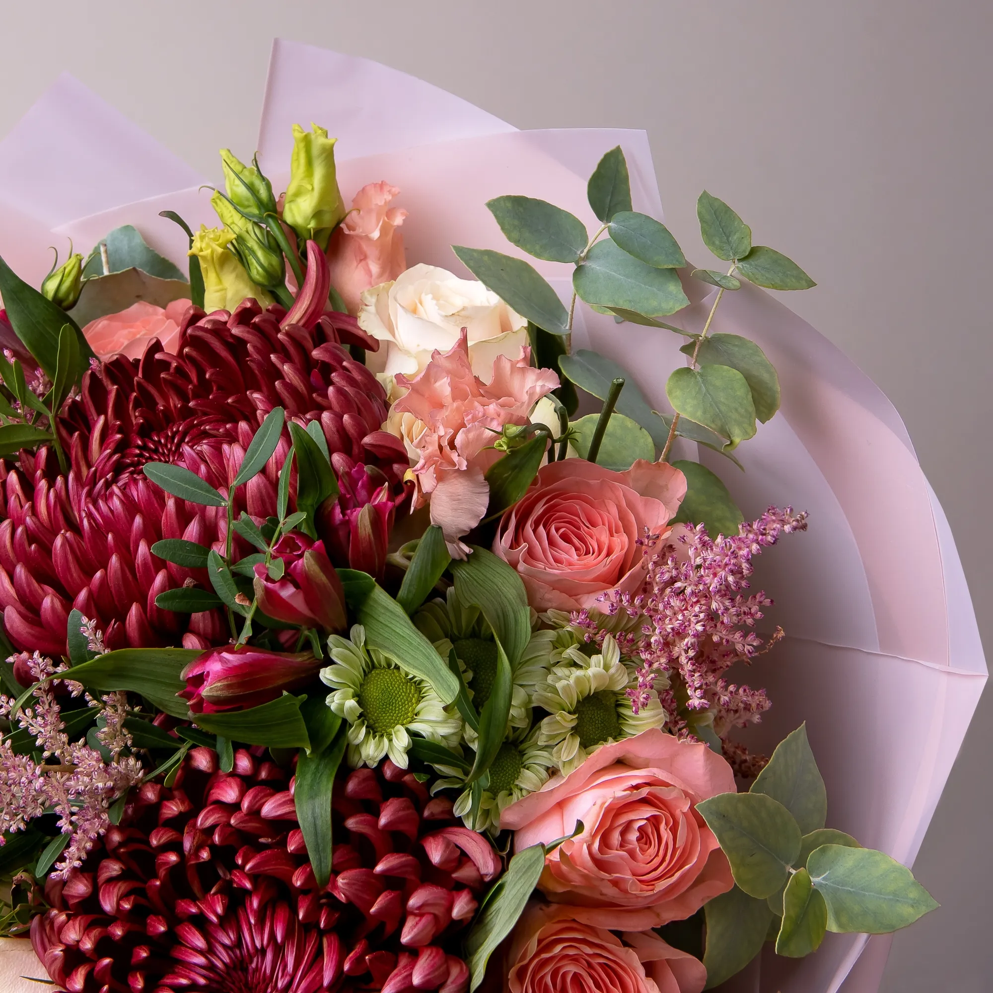 Роза, Хризантема, Альстромерия, Листья фисташки, Листья эвкалипта