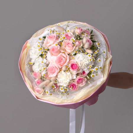 В составе букета NEW "Шарлотта М" кустовая роза "Динара", белая гвоздика, роза "Фламинго", белая матрекария, дополнен листьями фисташки и сухоцветом лагурус. Этот букет идеально подойдёт для следующих случаев: *Свадебное поздравление или украшение торжества - нежная пастельная гамма и сочетание белых и розовых оттенков создают романтичную атмосферу, идеально подходящую для свадебных церемоний, кустовые розы и нежные матрекарии добавят букету воздушности и легкости, что особенно актуально для свадебных букетов или декора. *Поздравление с рождением ребенка- светлые, чистые тона букета символизируют начало новой жизни и нежность, природные элементы (сухоцвет лагурус) добавляют композиции естественности и теплоты, что делает его отличным подарком для молодых родителей, особенно для рождения девочки. Закажите букет с доставкой или заберите самовывозом. И помните, что цветы - это просто.