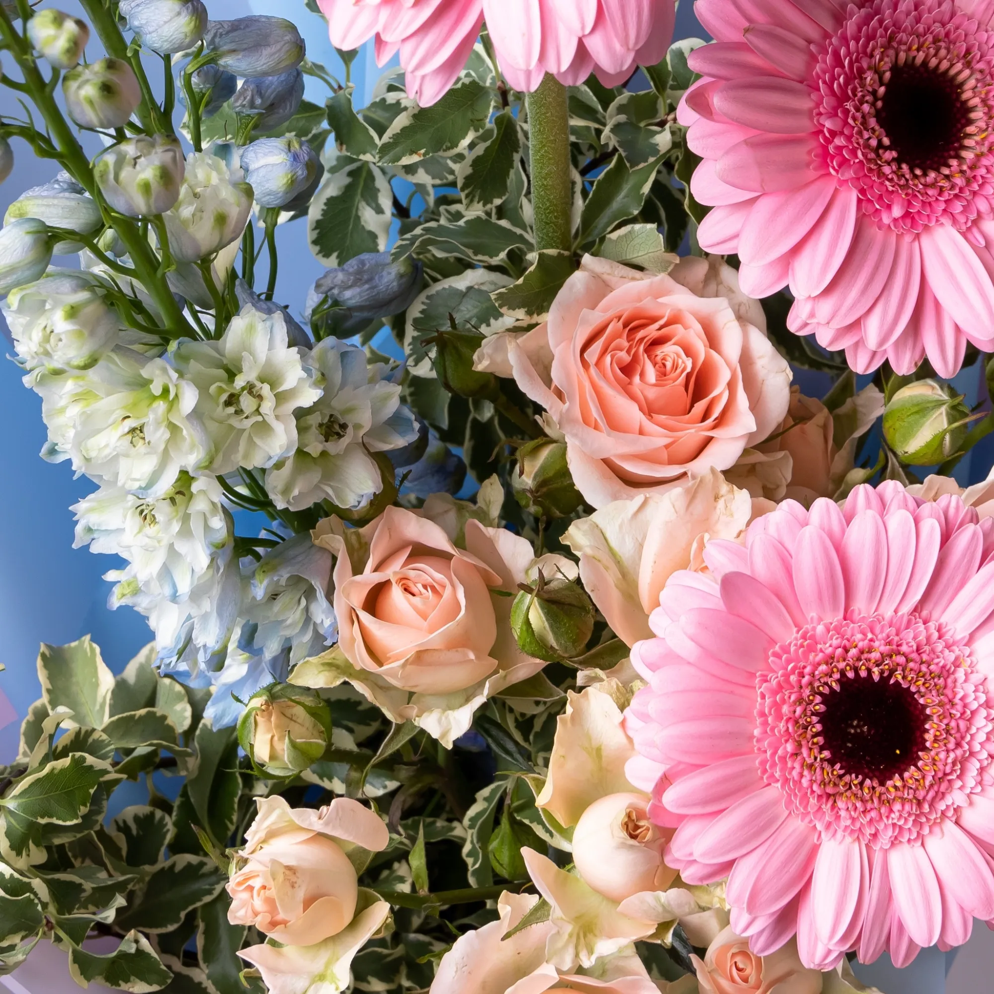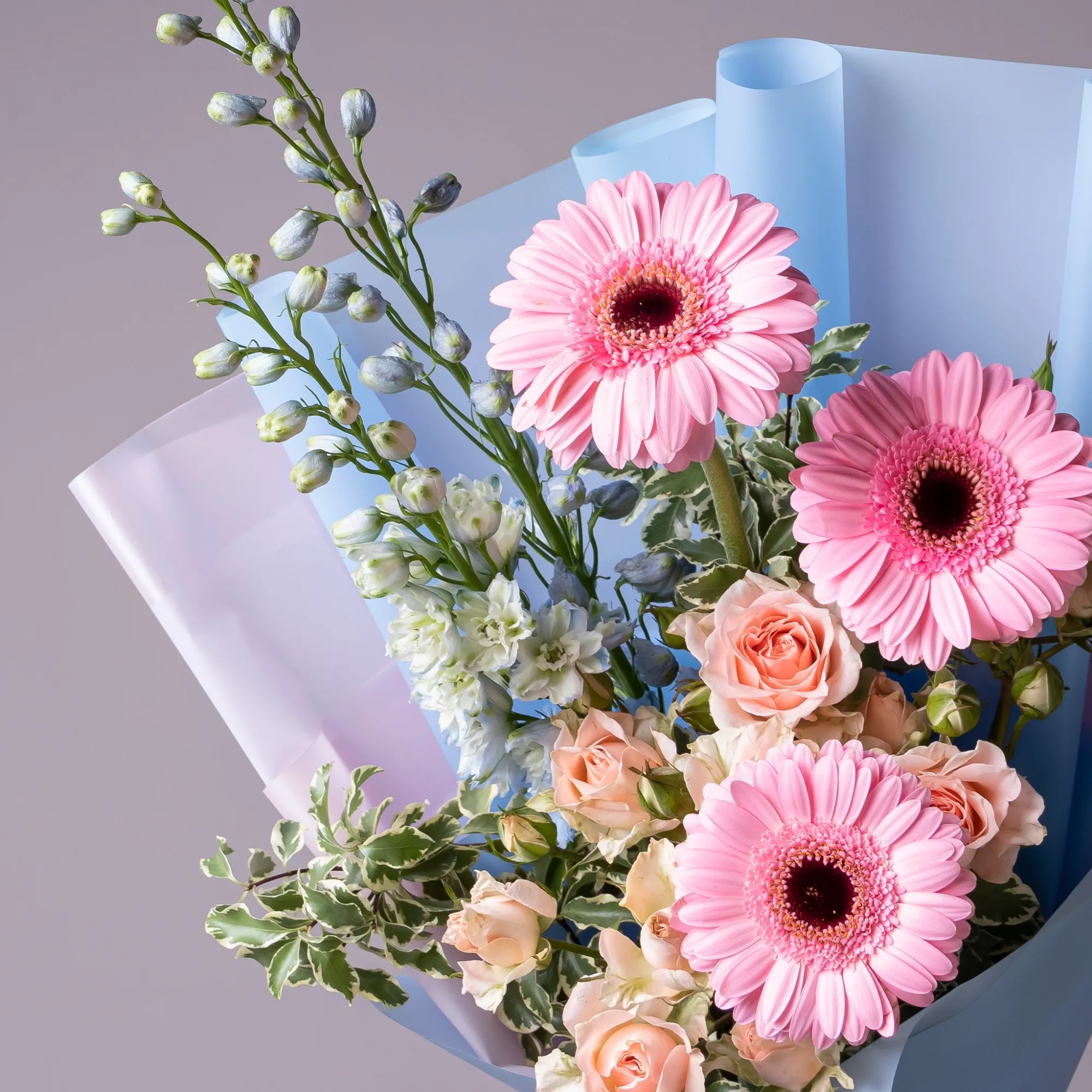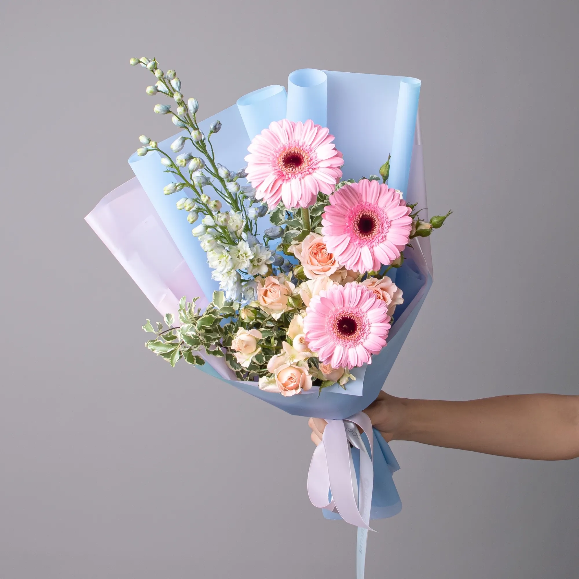 Гермини-3, Роза кустовая-1, Дельфиниум-2, Листья питтоспорум-3