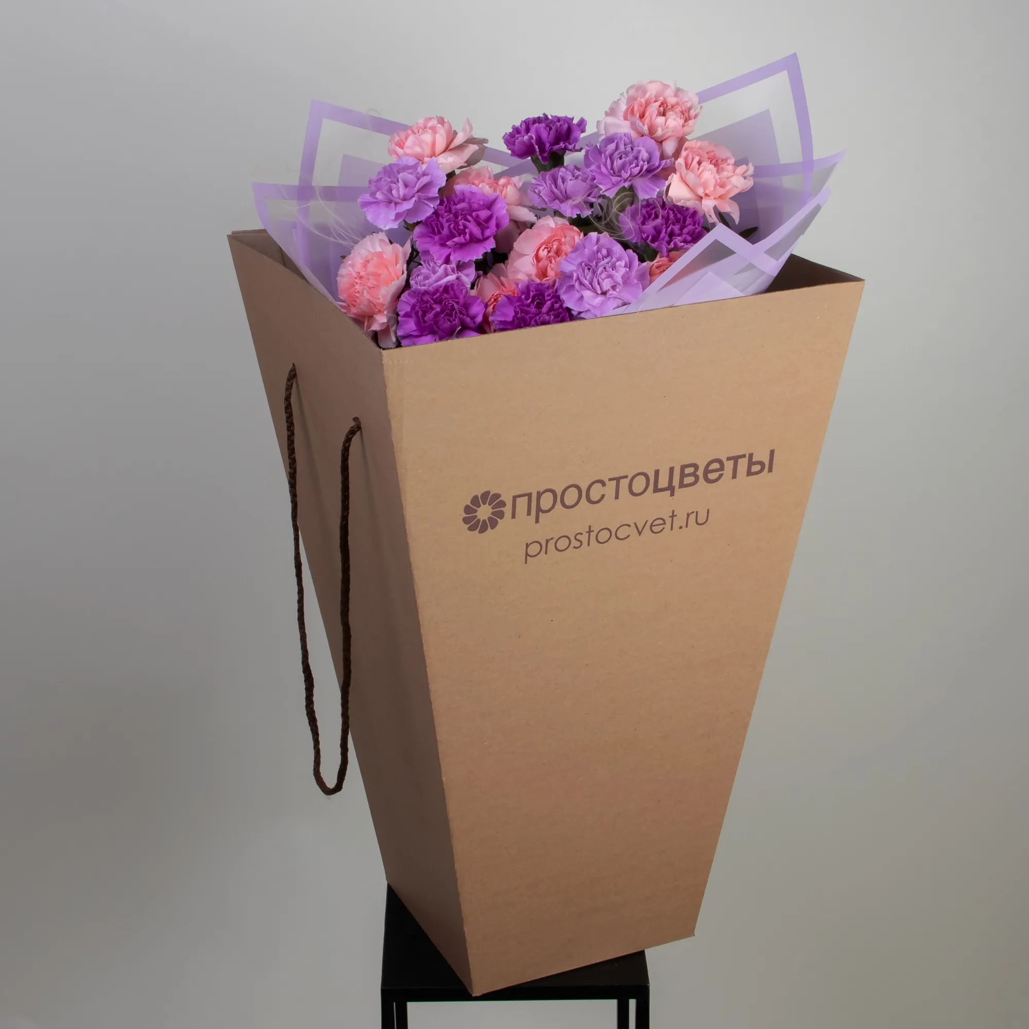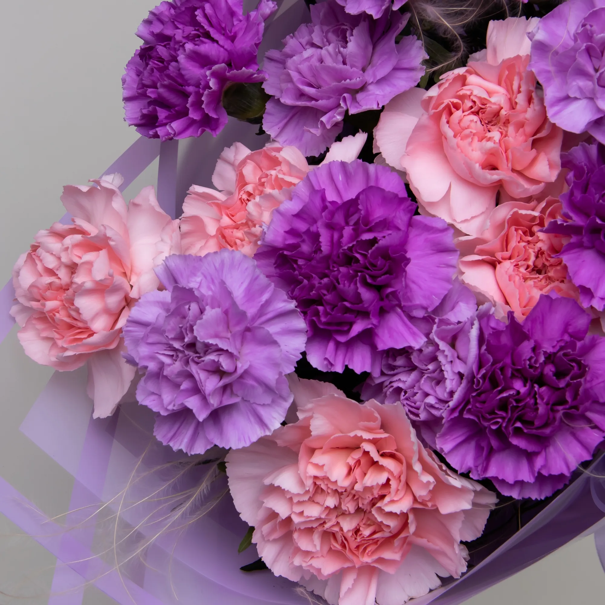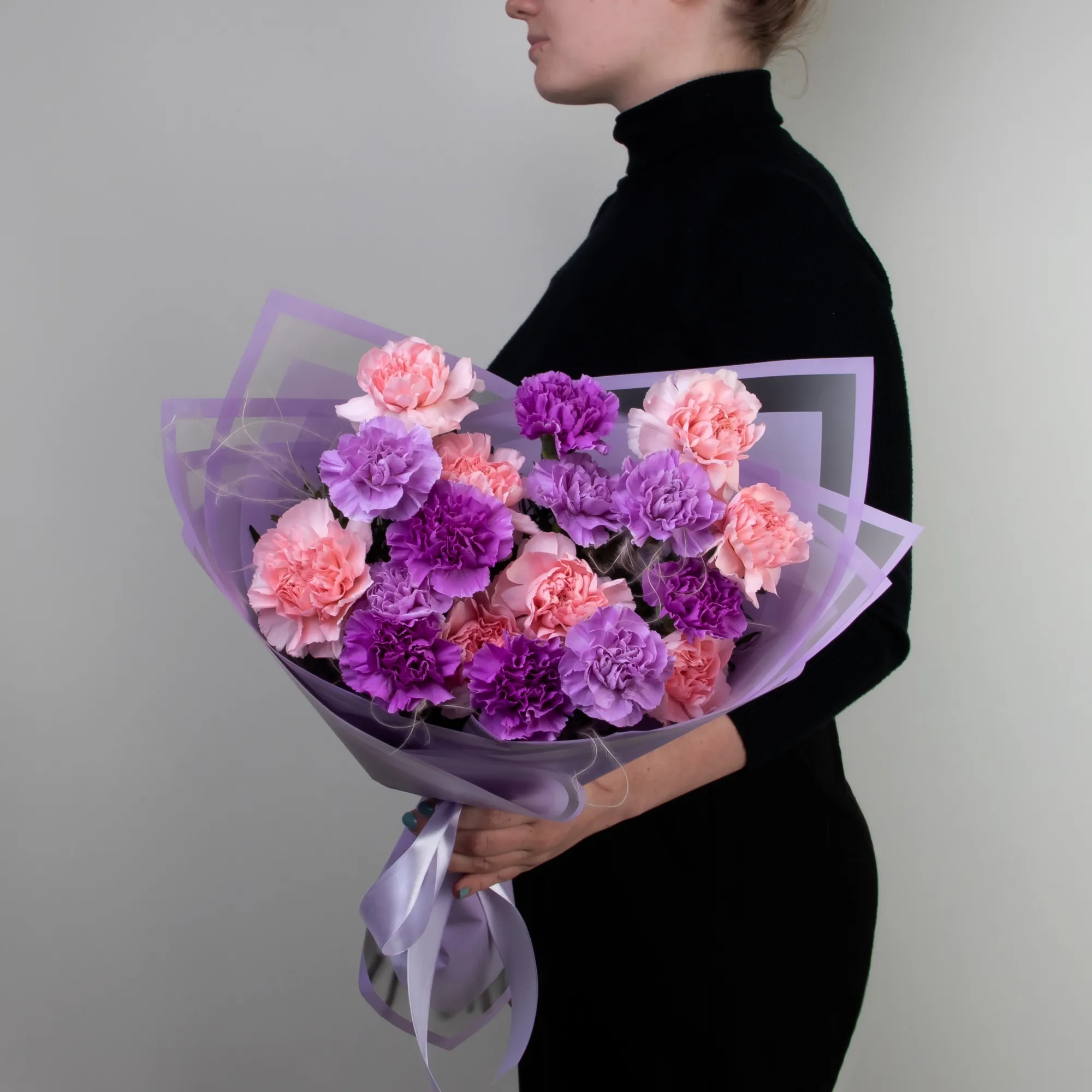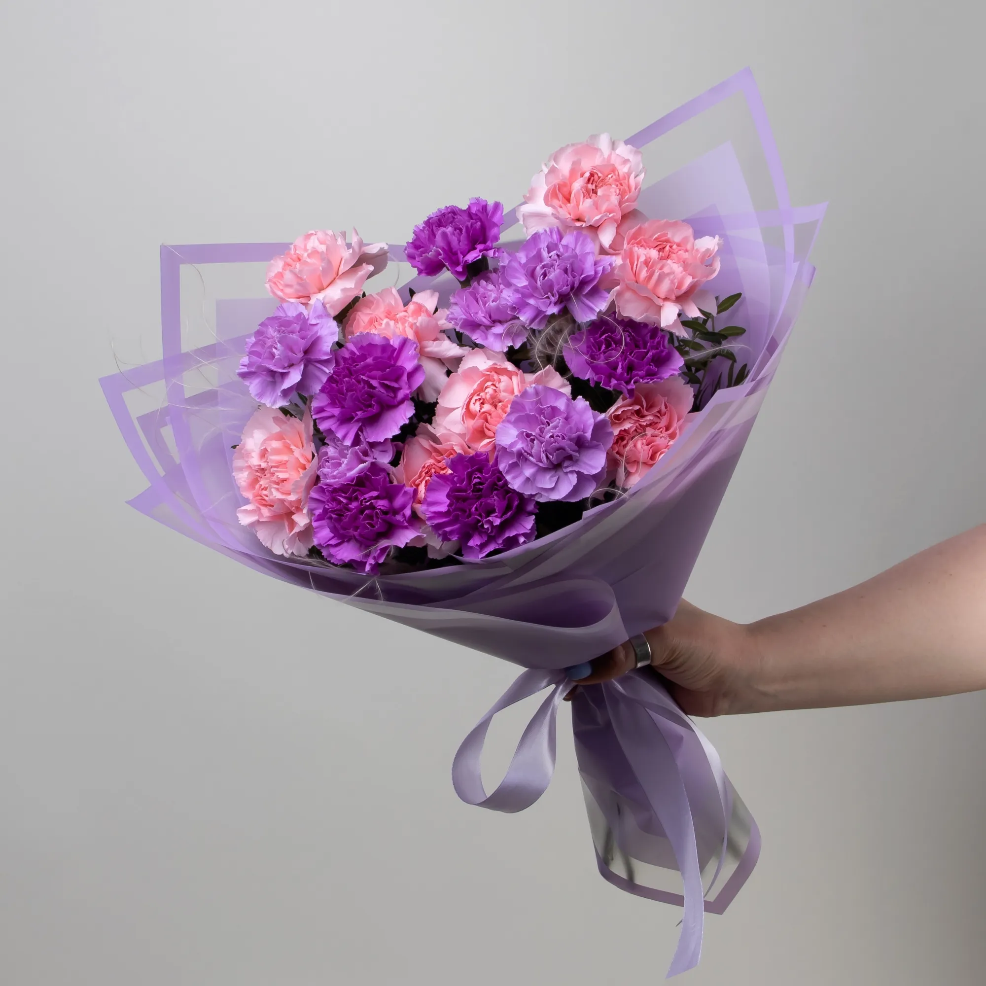 Нежный монобукет из диантусов трех цветов. Дополнен упаковкой сиреневого цвета и сереневой лентой.