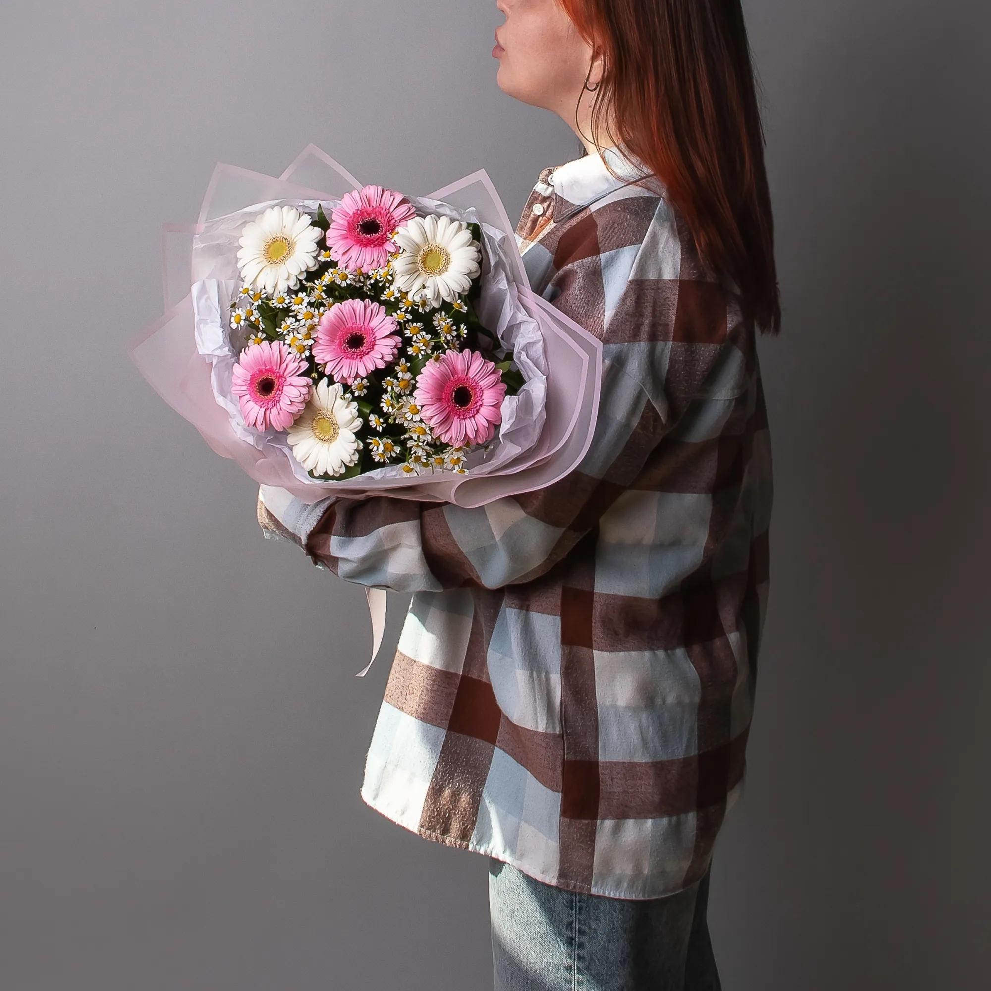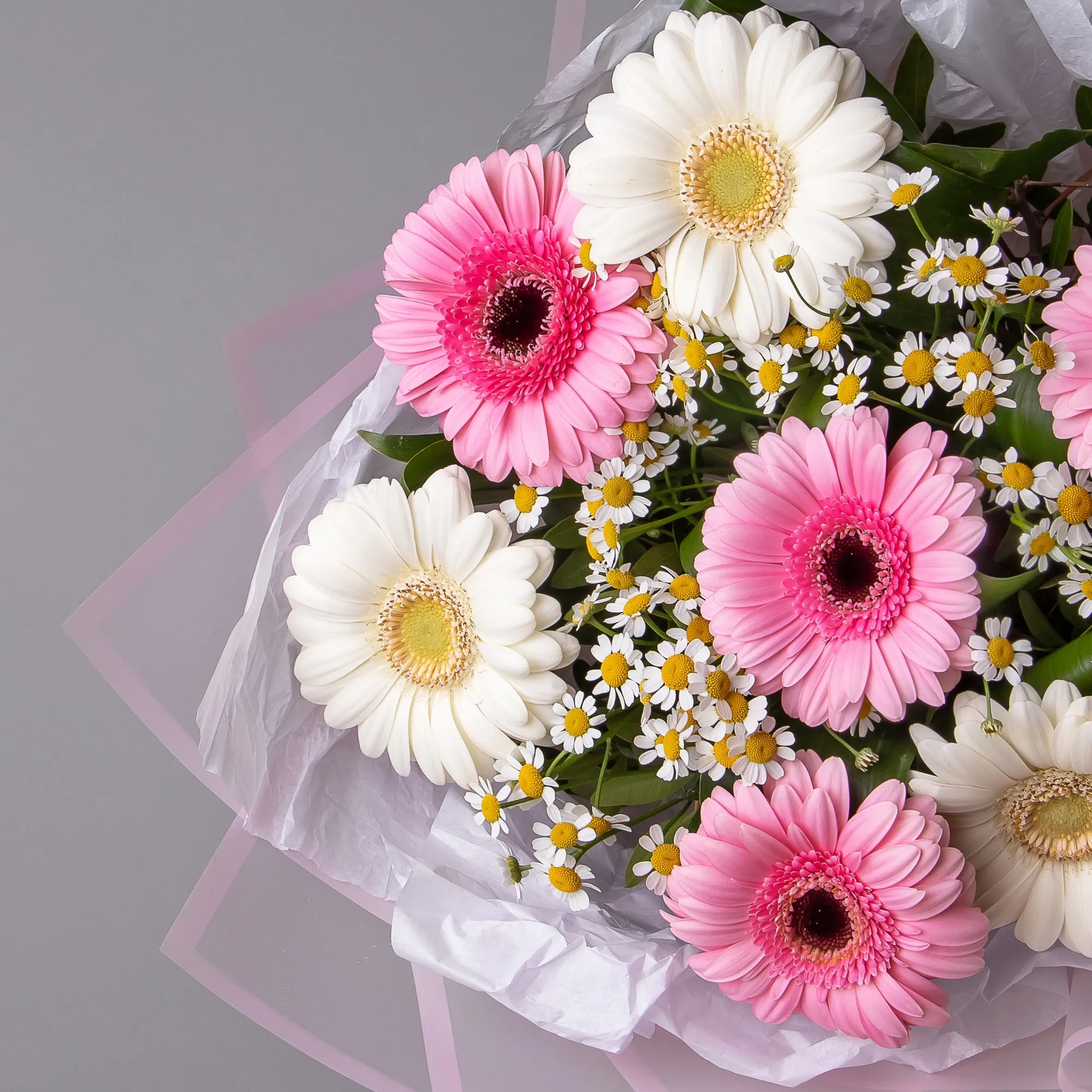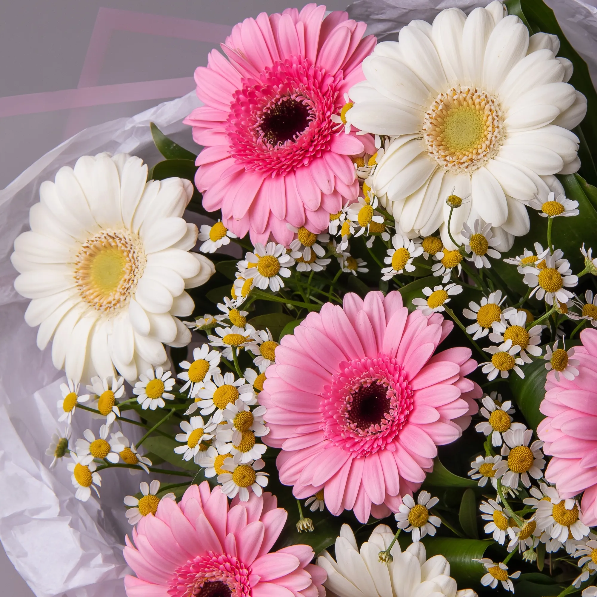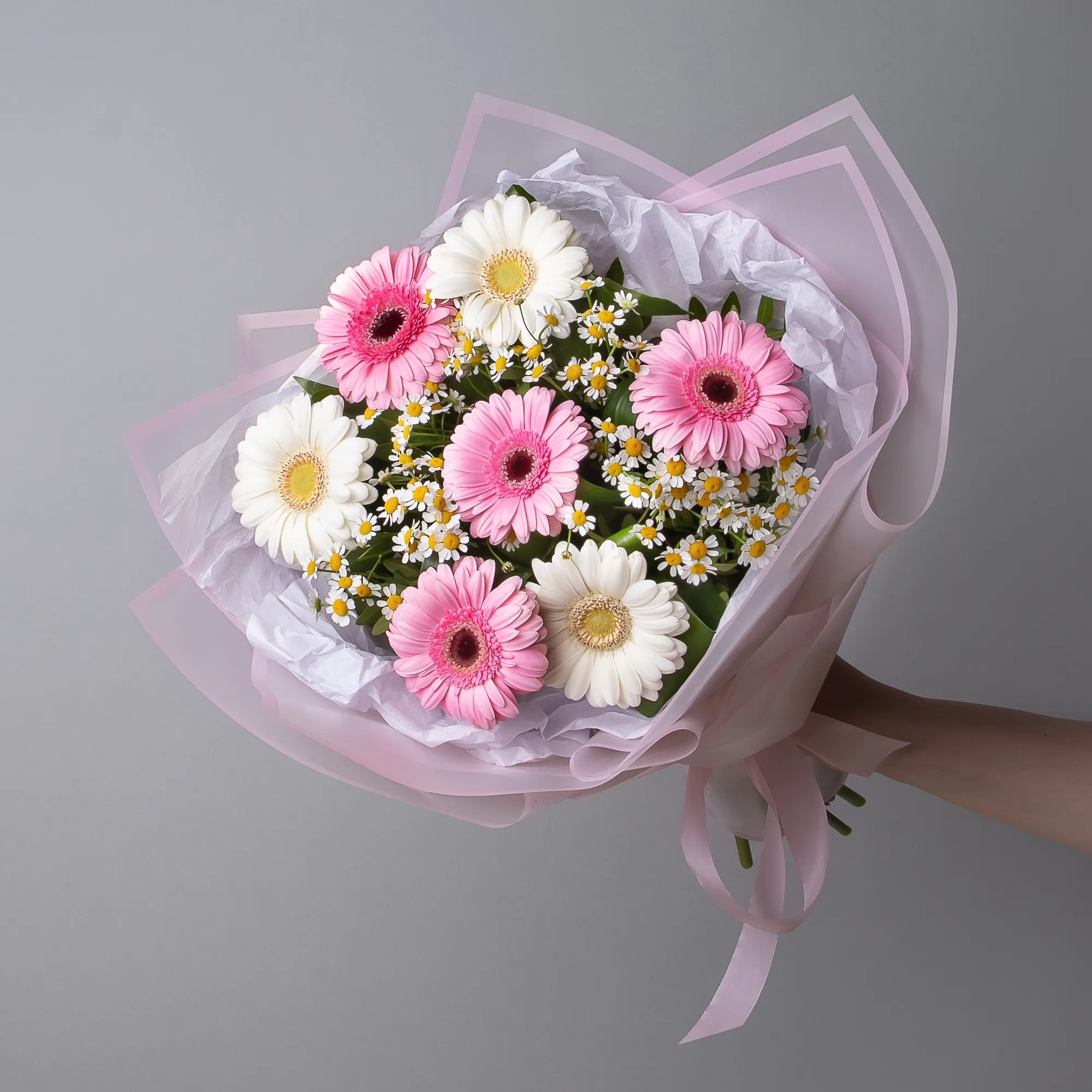 В составе букета "Нежный S" белая гермини, белая матрекария, розовая гермини, дополнен листьями фисташки и аспидистры. Этот букет идеально подойдет для следующих случаев: *Первое свидание*- нежный букет в светлых тонах создаст романтичную атмосферу и поможет выразить симпатию. *Поздравление с беременностью* - деликатная композиция в пастельных оттенках идеально подойдет для поздравления будущей мамы, символизируя чистоту и нежность. Закажите букет с доставкой или заберите самовывозом. И помните, что цветы - это просто.