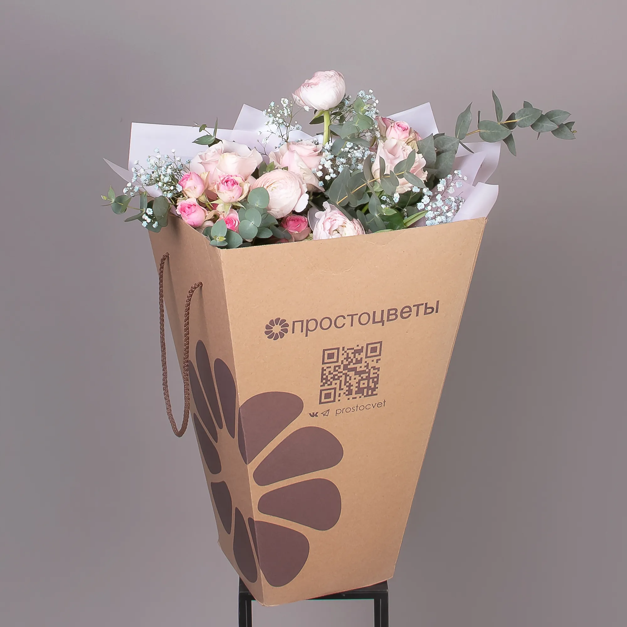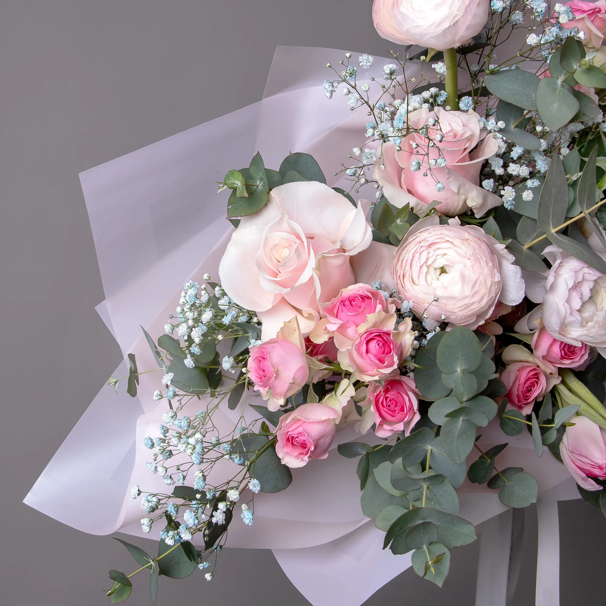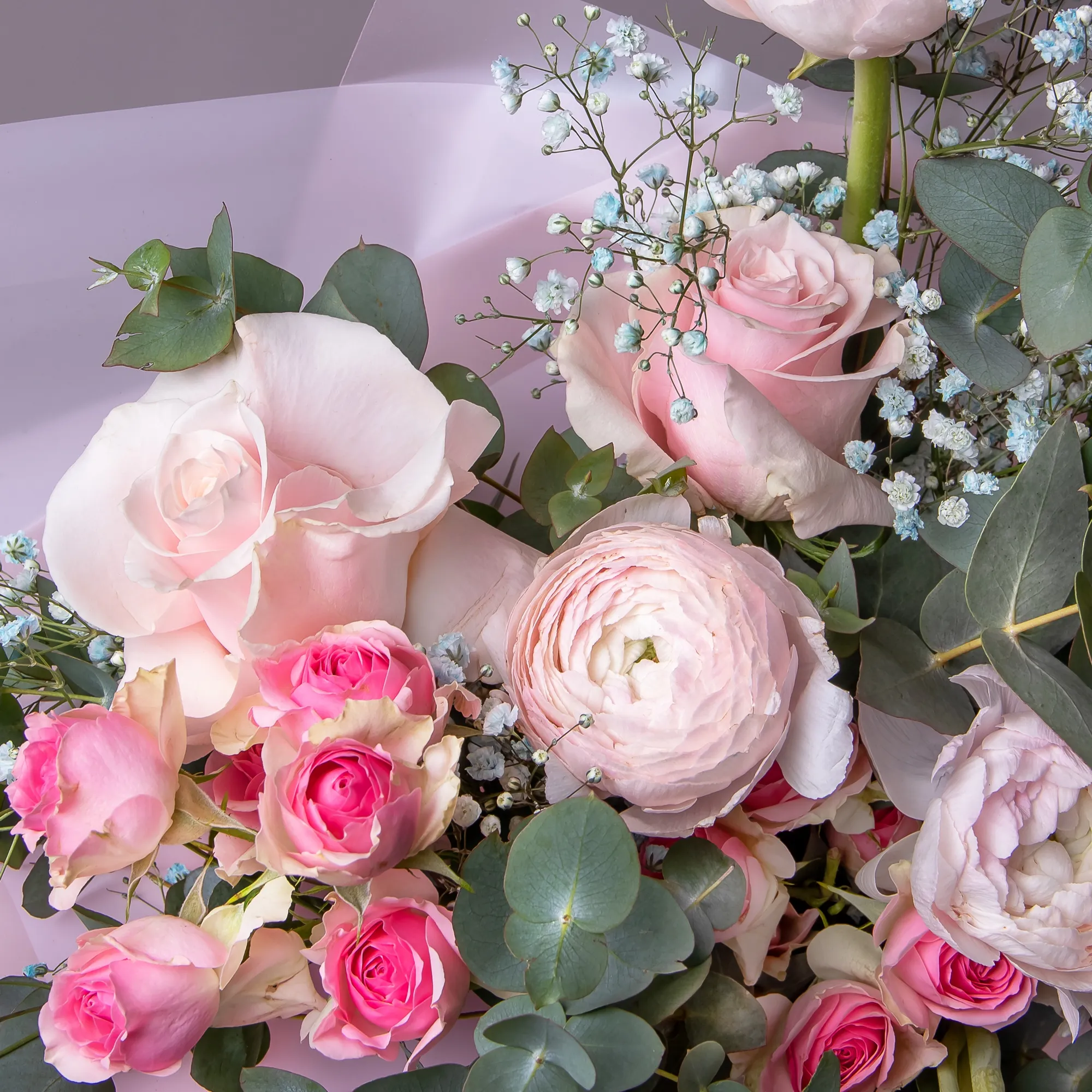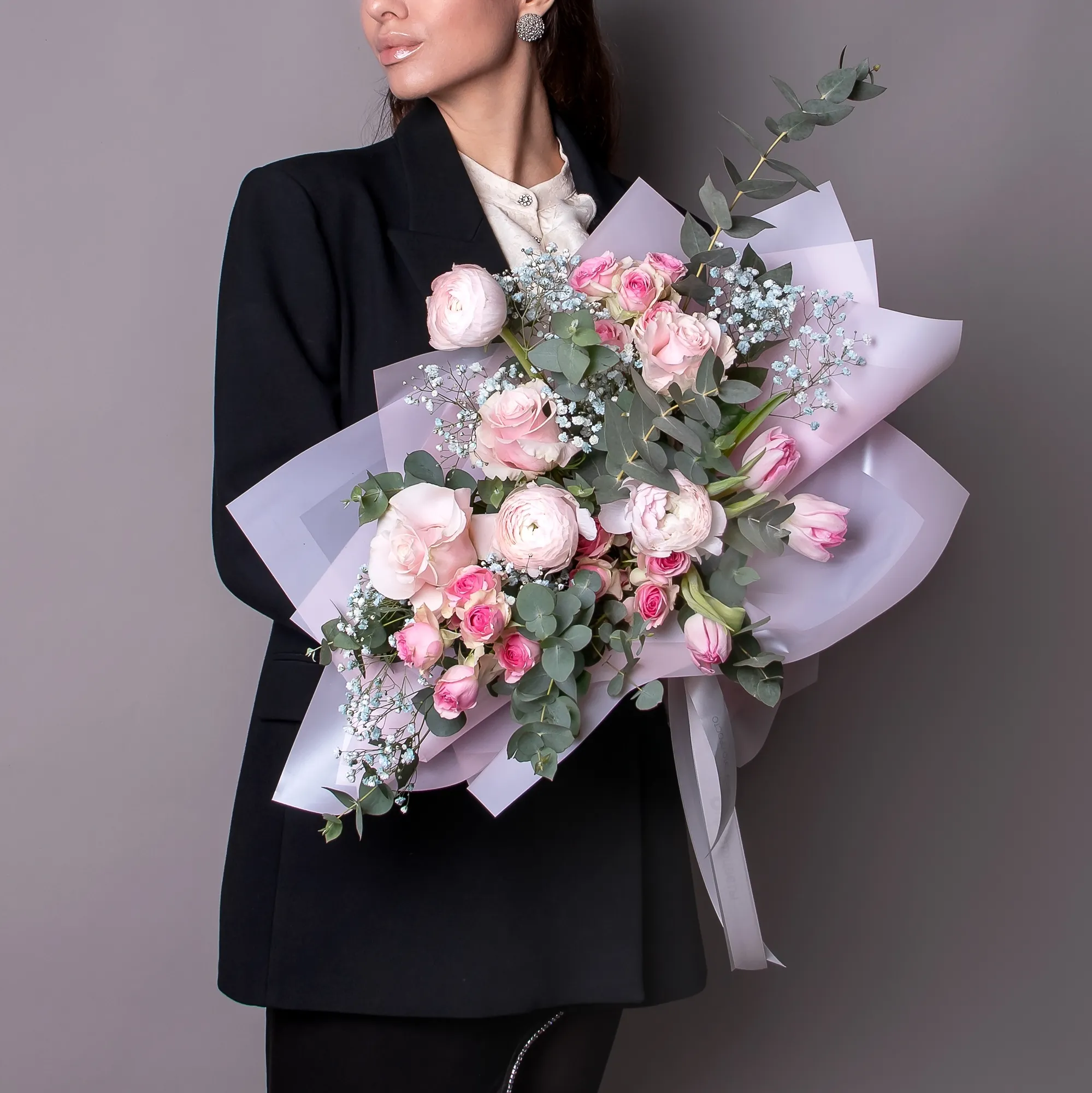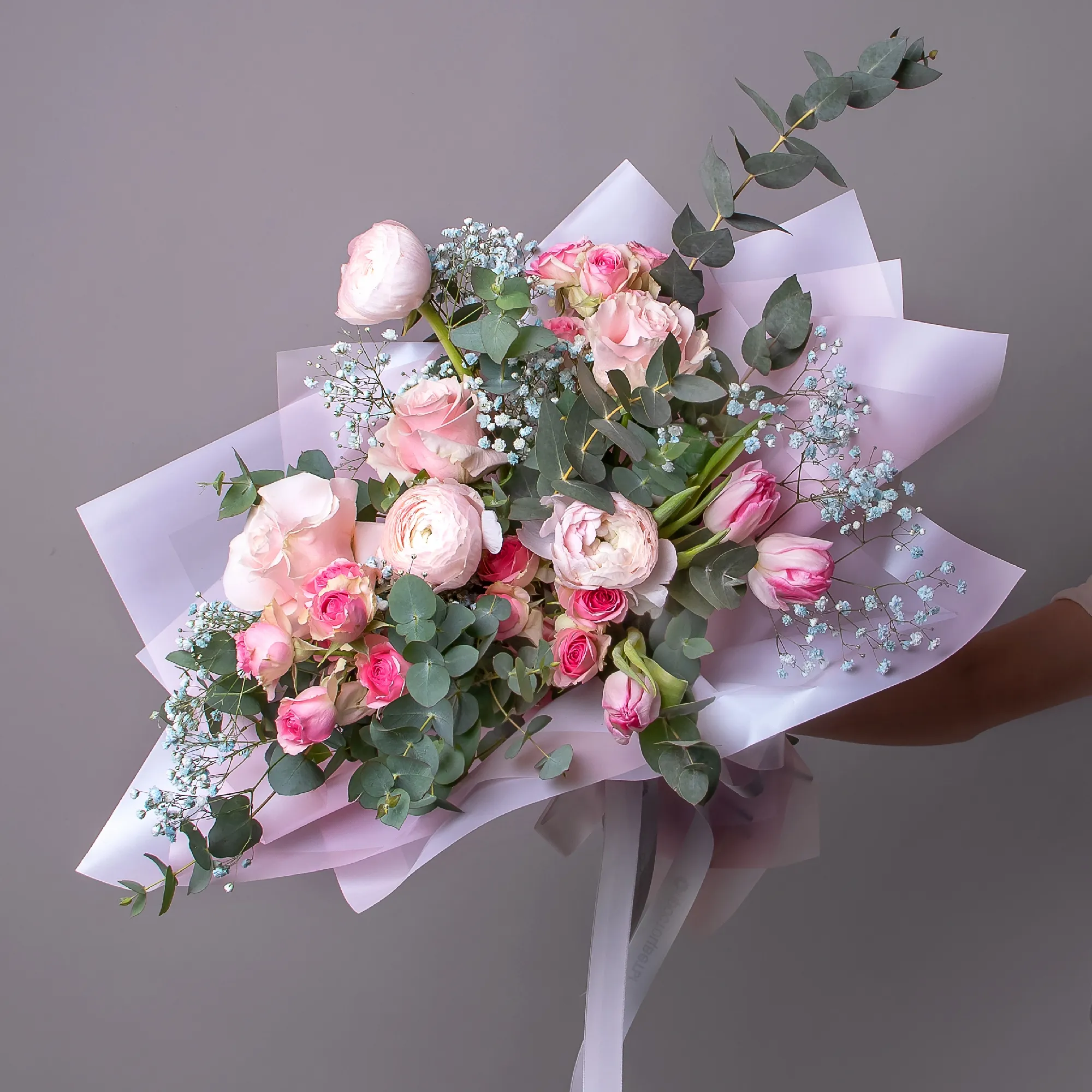 Роза-3, Тюльпан-3, Роза кустовая-3, Ранункулюс-3, Гипсофила-2, Листья эвкалипта-4