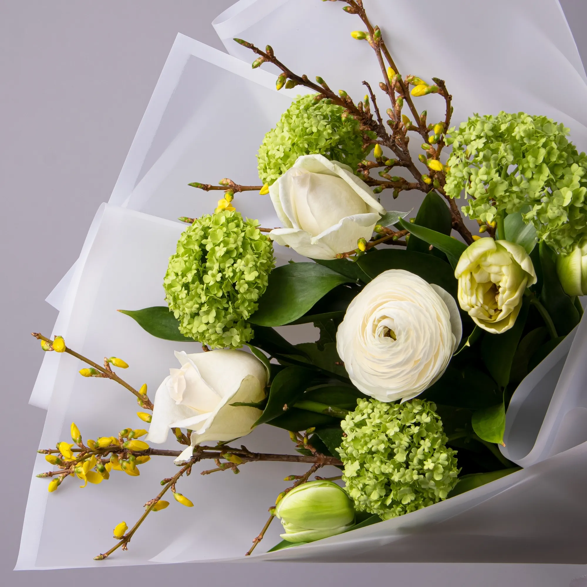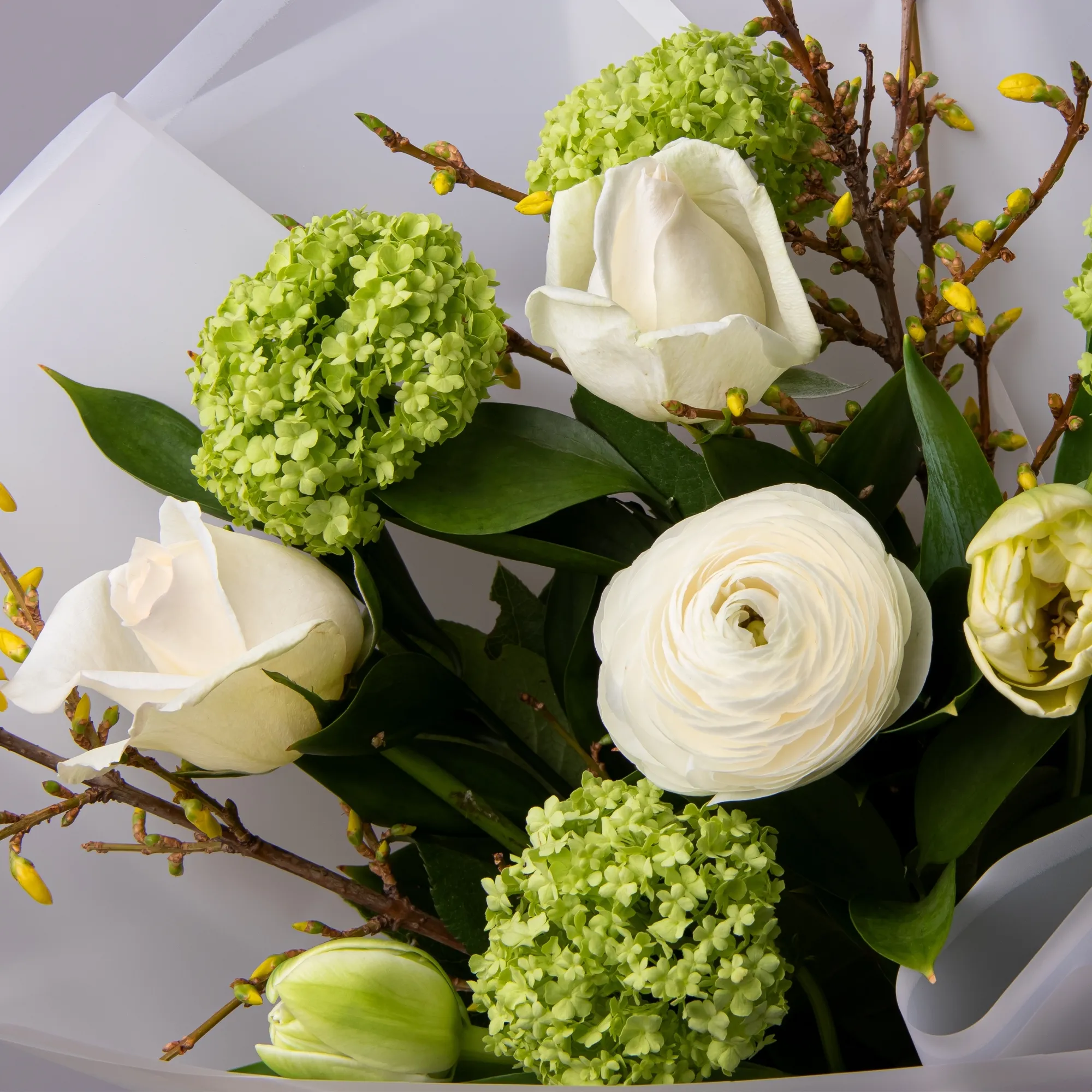 Роза-2, Тюльпан-3, Ранункулюс-1, Листья фисташки-3