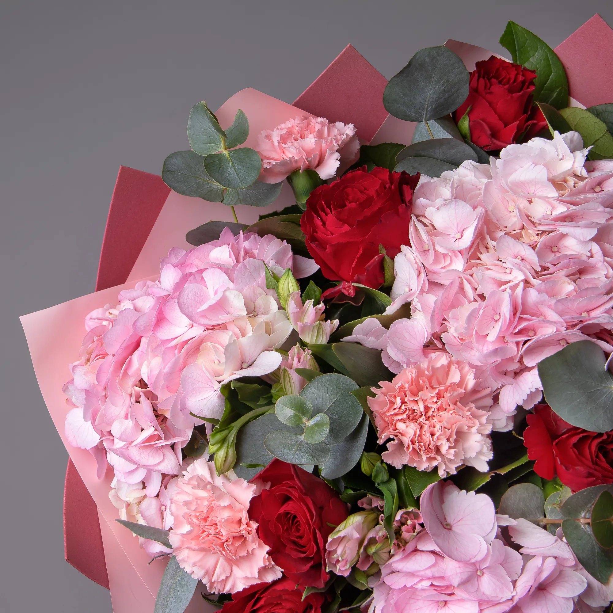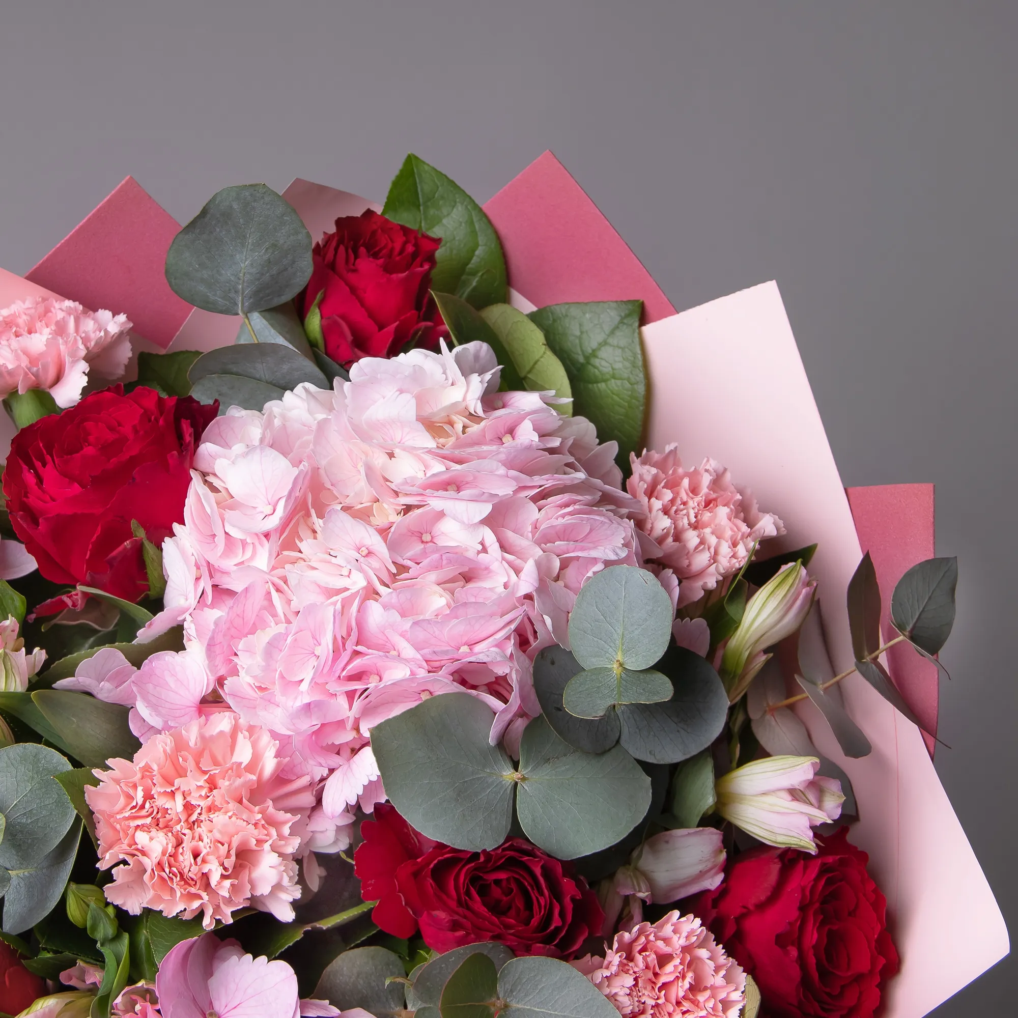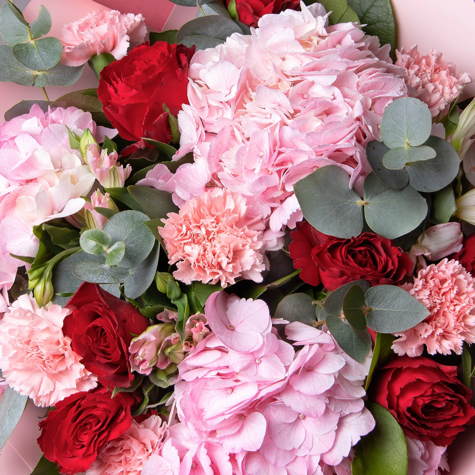 Гвоздика, Гортензия, Роза, Альстромерия, Листья салал, Листья эвкалипта