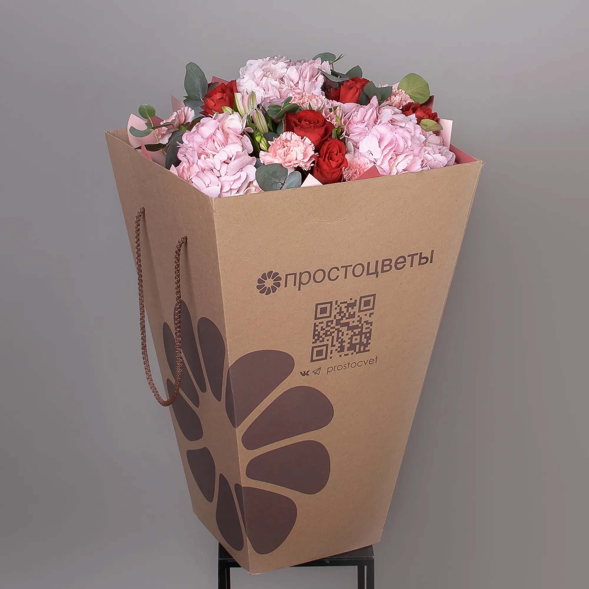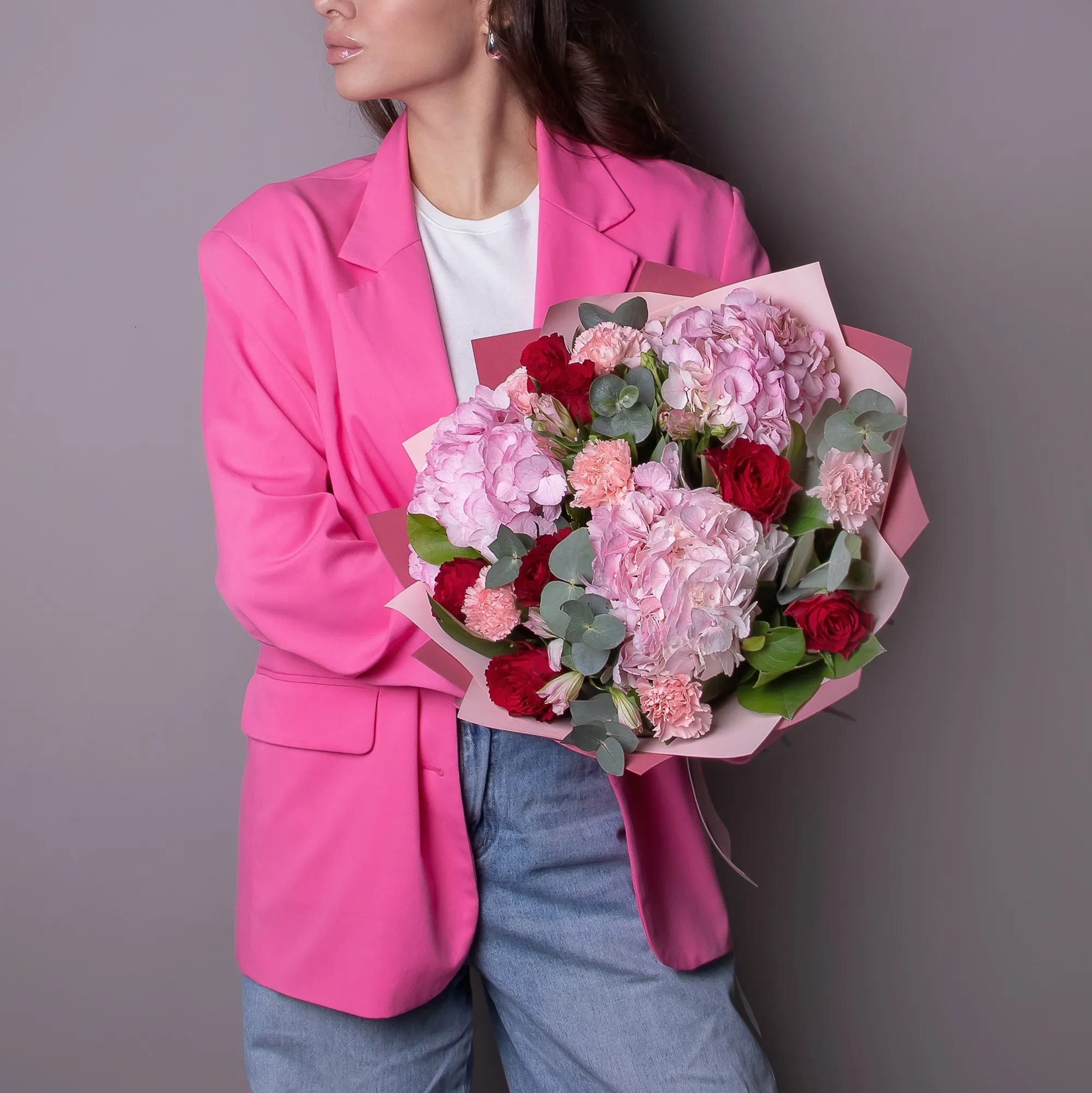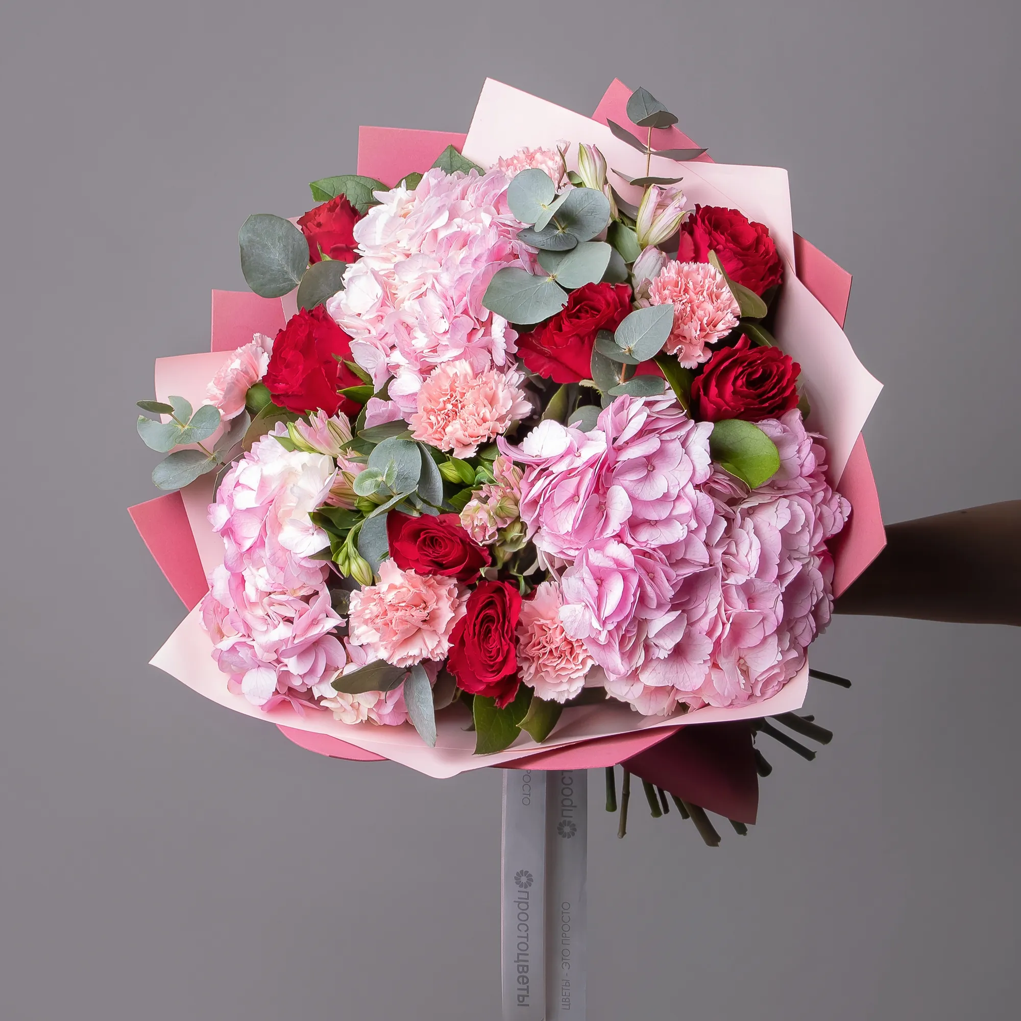 Гвоздика, Гортензия, Роза, Альстромерия, Листья салал, Листья эвкалипта