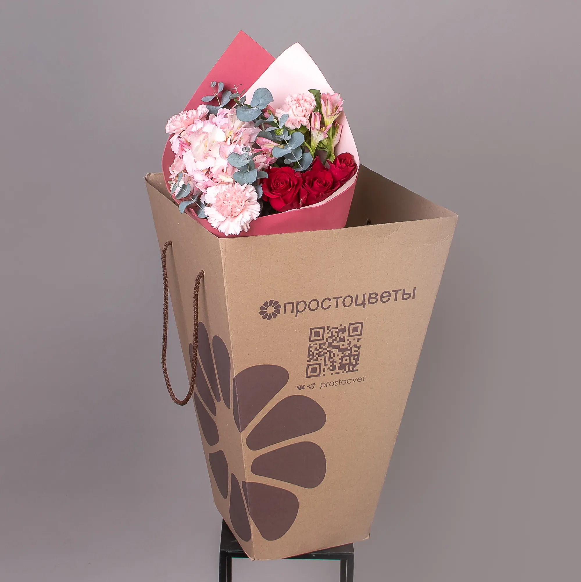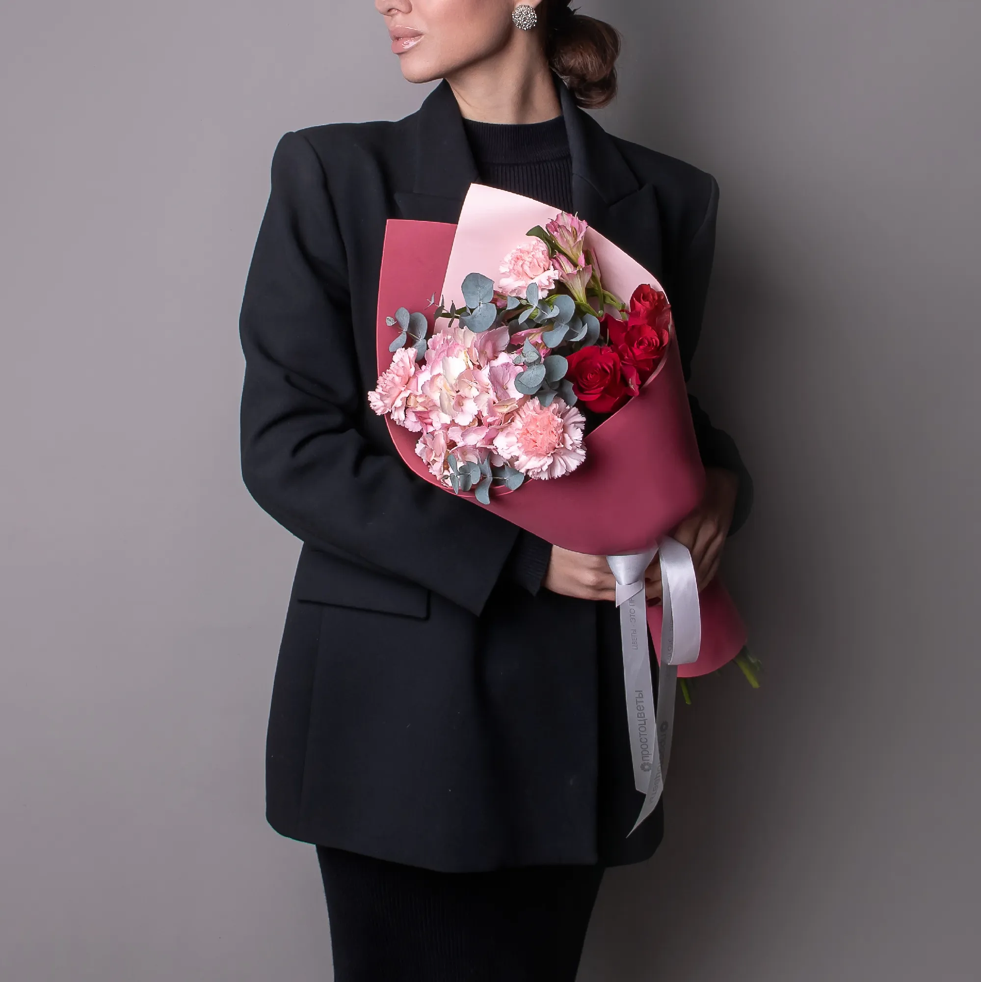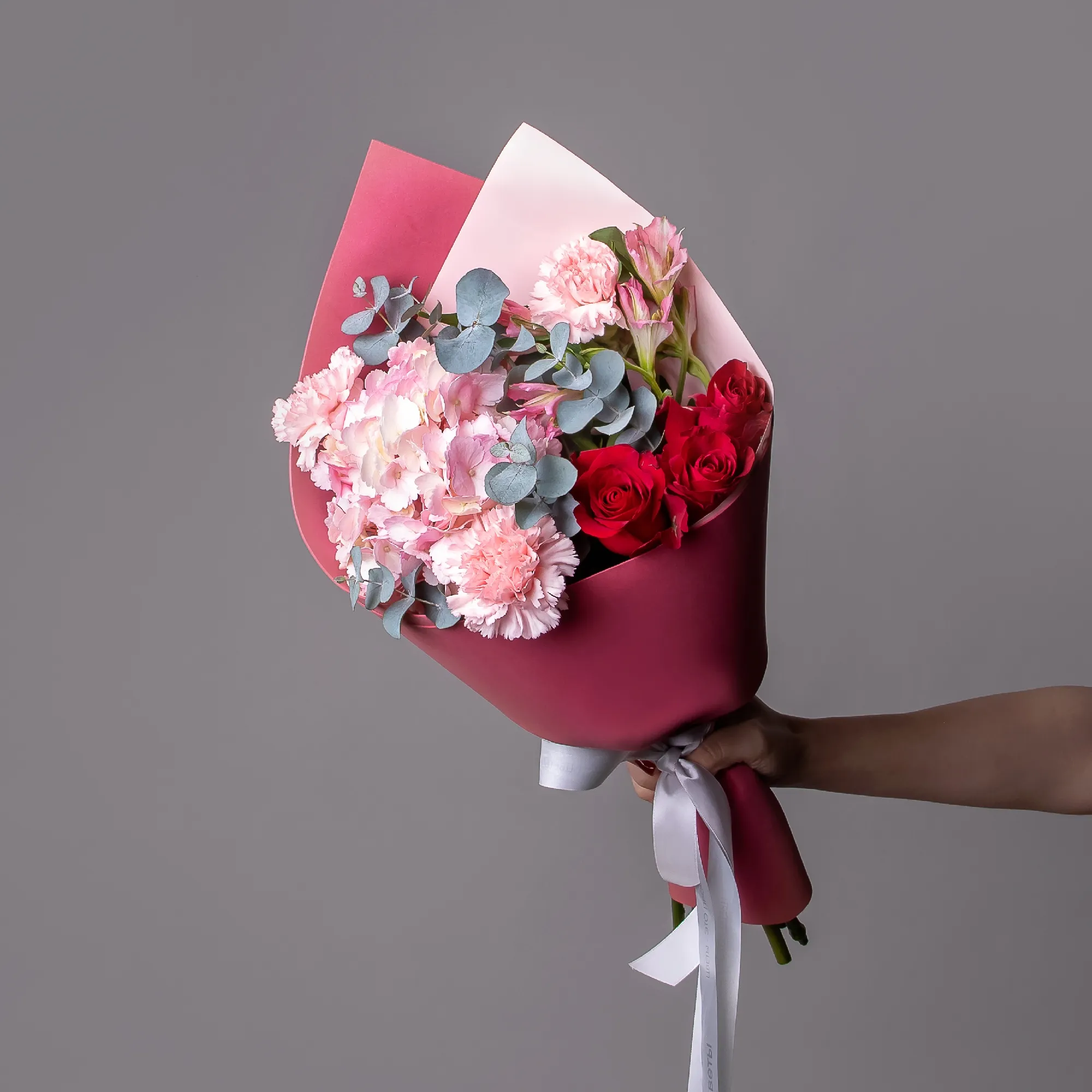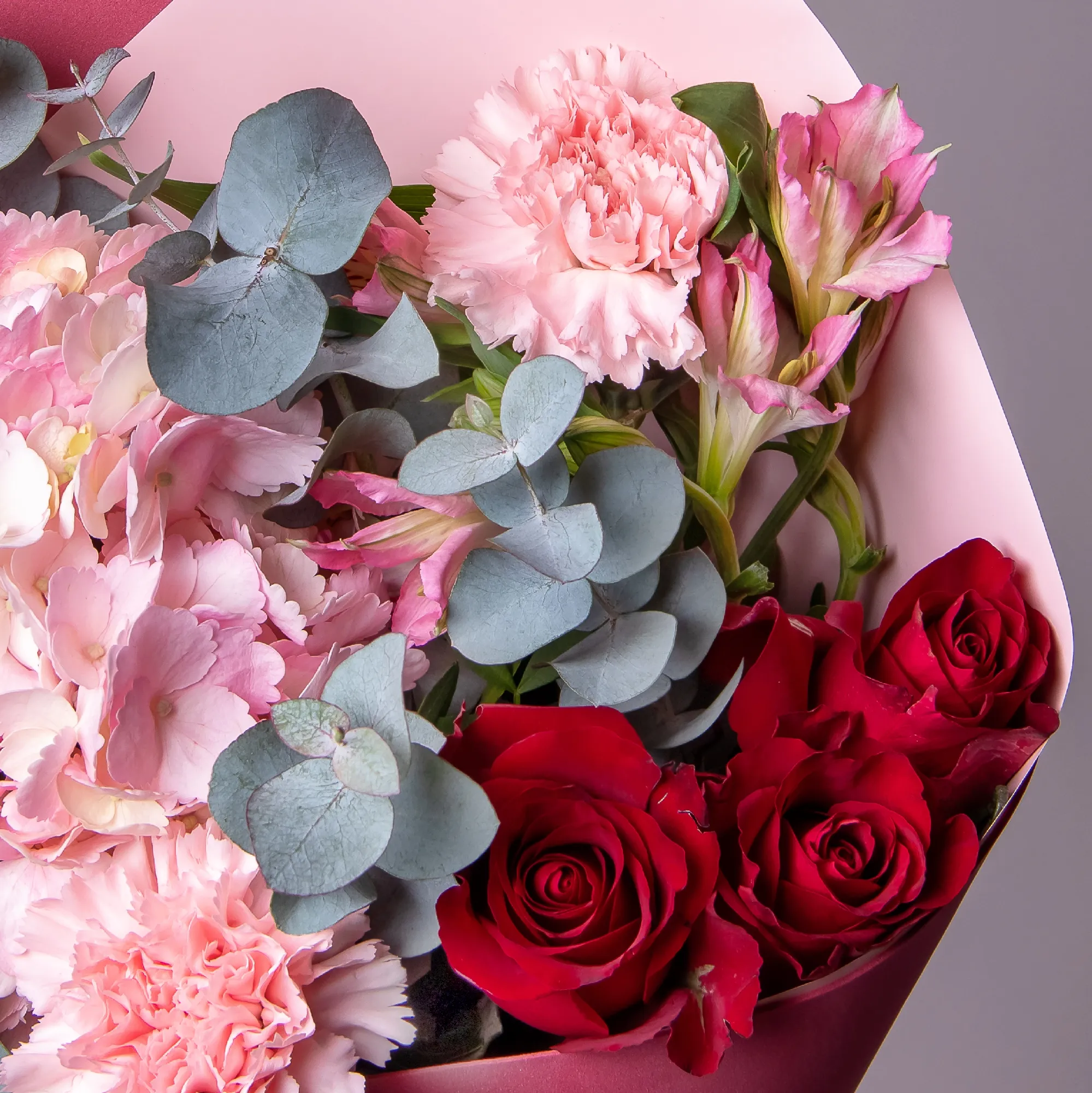 Гвоздика, Гортензия, Роза, Альстромерия, Листья фисташки, Листья эвкалипта