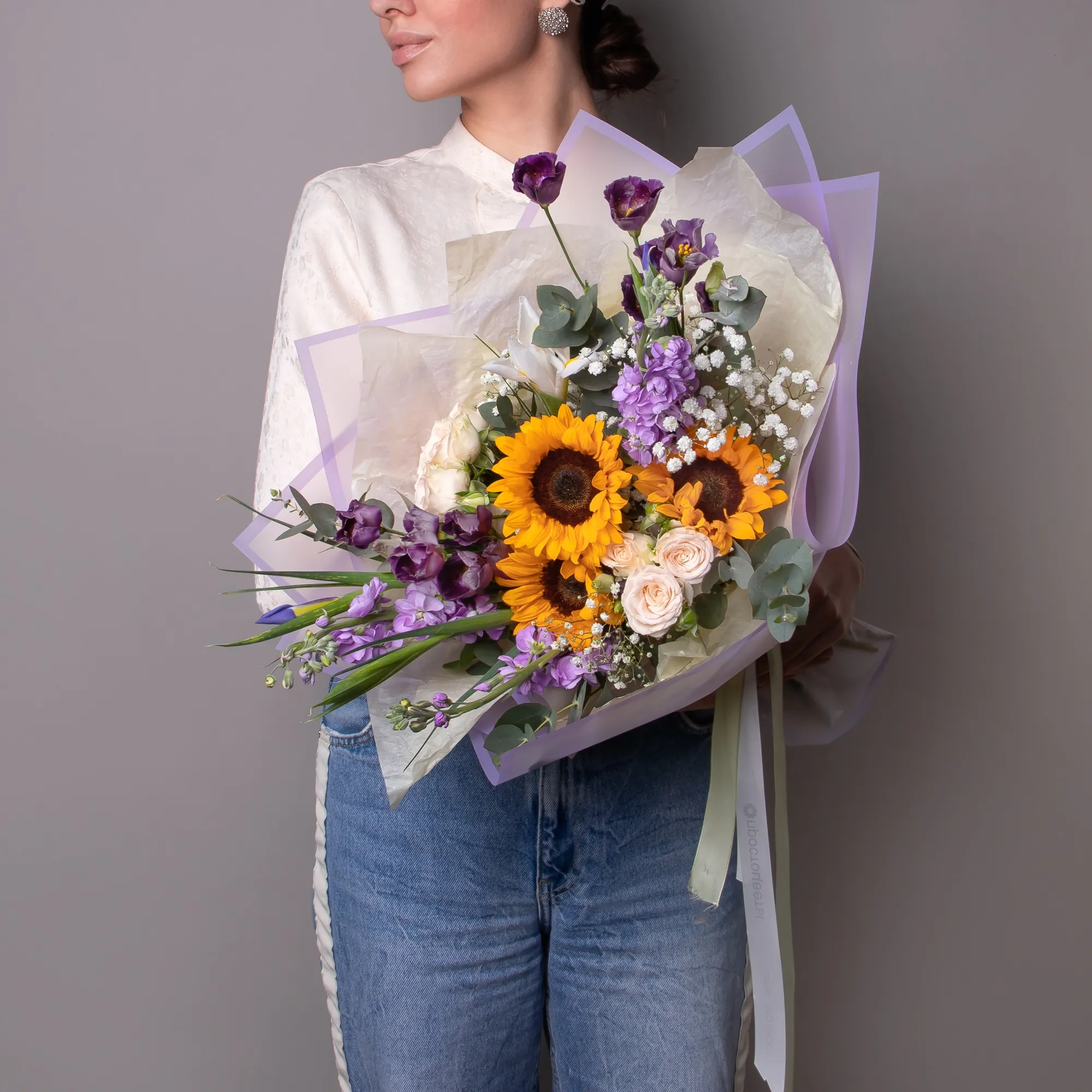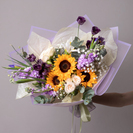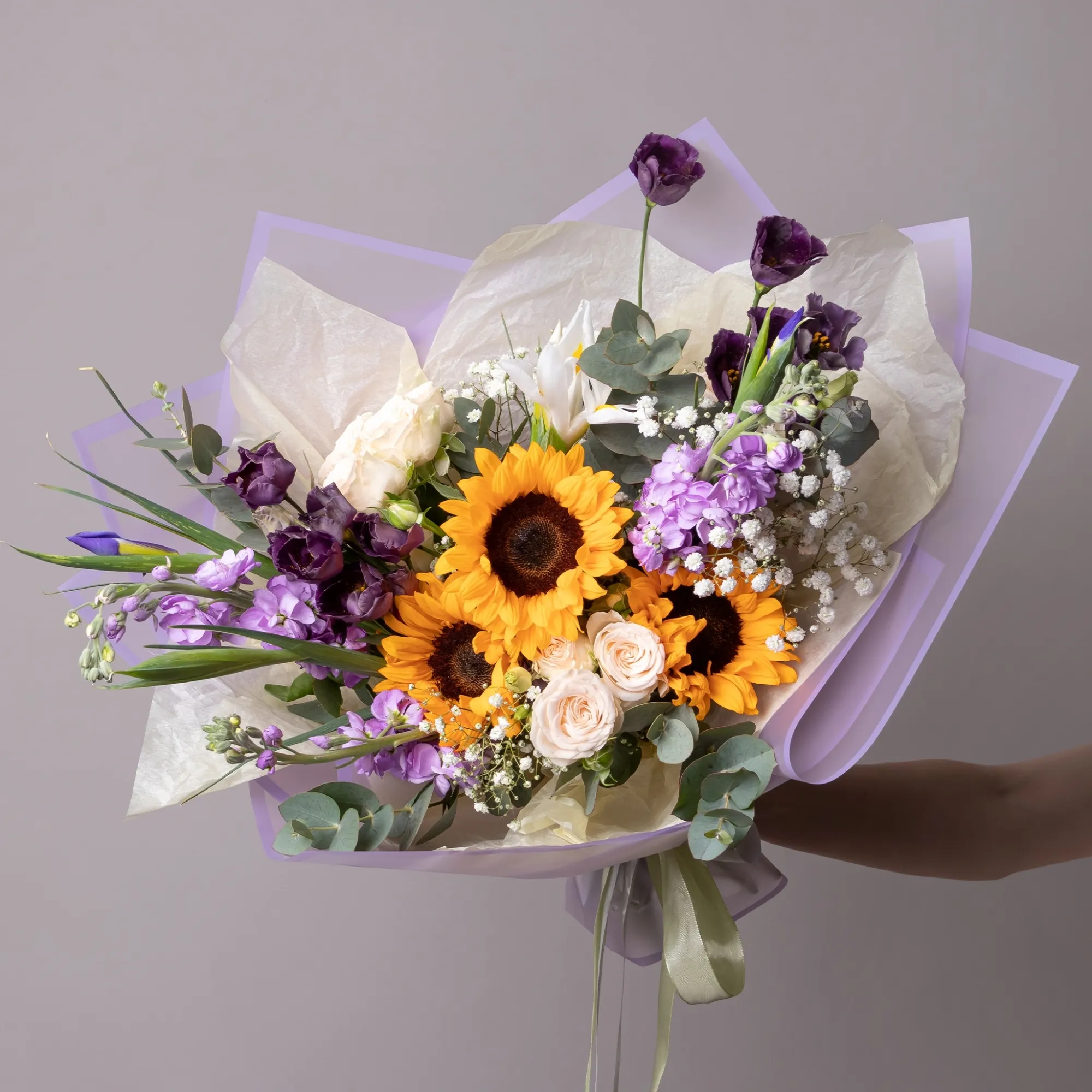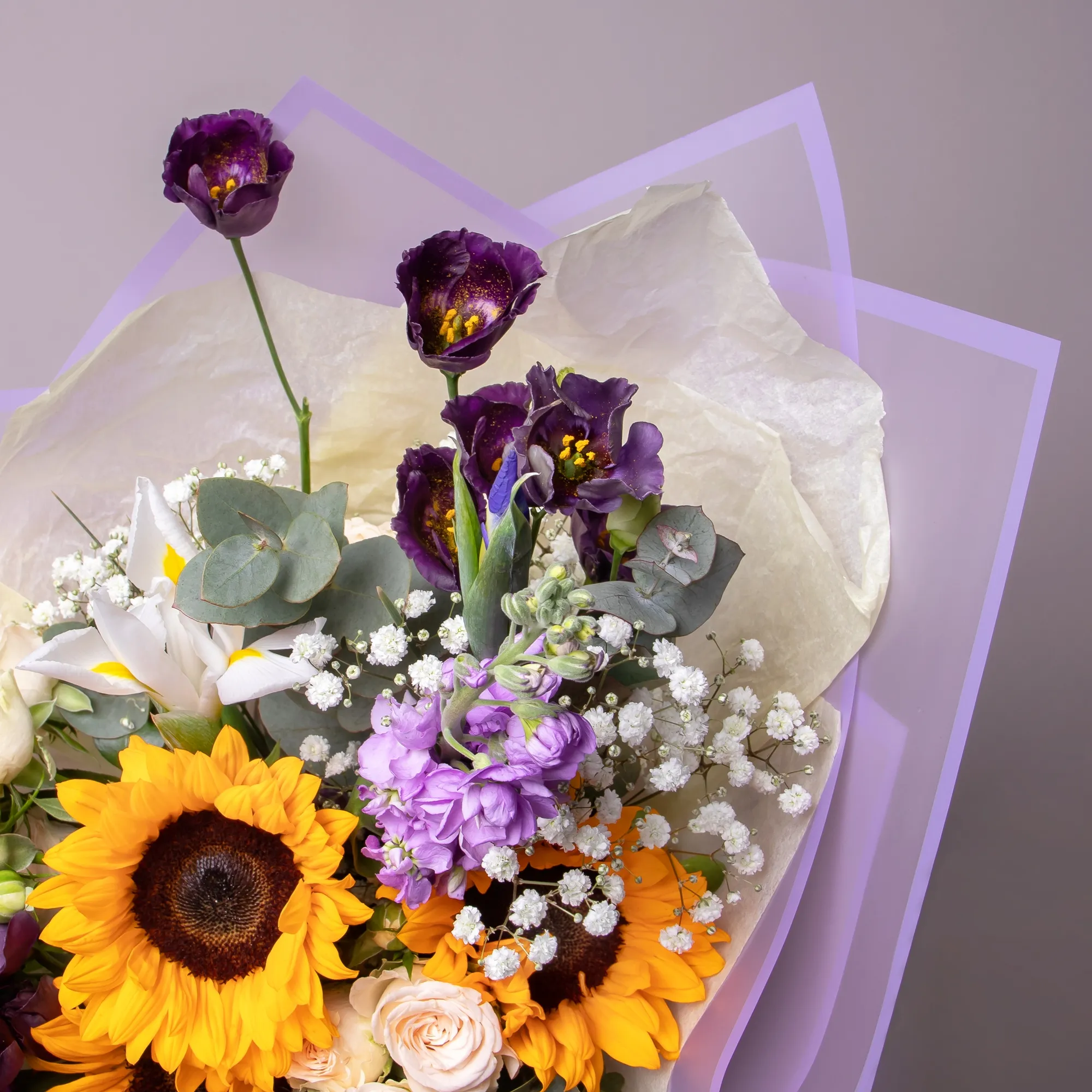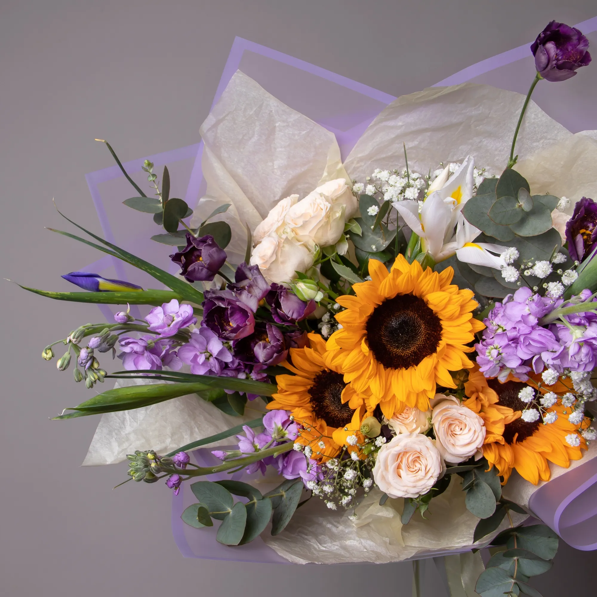 Ирис-5, Подсолнух-3, Маттиола-3, Эустома-2, Роза кустовая-1, Гипсофила-1, Листья эвкалипта-3