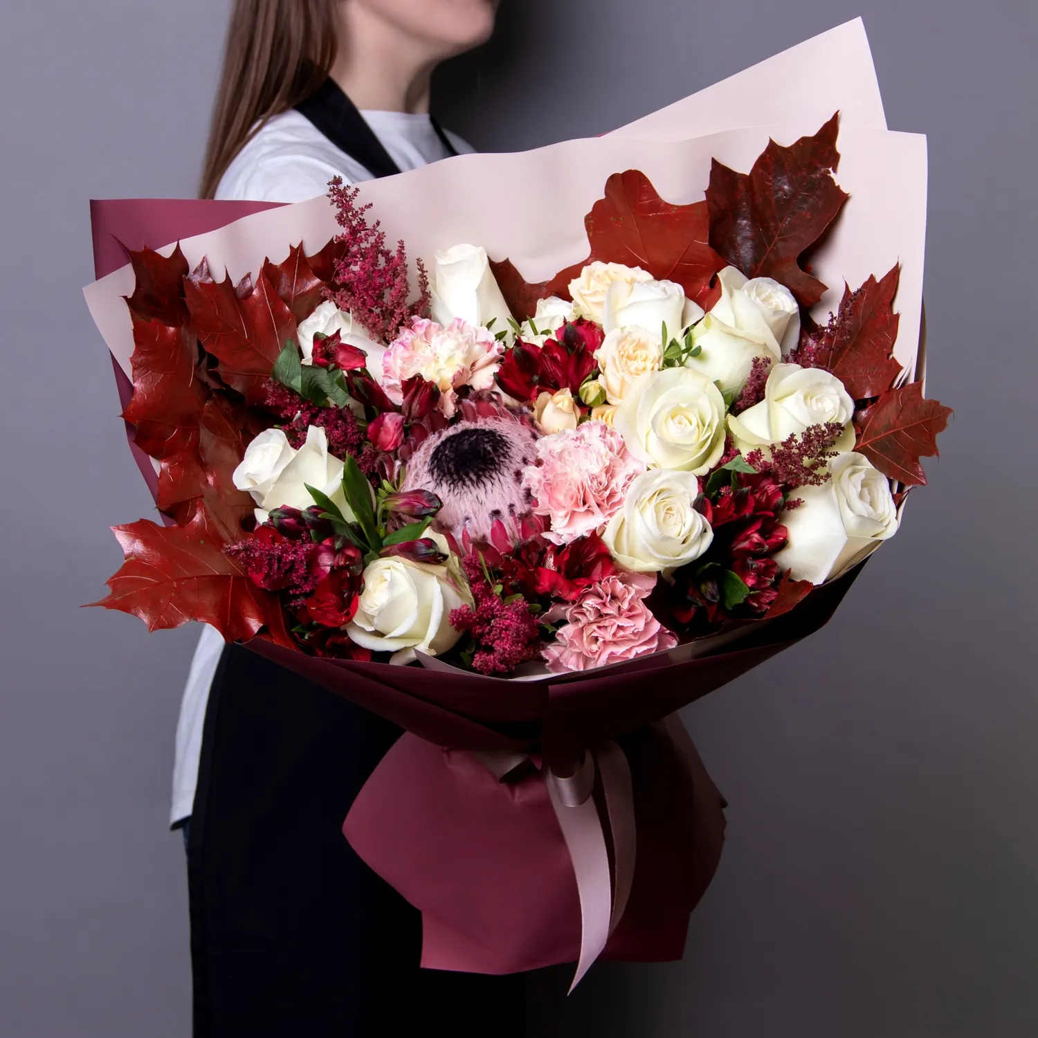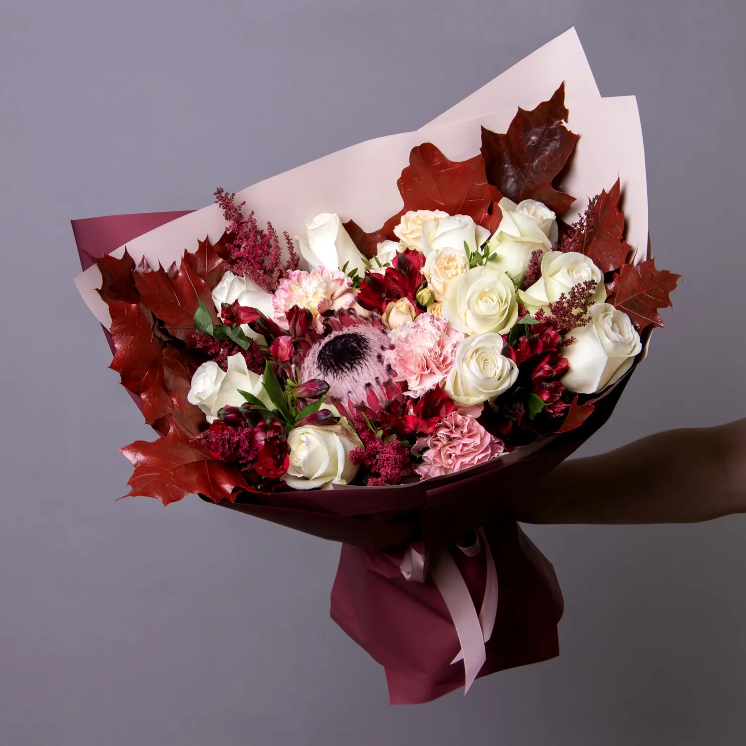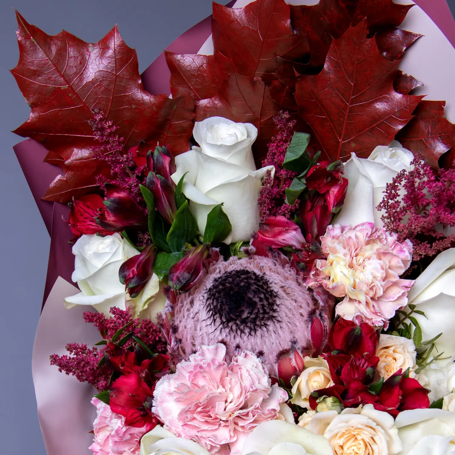 Гвоздика, Роза, Альстромерия, Листья дуба, Листья фисташки
