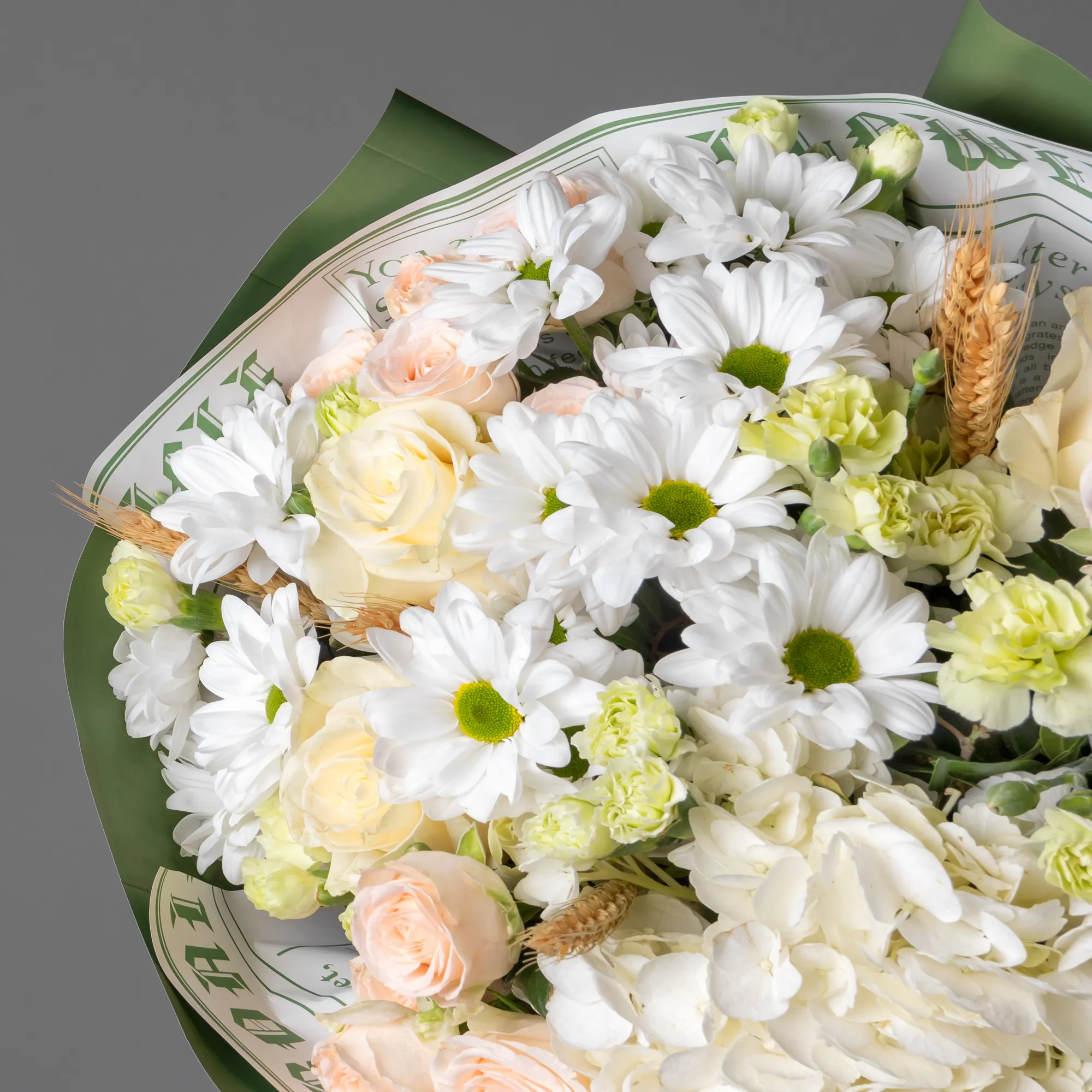 Гвоздика, Гортензия, Роза, Хризантема, Листья фисташки
