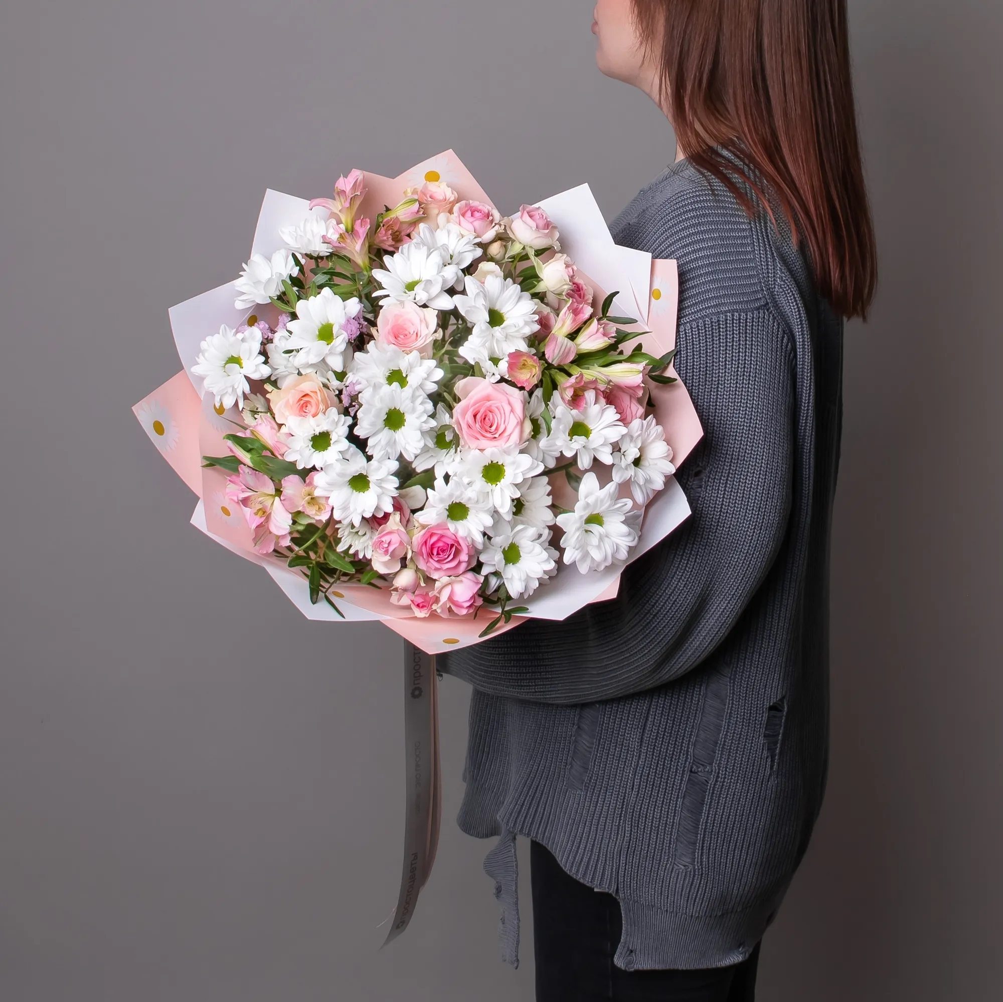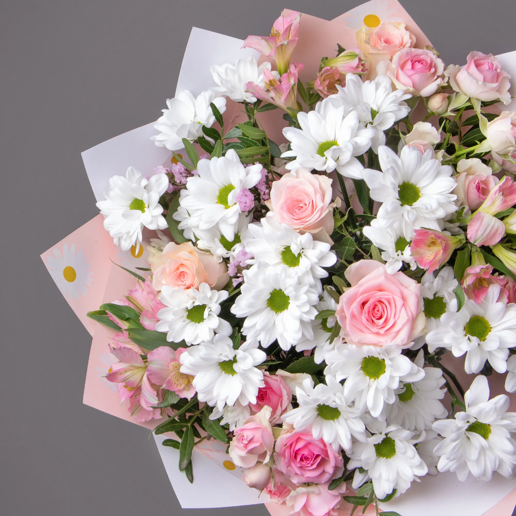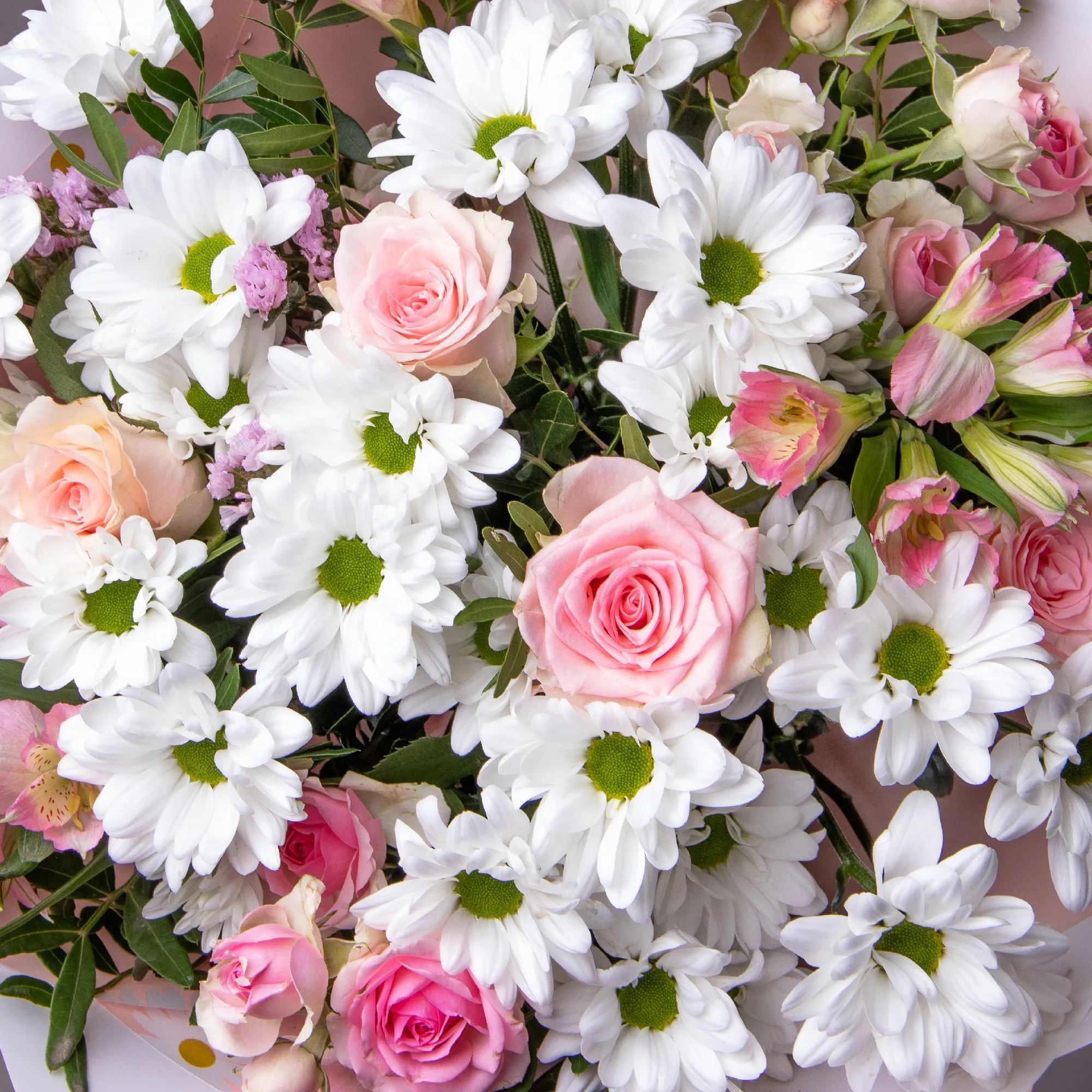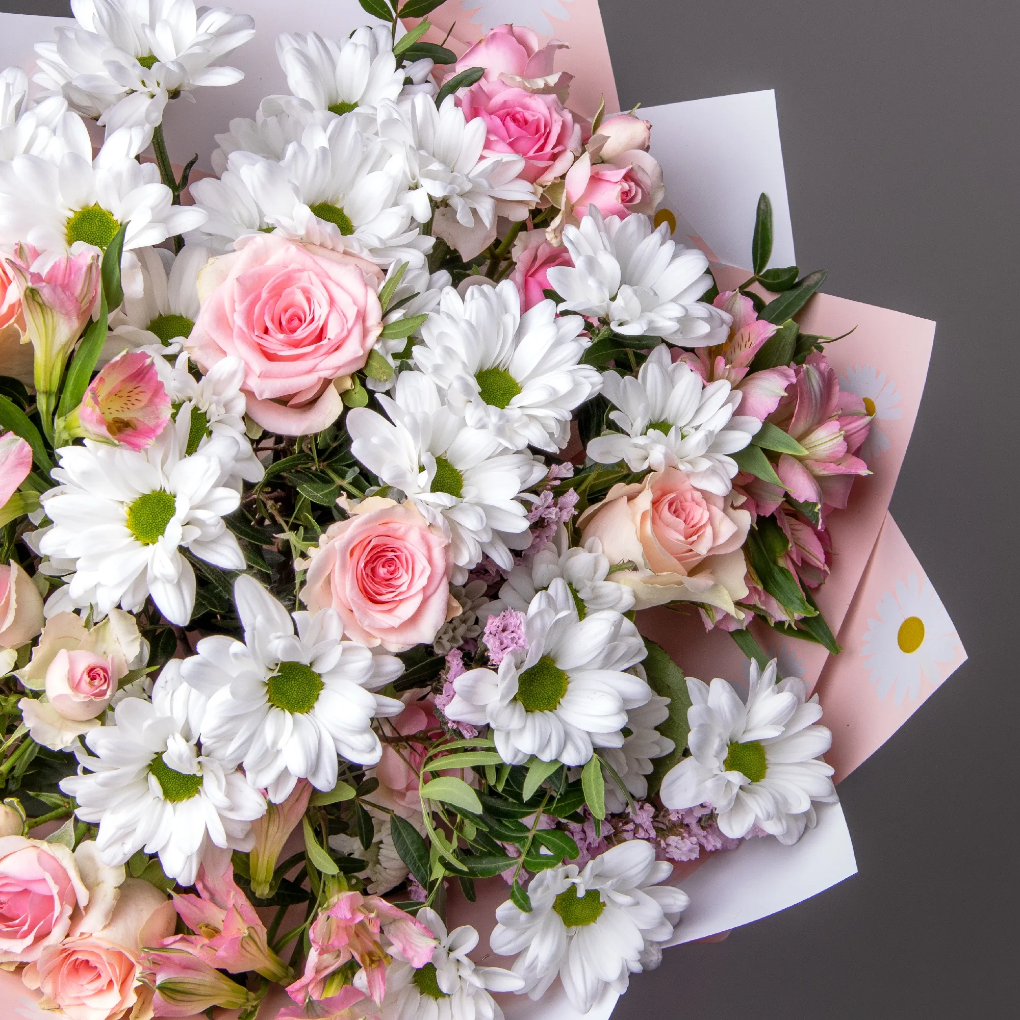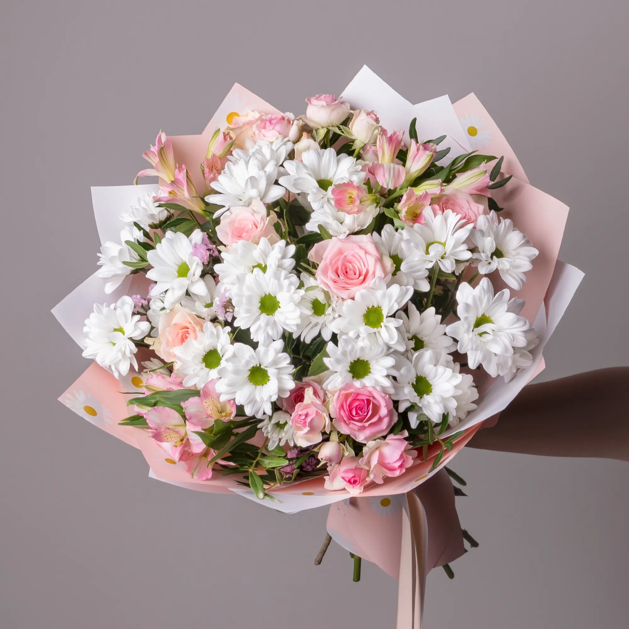 В составе букета "Панакотта M" роза "Фламинго", кустовая роза "Динара", розовая альстромерия, белая кустовая хризантема, розовая статица, дополнен листьями фисташки. Этот букет идеально подойдет для следующих случаев:*День рождения* - нежный розовый букет создаст праздничное настроение и станет отличным подарком для любого возраста, особенно для женственной и романтичной натуры. *Романтическое признание* - изысканная композиция в розовых тонах идеально подойдет для выражения чувств, признания в любви или предложения руки и сердца. Закажите букет с доставкой или заберите самовывозом. И помните, что цветы - это просто.