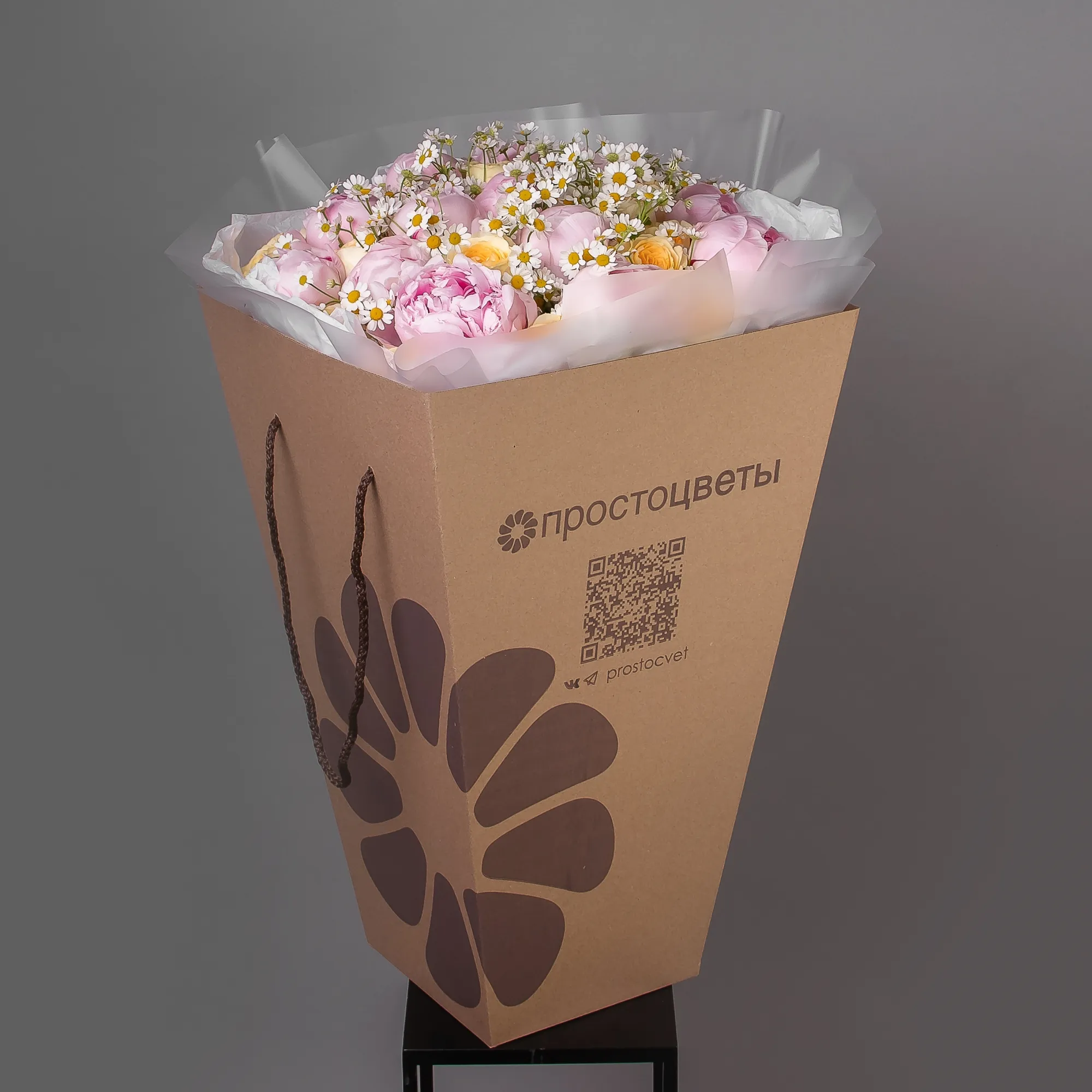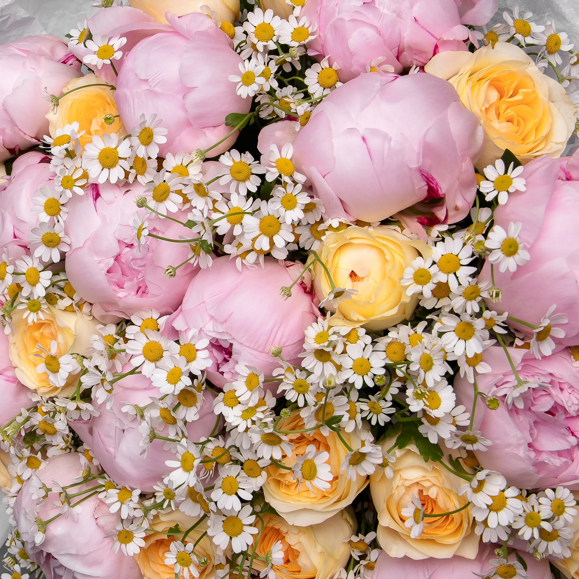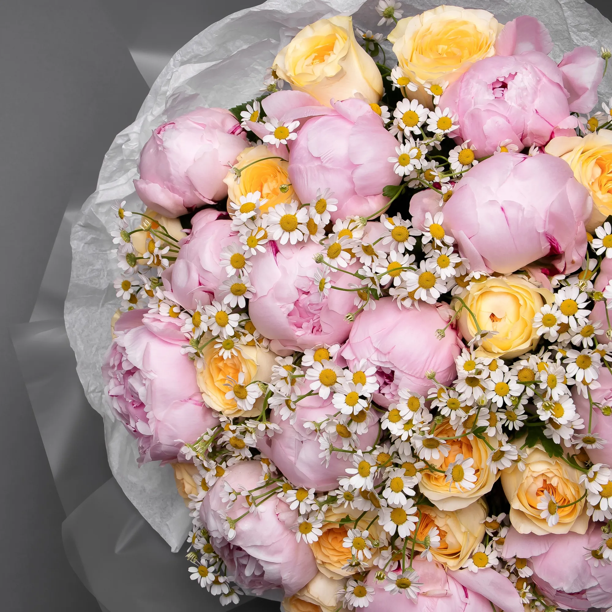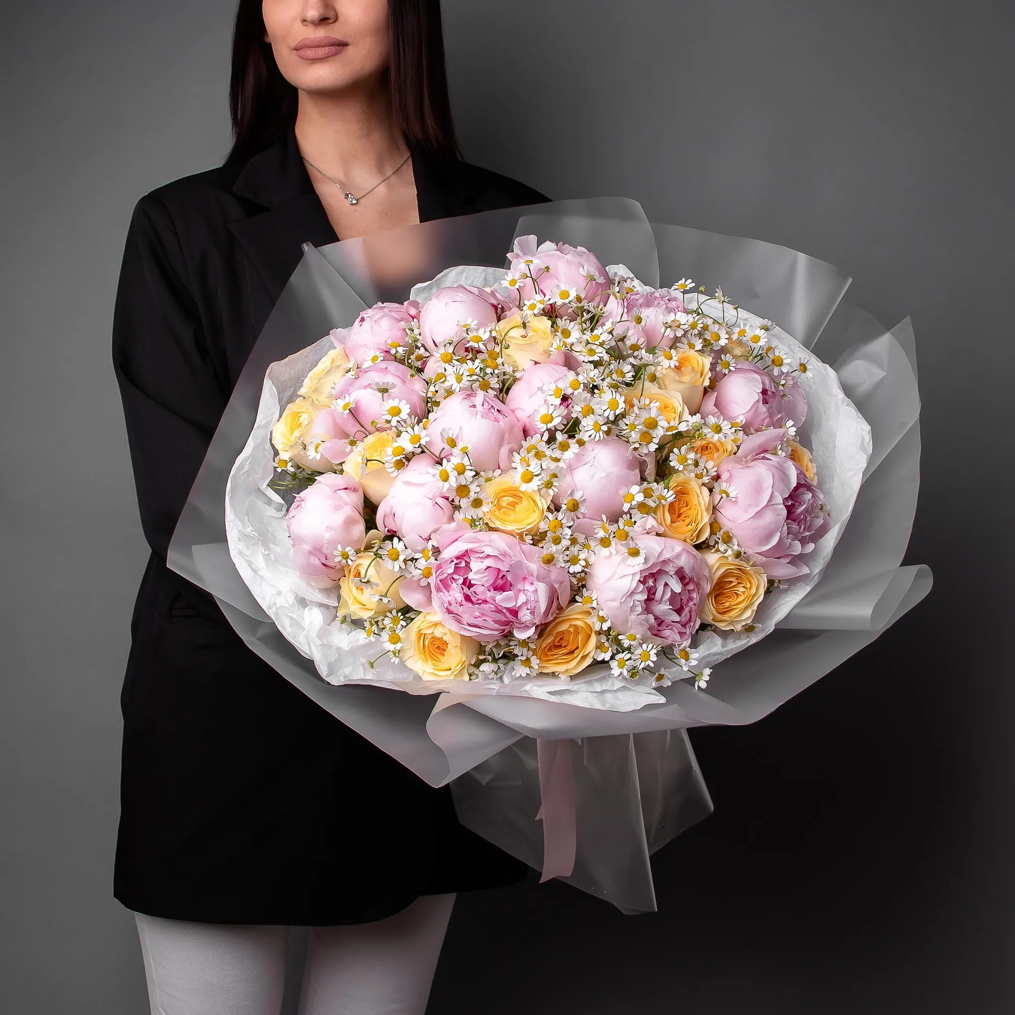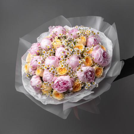 Сочетание лимонных пионовидных роз и нежных розовых пионов, завернутых в воздушную упаковку и подчеркнутых летним настроением ромашки - создает универсальный и необычный букет "Персеида", который отлично подойдет на юбилей, и будет к месту в профессиональный праздник.