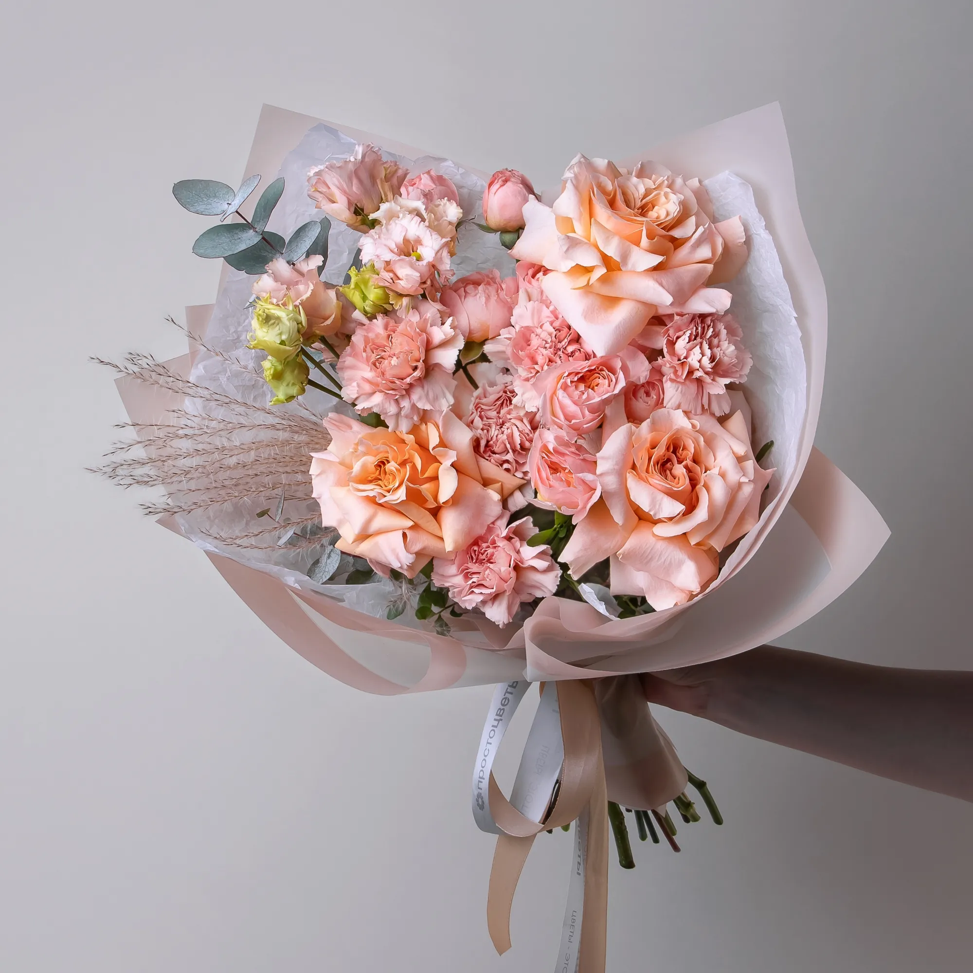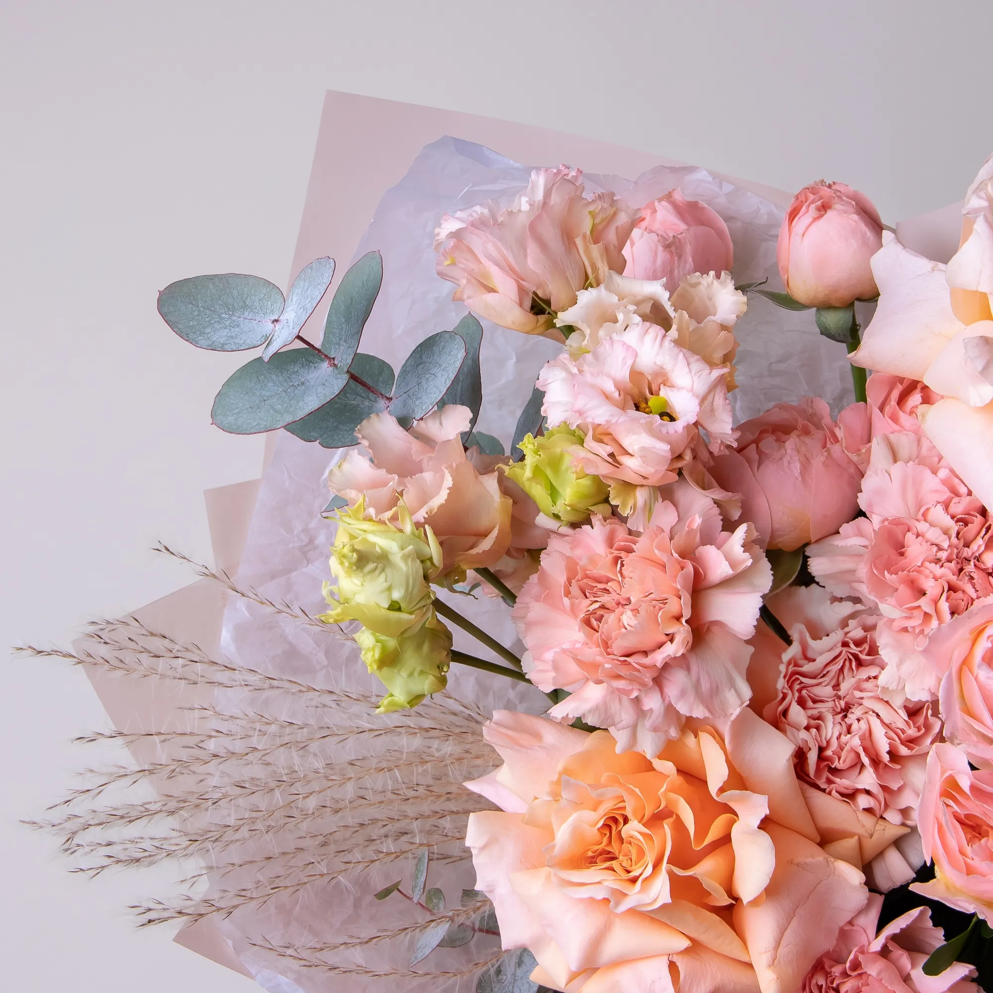 Гвоздика-5, Роза-3, Эустома-2, Роза кустовая-2, Листья фисташки-5, Листья эвкалипта-1