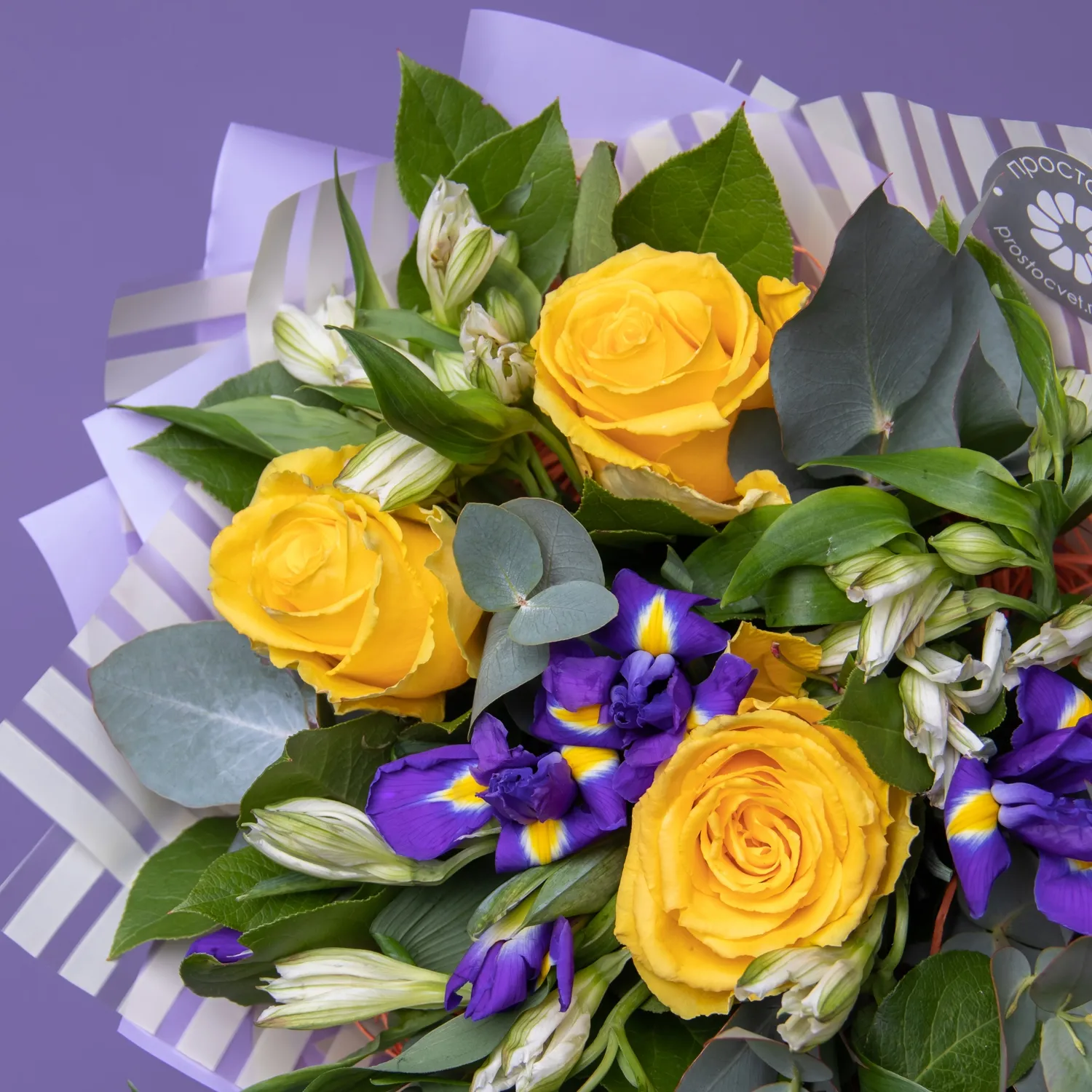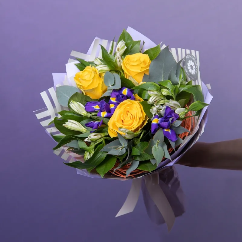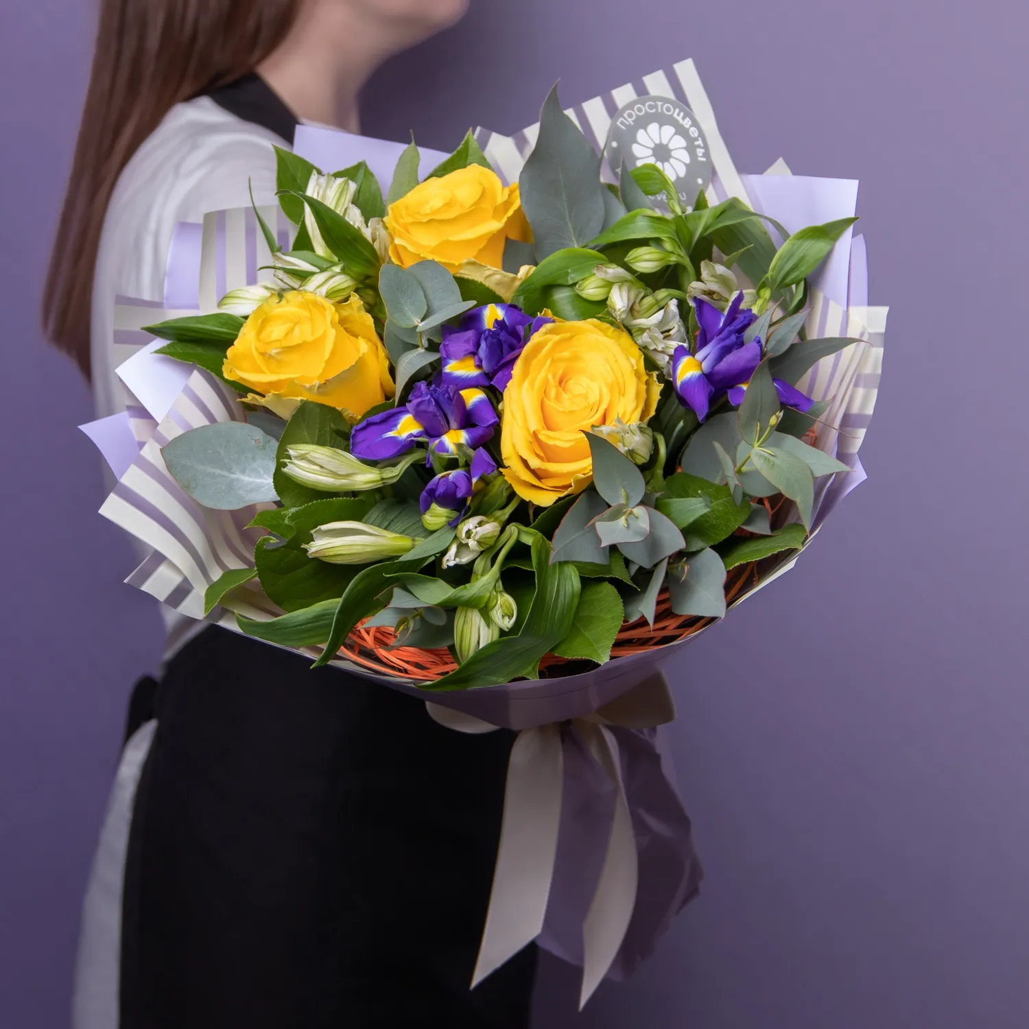 Свежее лимонно-желтое настроение дарят изящные розы, притаившиеся среди величественных синих ирисов. Удивительное и яркое сочетание, которое дарит заряд отличного настроения и незабываемые воспоминания.