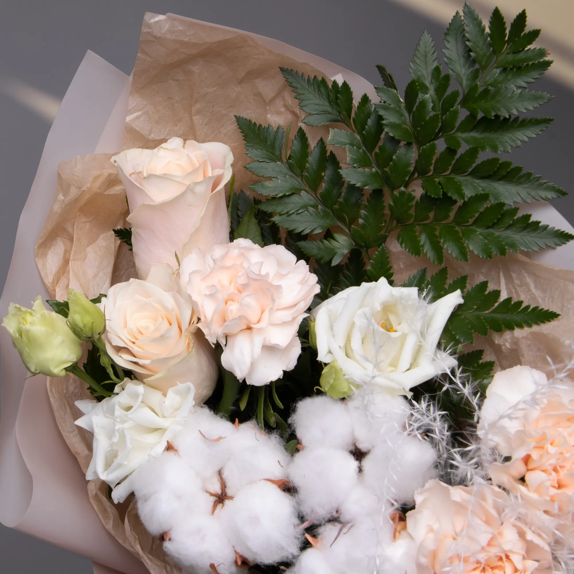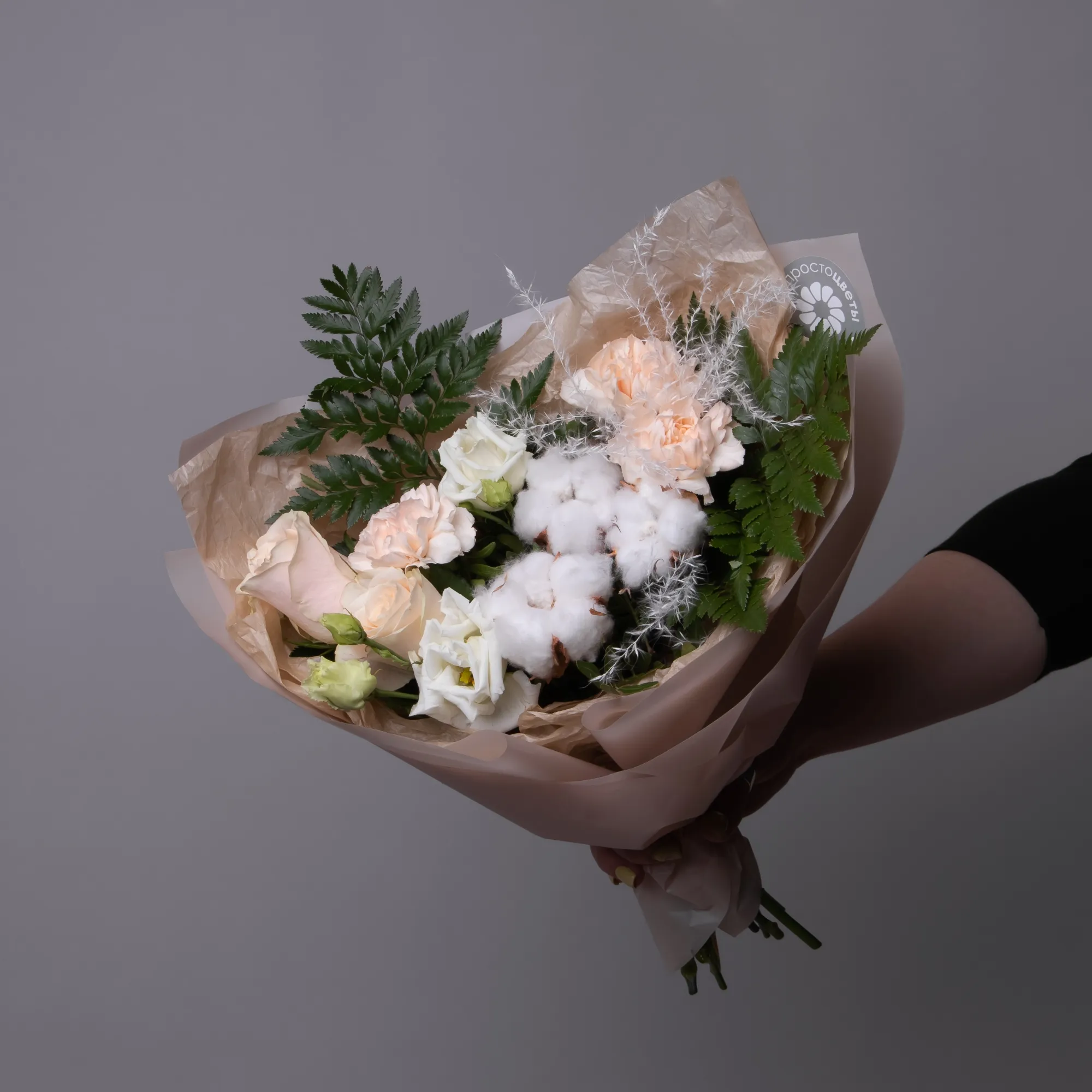 Гвоздика-3, Роза-2, Эустома-1, Хлопок-3, Листья папоротника-2, Листья фисташки-3