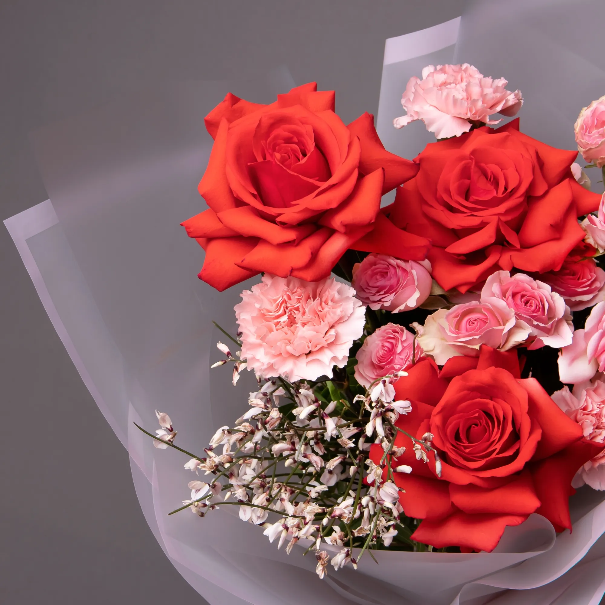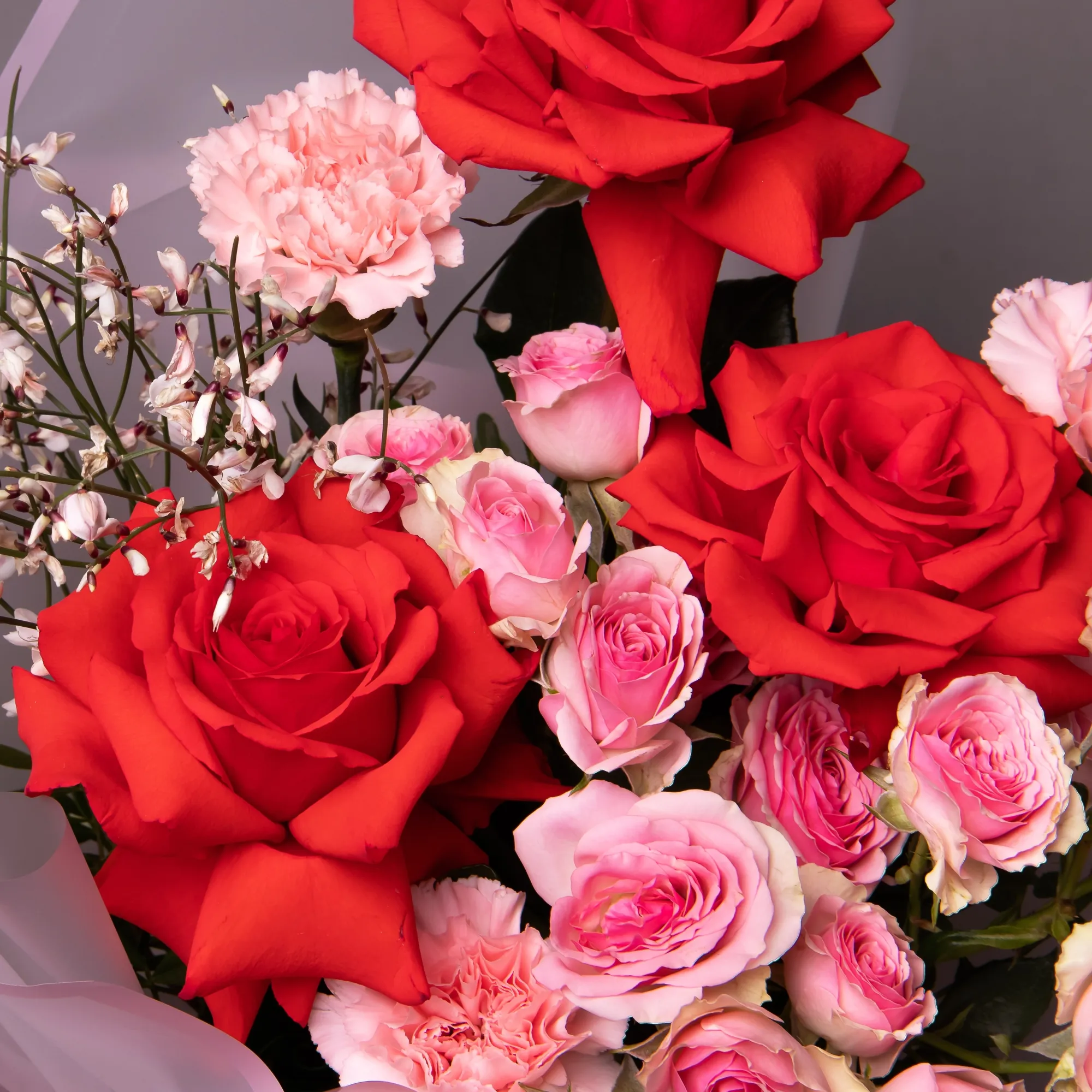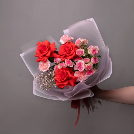 В составе букета "Поцелуй любви S" кустовая роза "Динара", розовая гвоздика, розовая гениста, роза "Нина", дополнен листьями фисташки. Этот букет идеально подойдет для следующих случаев: *День святого Валентина* - романтичная композиция в розовых тонах идеально подойдет для выражения любви и нежности в самый подходящий для этого праздник. *Предложение руки и сердца* - букет с символическим названием и чувственной цветовой гаммой станет прекрасным дополнением к самому важному моменту в отношениях