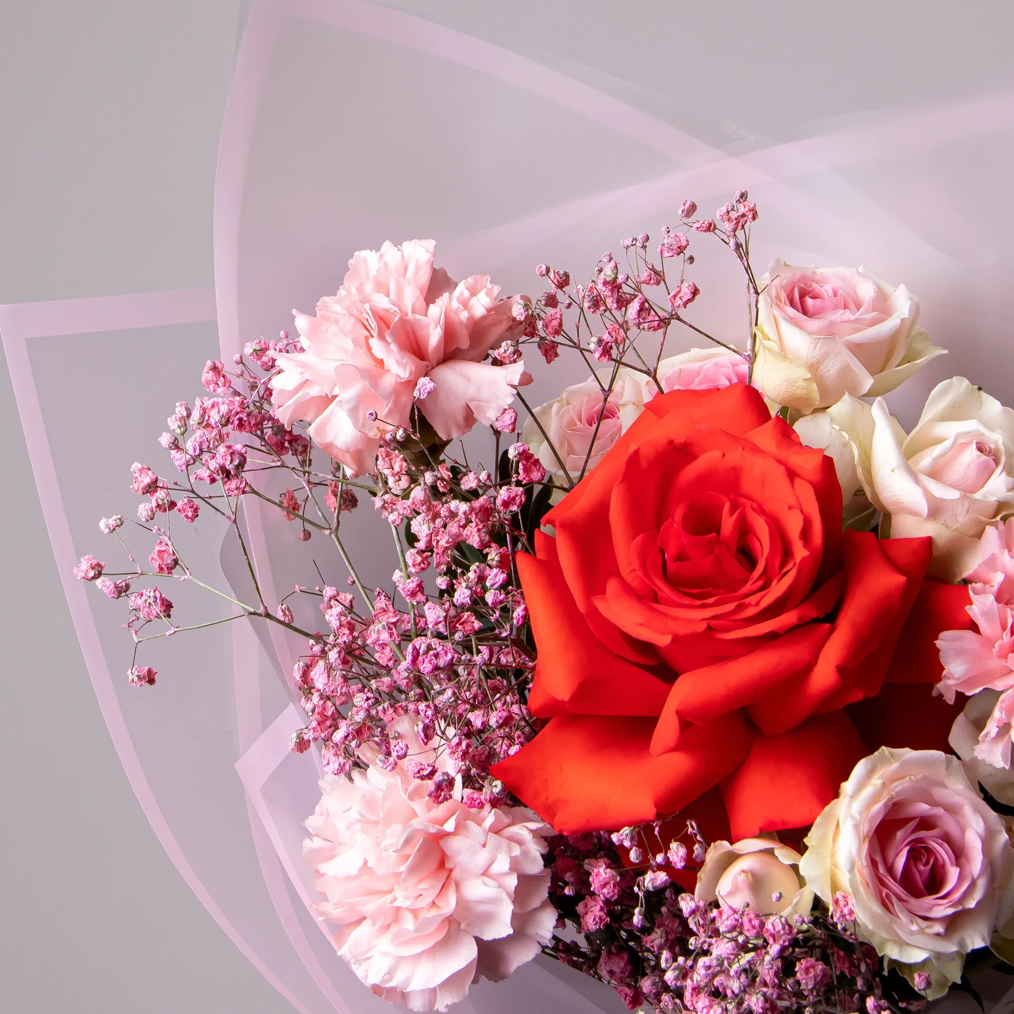 Гвоздика, Роза, Гипсофила, Листья фисташки