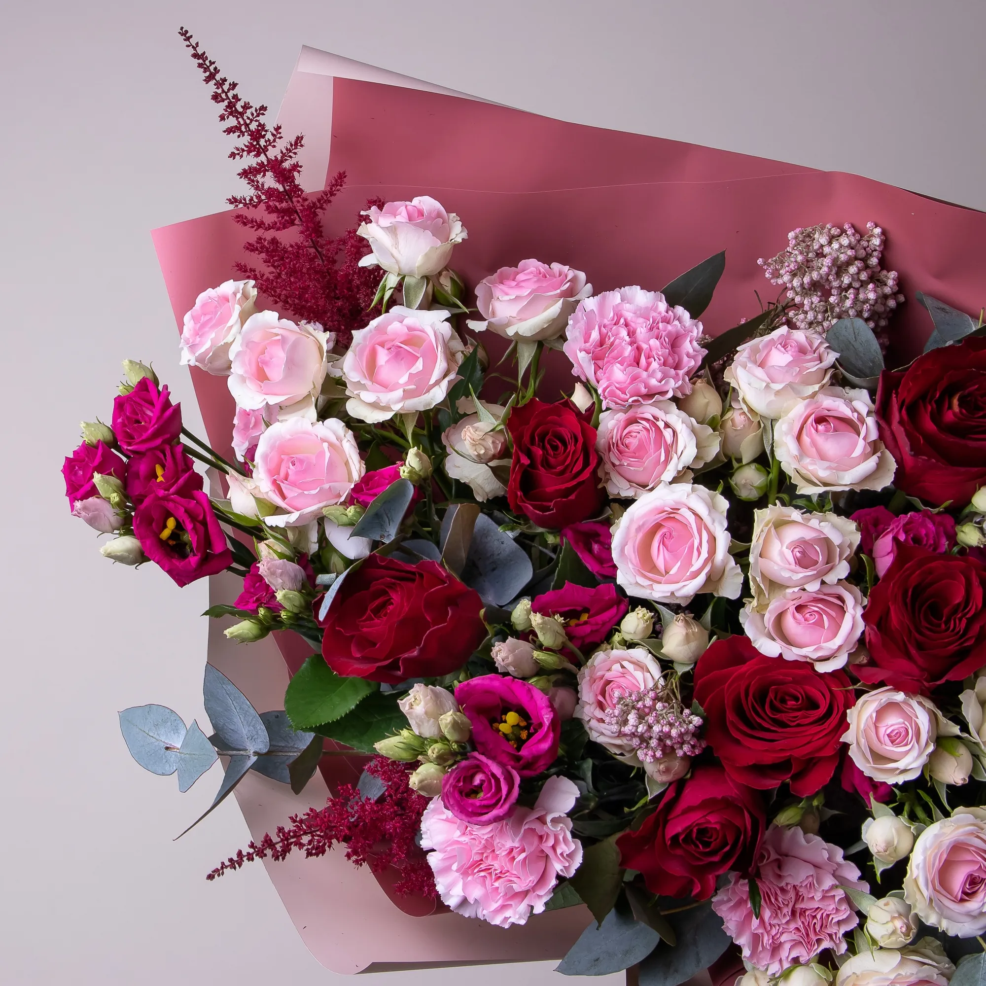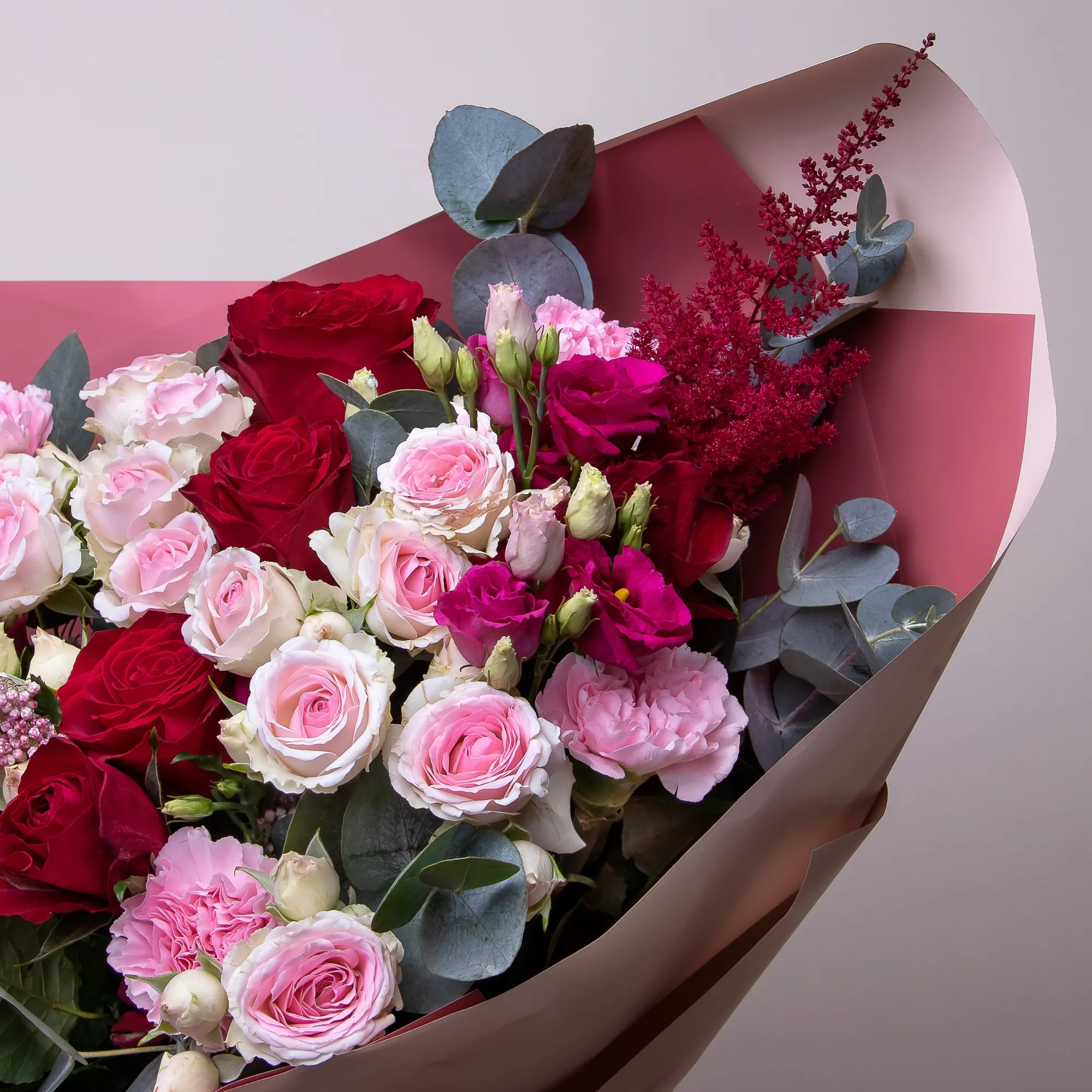 Гвоздика-5, Роза-7, Эустома-3, Роза кустовая-3, Листья фисташки-7, Листья эвкалипта-3
