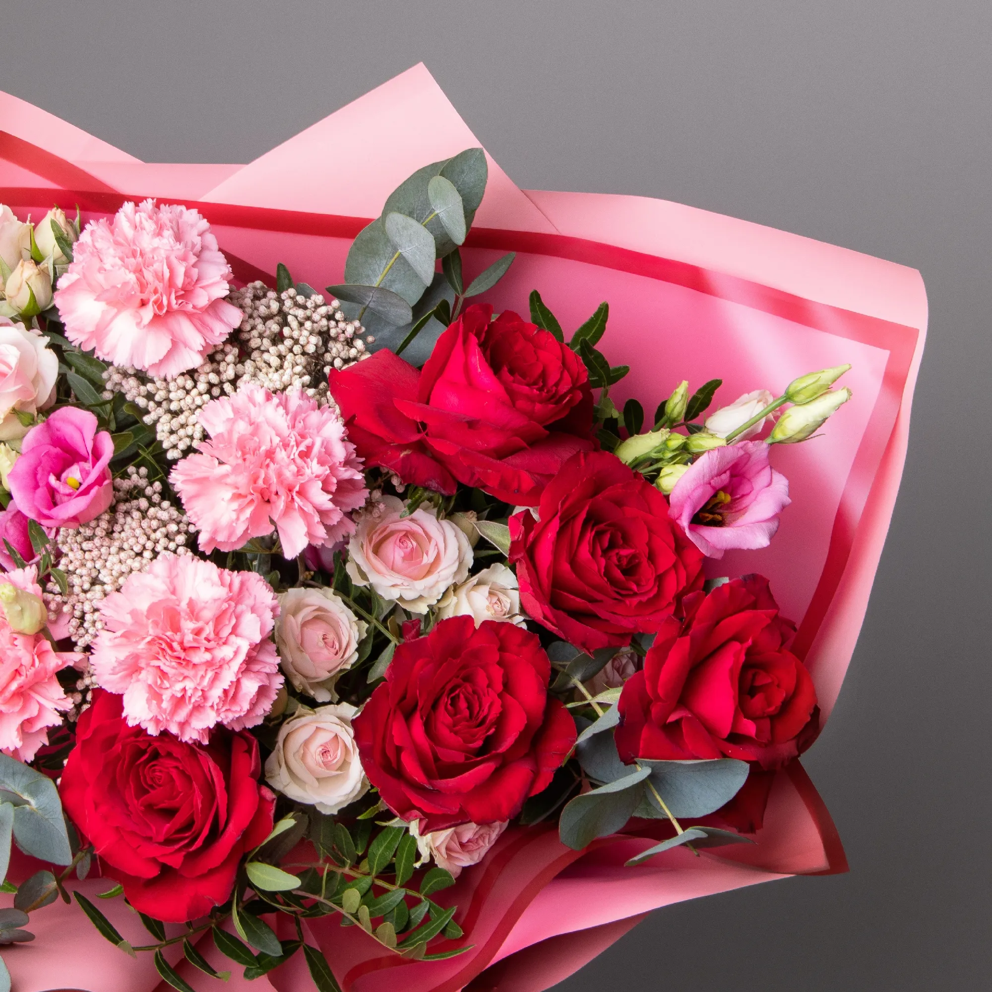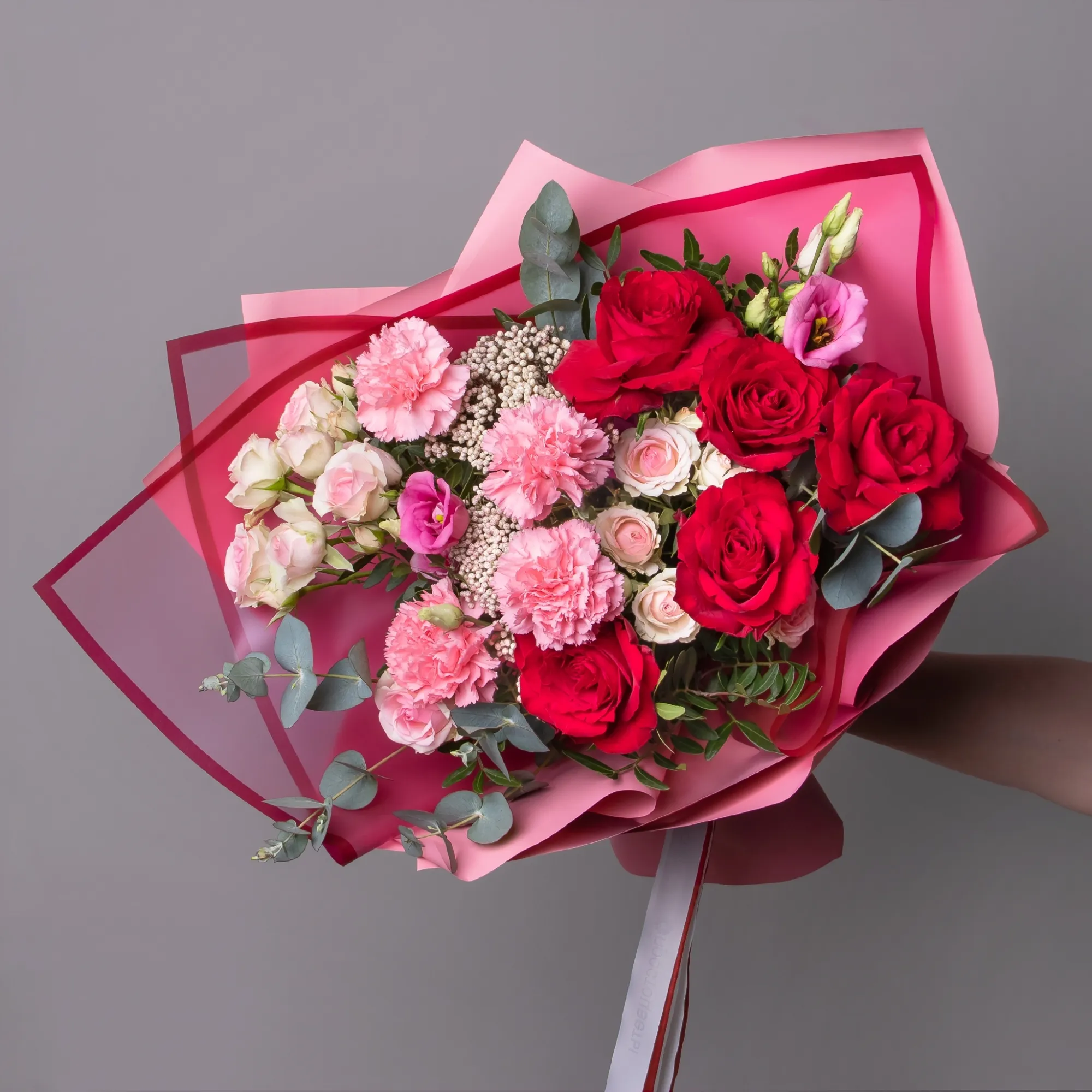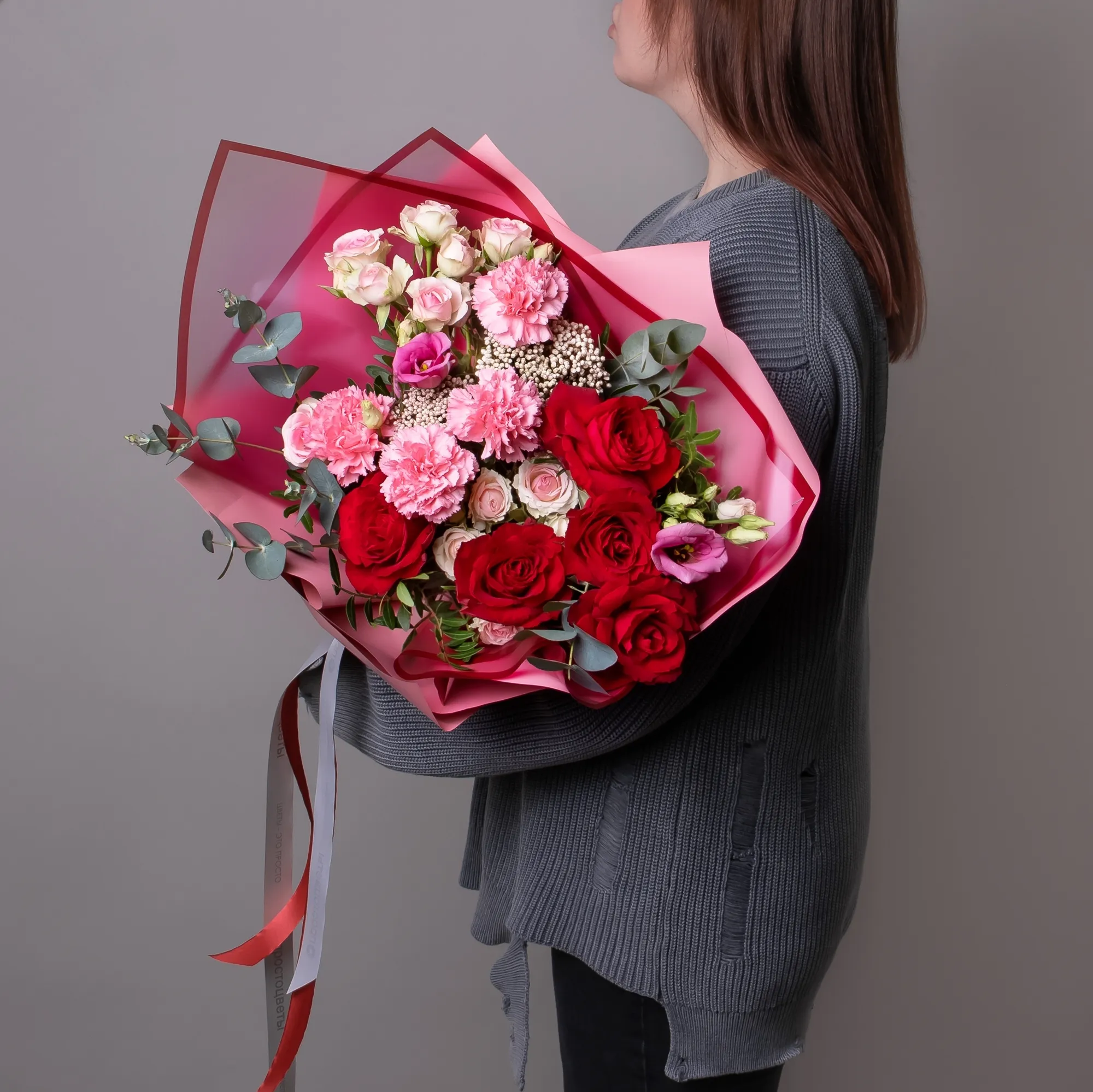 В составе букета "Прима" в размере М красная роза сорта "Мадам ред", розовый лизиантус, кустовая роза "Динара", розовый озотамнус и розовая гвоздика. Букет дополнен листьями фисташки и эвкалипта.
