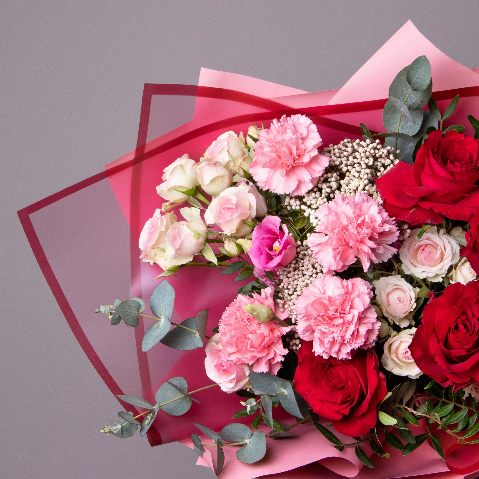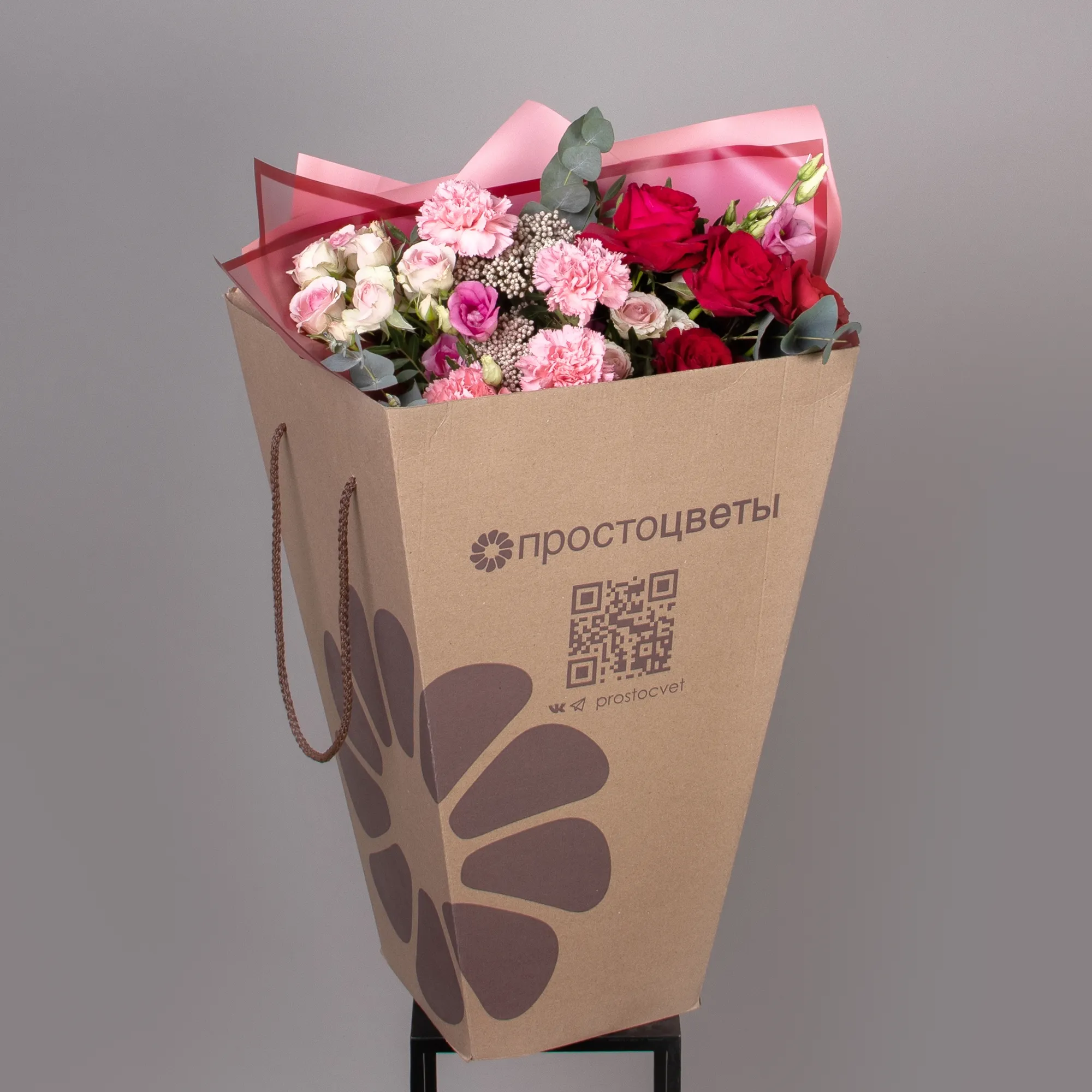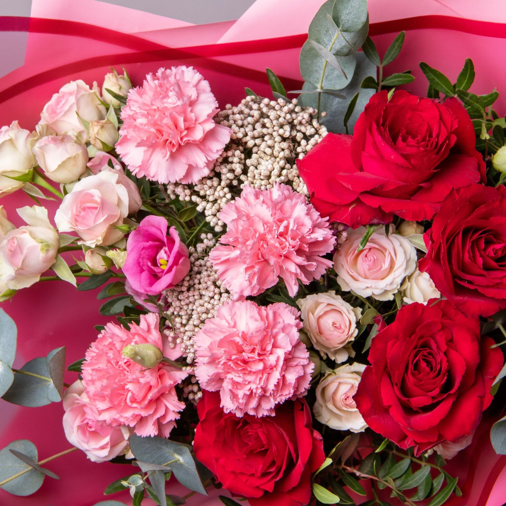 В составе букета "Прима" в размере М красная роза сорта "Мадам ред", розовый лизиантус, кустовая роза "Динара", розовый озотамнус и розовая гвоздика. Букет дополнен листьями фисташки и эвкалипта.