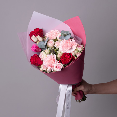 Гвоздика-3, Роза-3, Эустома-1, Роза кустовая-1, Листья фисташки-2, Листья эвкалипта-1