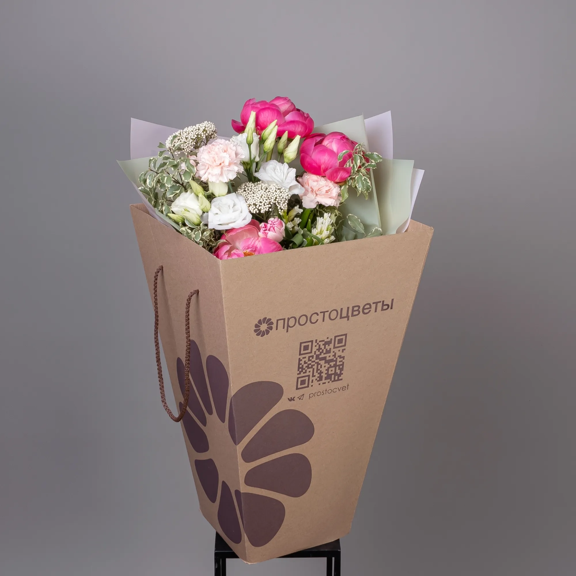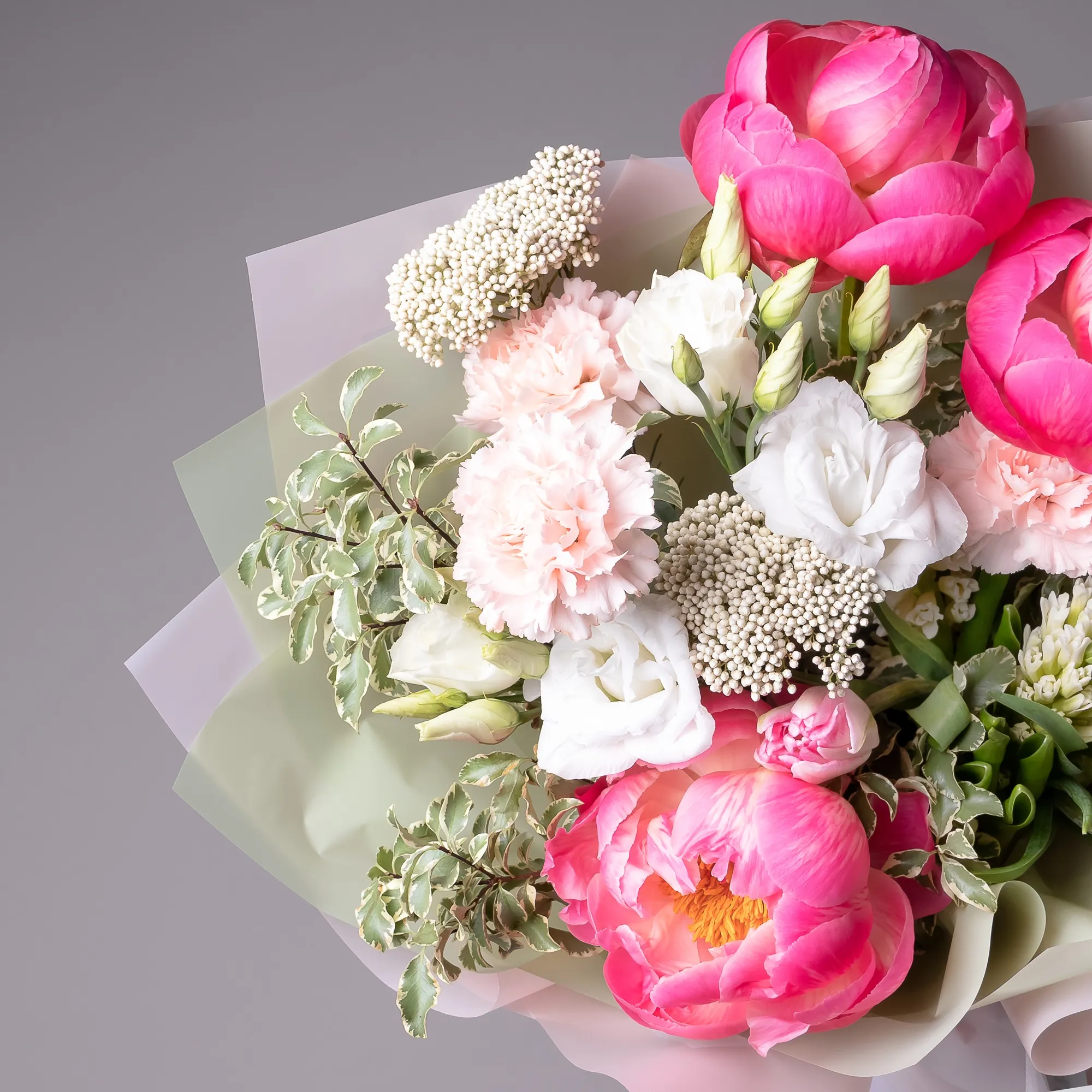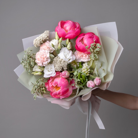 Пион-3, Гиацинт-2, Гвоздика-3, Тюльпан-3, Эустома-2, Листья питтоспорум-3
