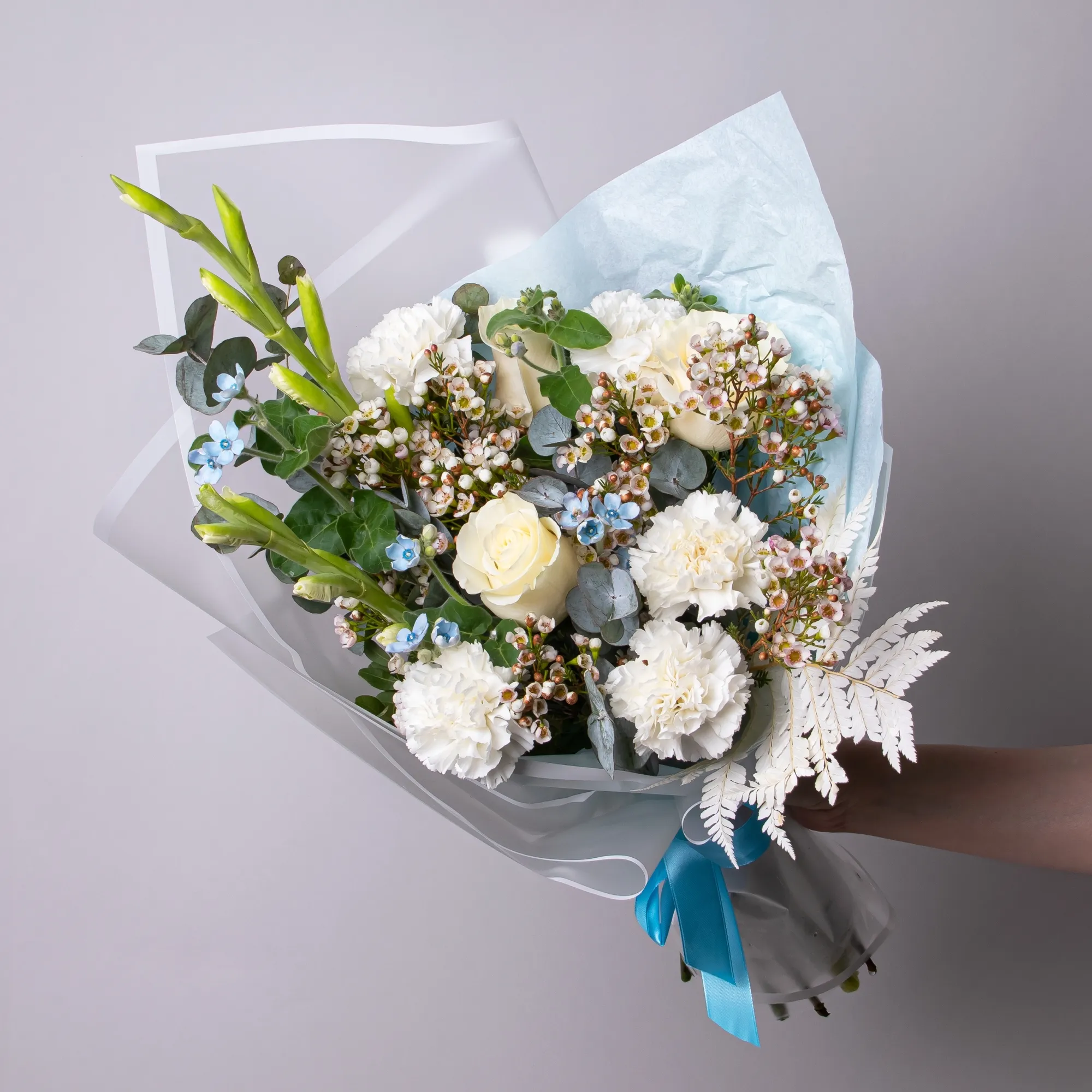 Гладиолус-2, Гвоздика-5, Роза-3, Оксипеталум-5, Листья фисташки-3, Листья эвкалипта-3