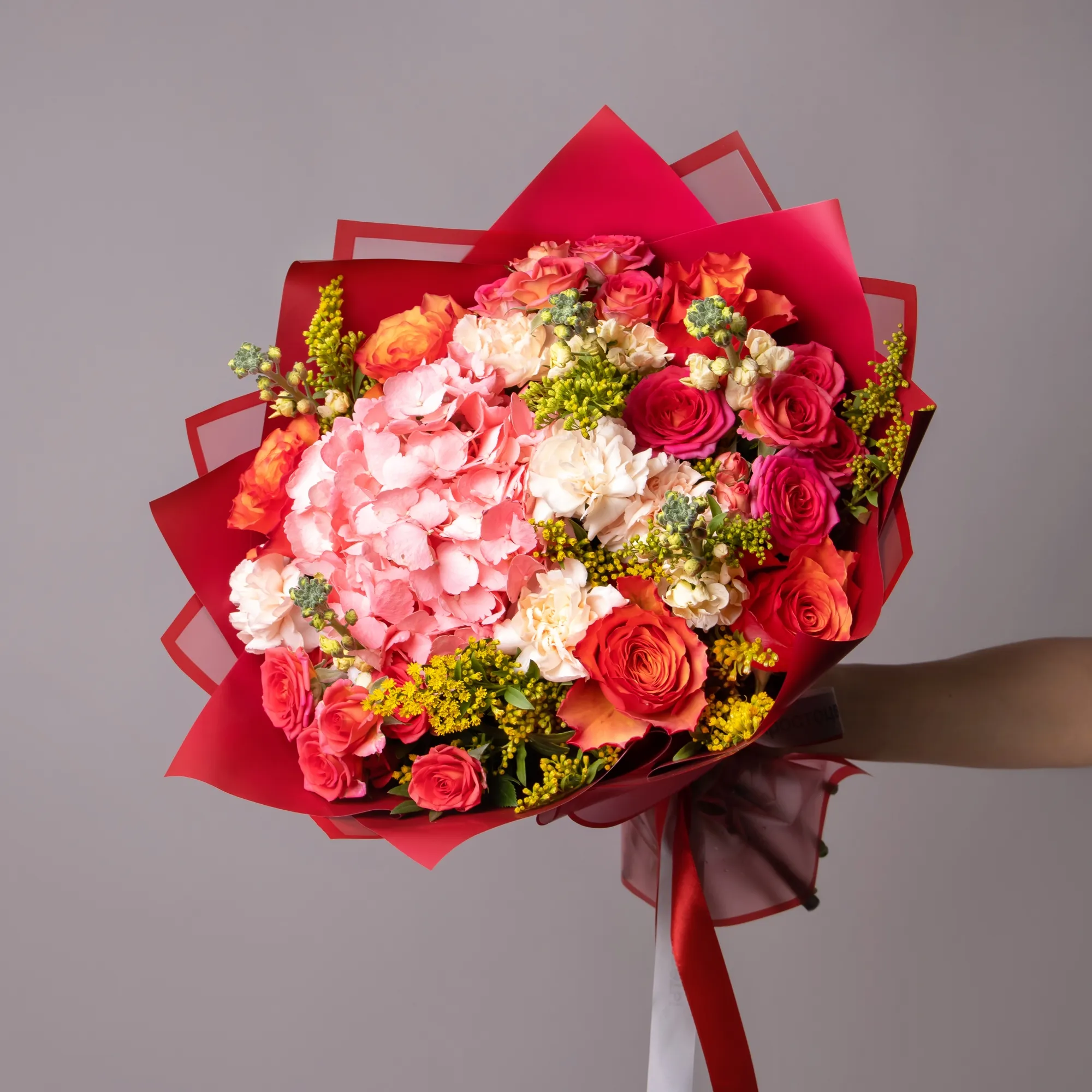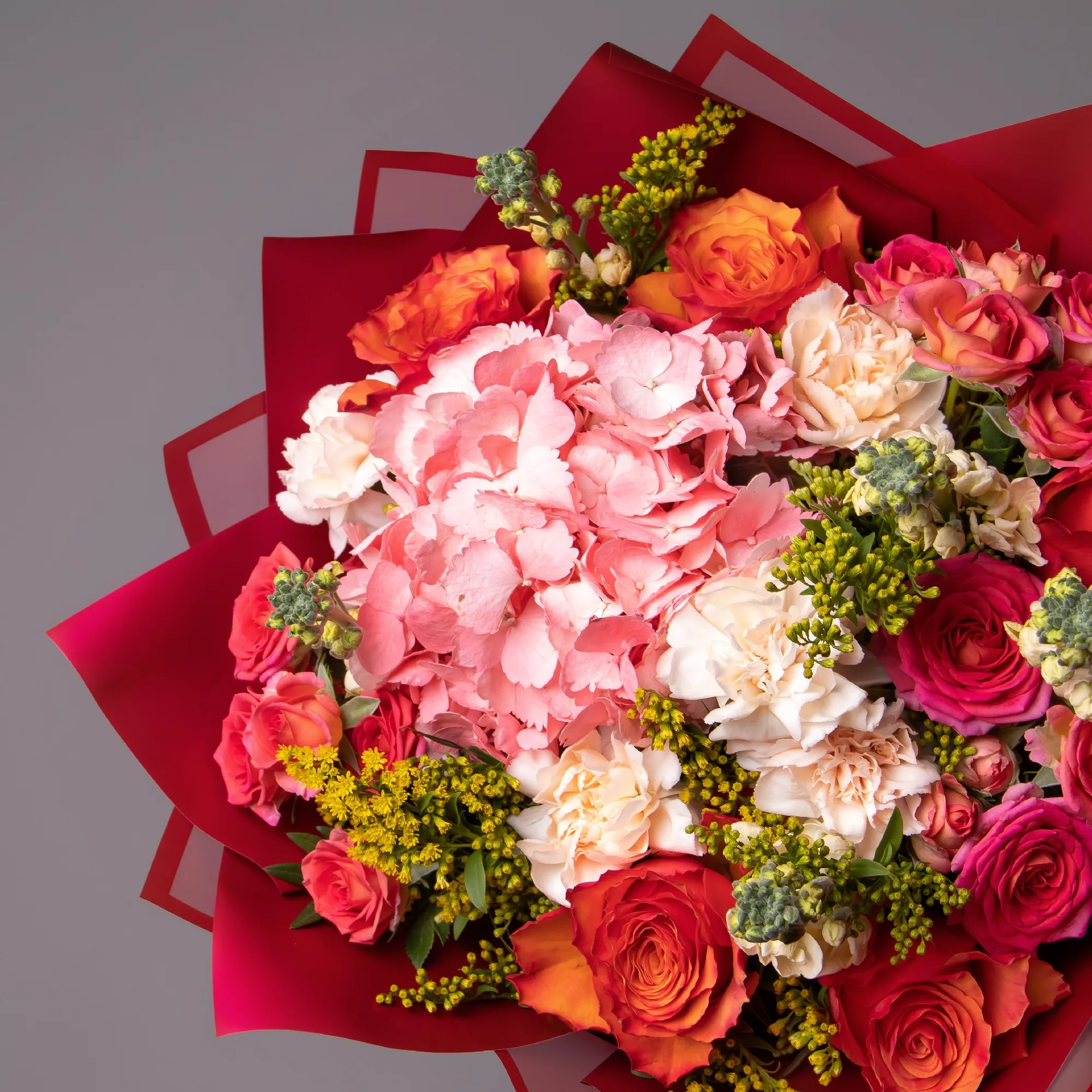 Гвоздика-5, Гортензия-1, Роза-5, Маттиола-5, Роза кустовая-3, Солидаго-5