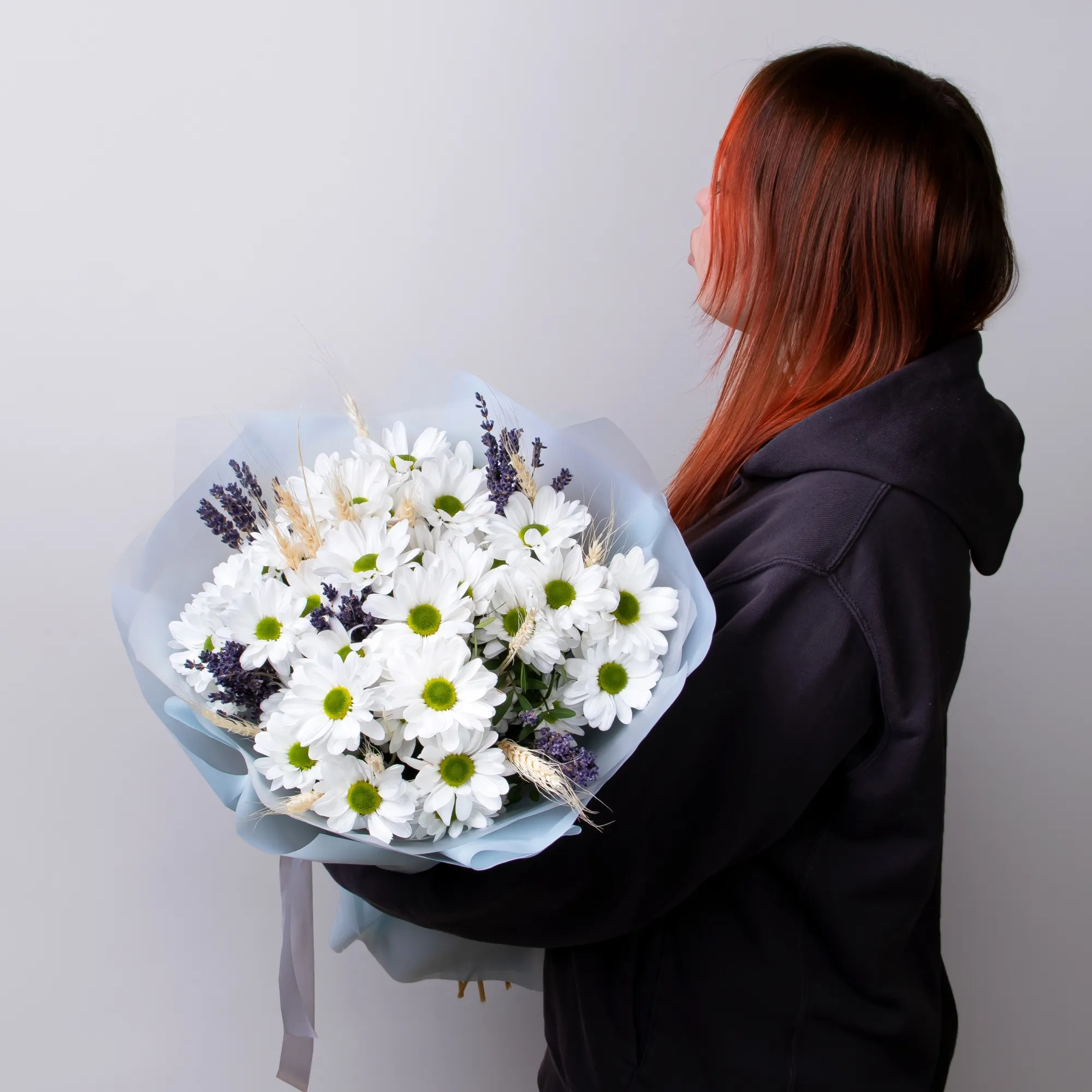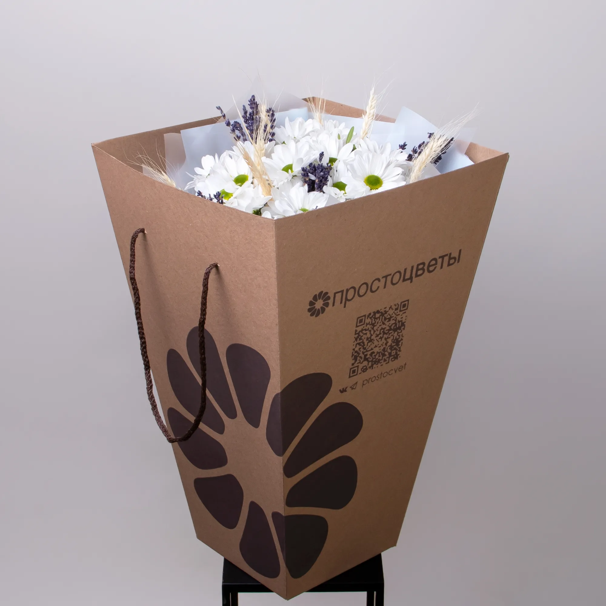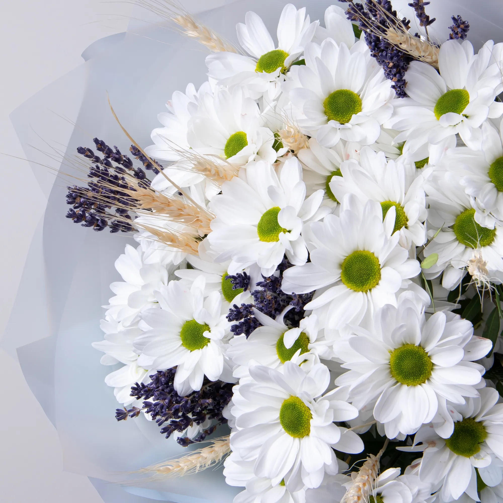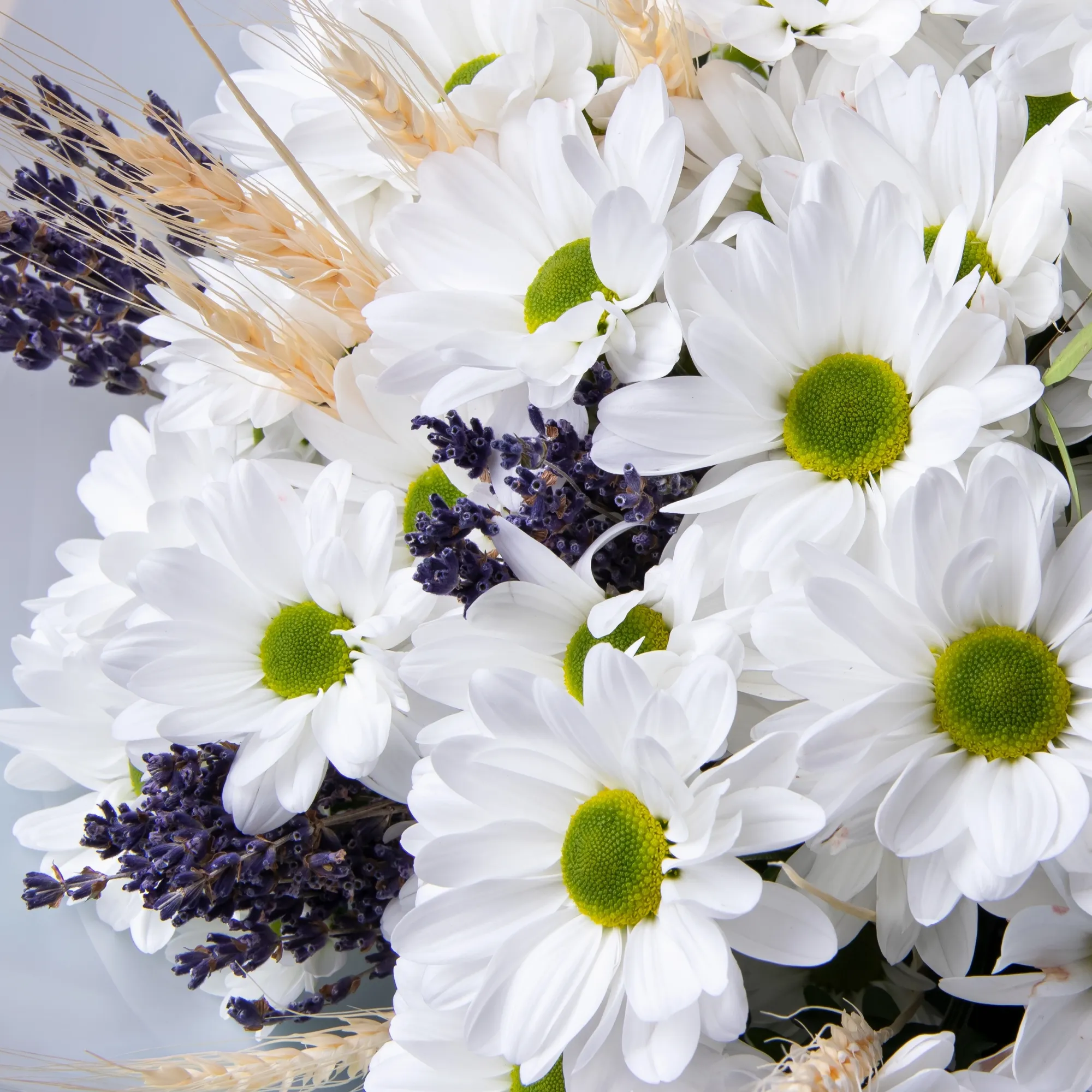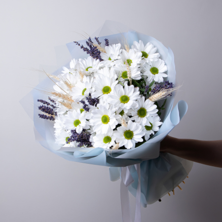 В составе букета "Пшеничная коса S" В составе букета "Пшеничная коса M" белая хризантема, лаванда, дополнен листьями фисташки и сухоцветом пшеница. Этот букет идеально подойдёт для следующих случаев: *Поздравление с рождением ребенка - нежная композиция из белой хризантемы и лаванды символизирует чистоту и спокойствие, а колоски пшеницы традиционно ассоциируются с плодородием и благополучием. Такой букет станет особенно символичным подарком для молодой мамы. *День учителя или поздравление наставника - природные оттенки цветов и спокойное сочетание элементов букета выражают уважение и благодарность, а пшеница традиционно символизирует мудрость и знания, что делает композицию особенно уместной для педагога. Закажите букет с доставкой или заберите самовывозом. И помните, что цветы - это просто.