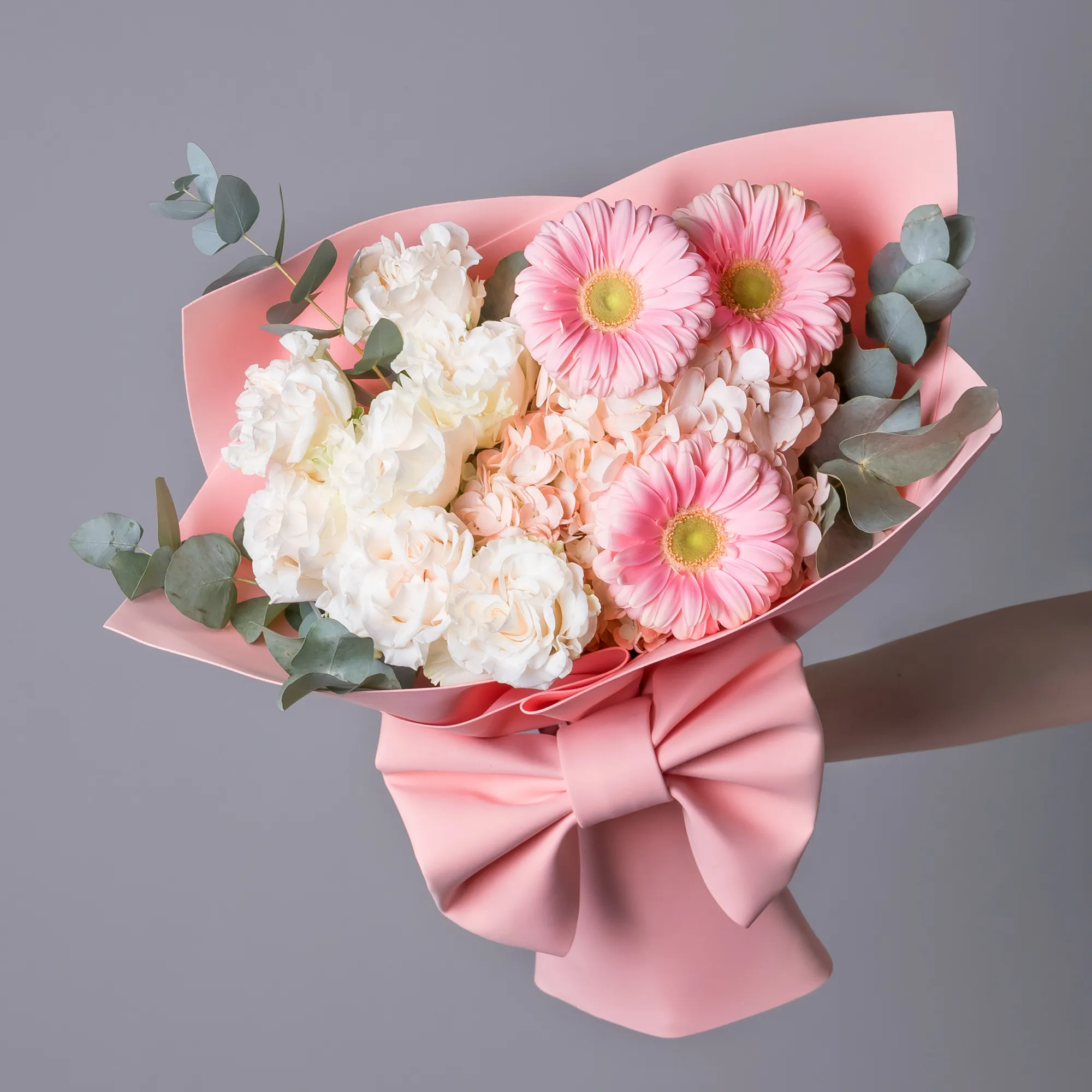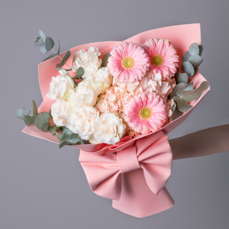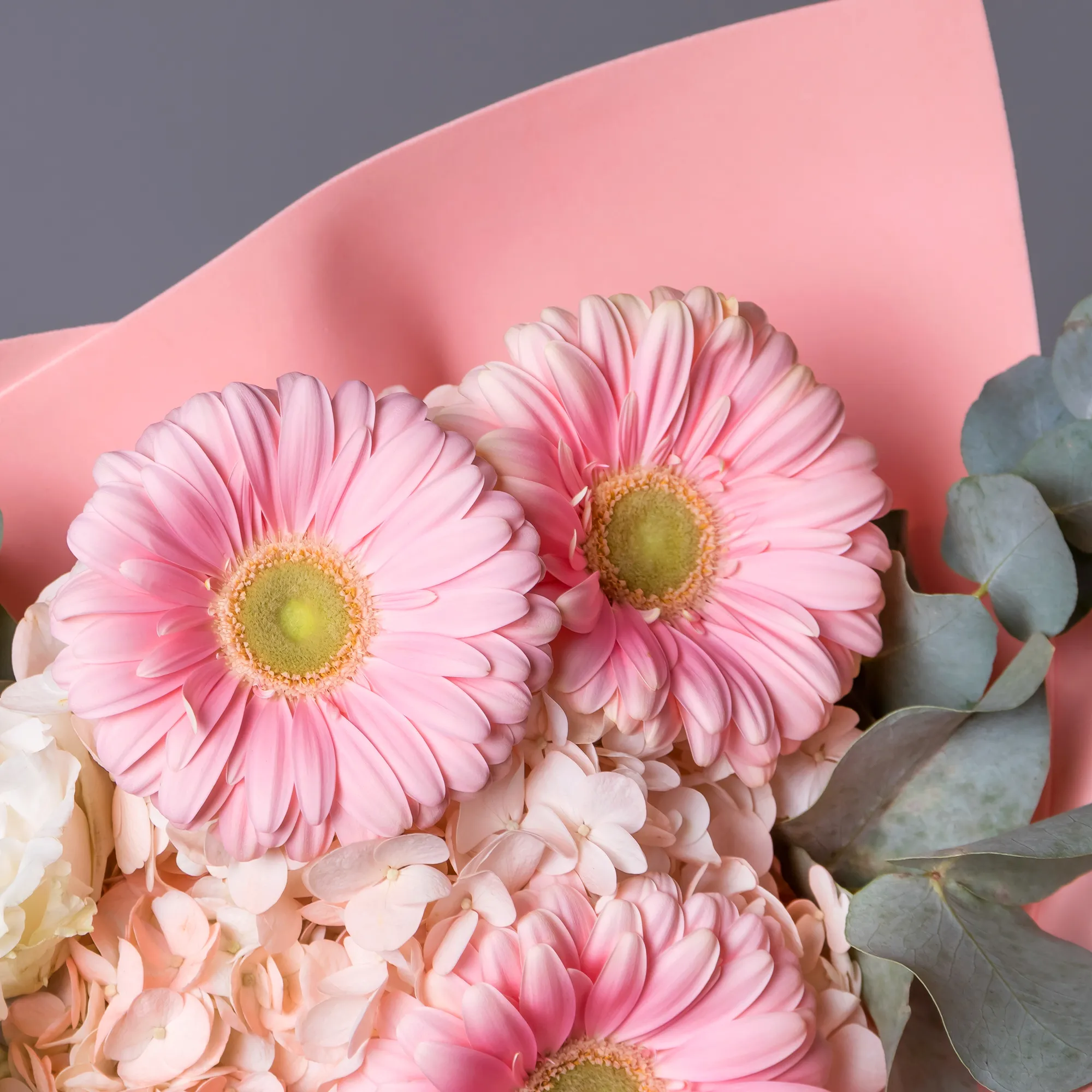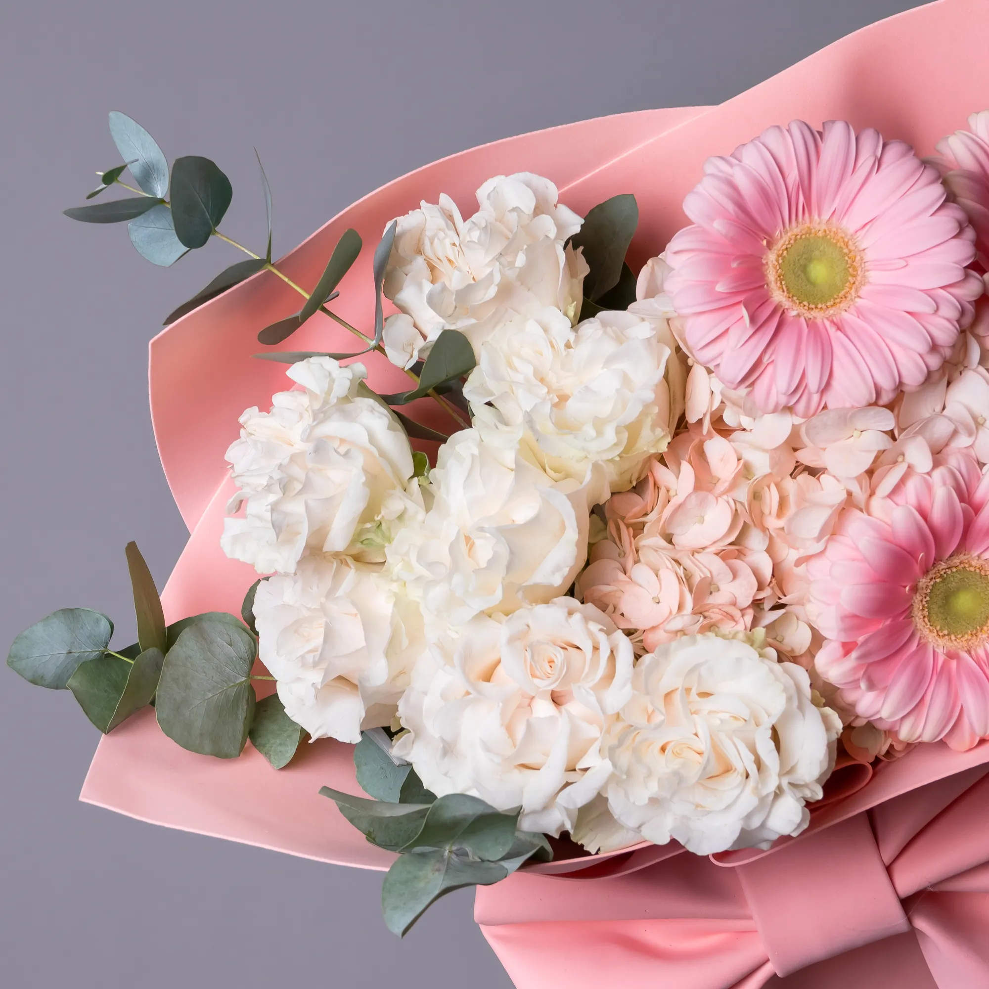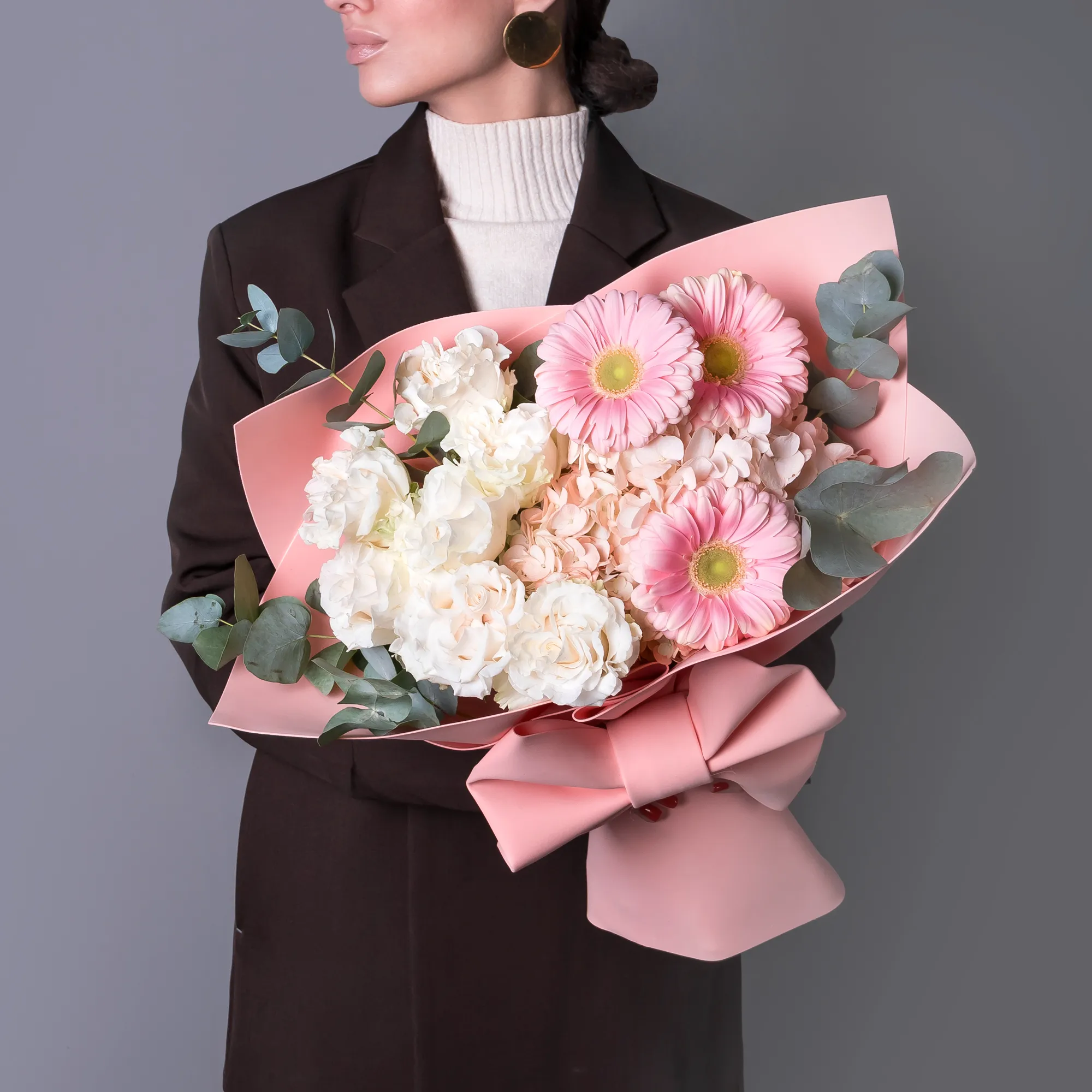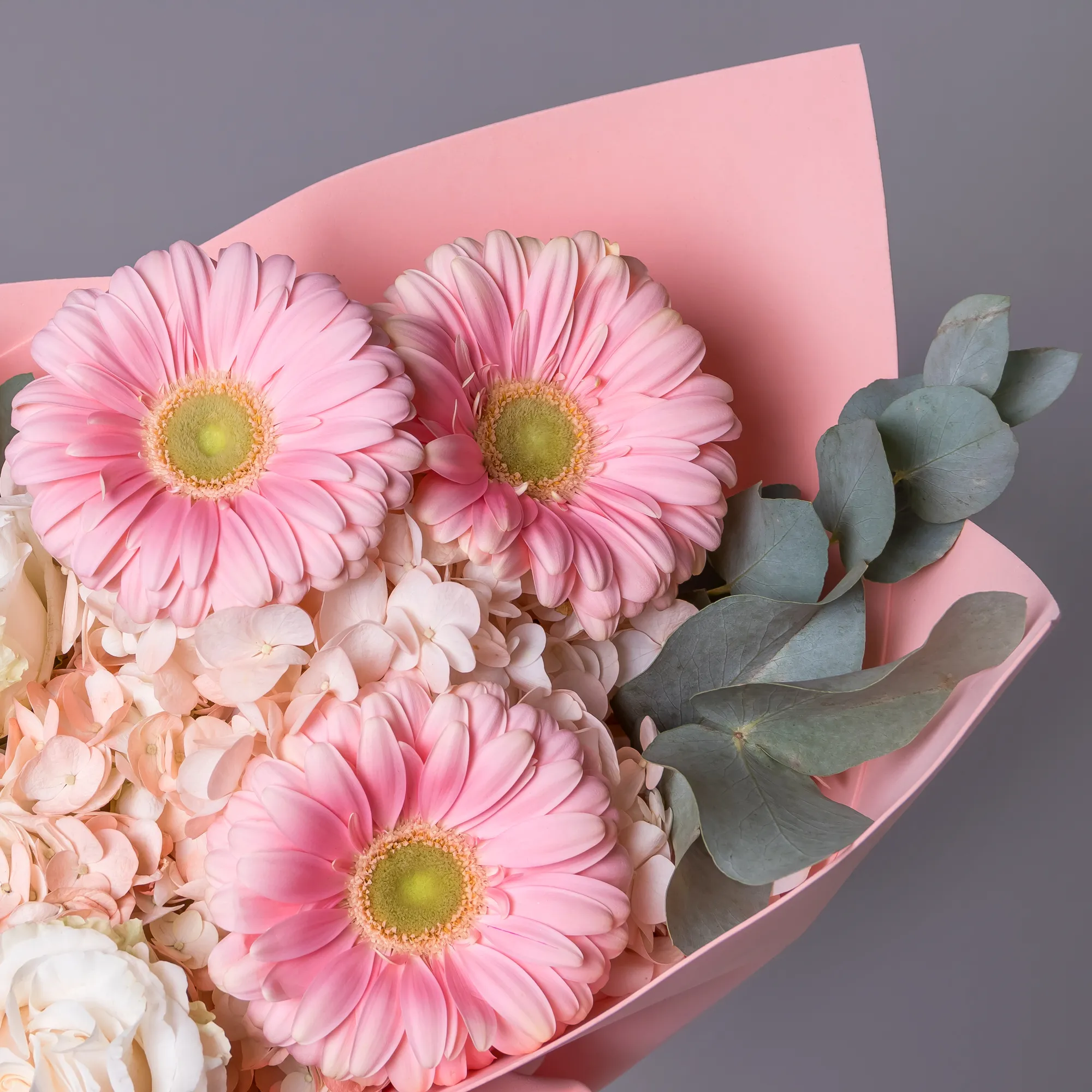 Гербера, Гортензия, Роза, Листья фисташки, Листья эвкалипта
