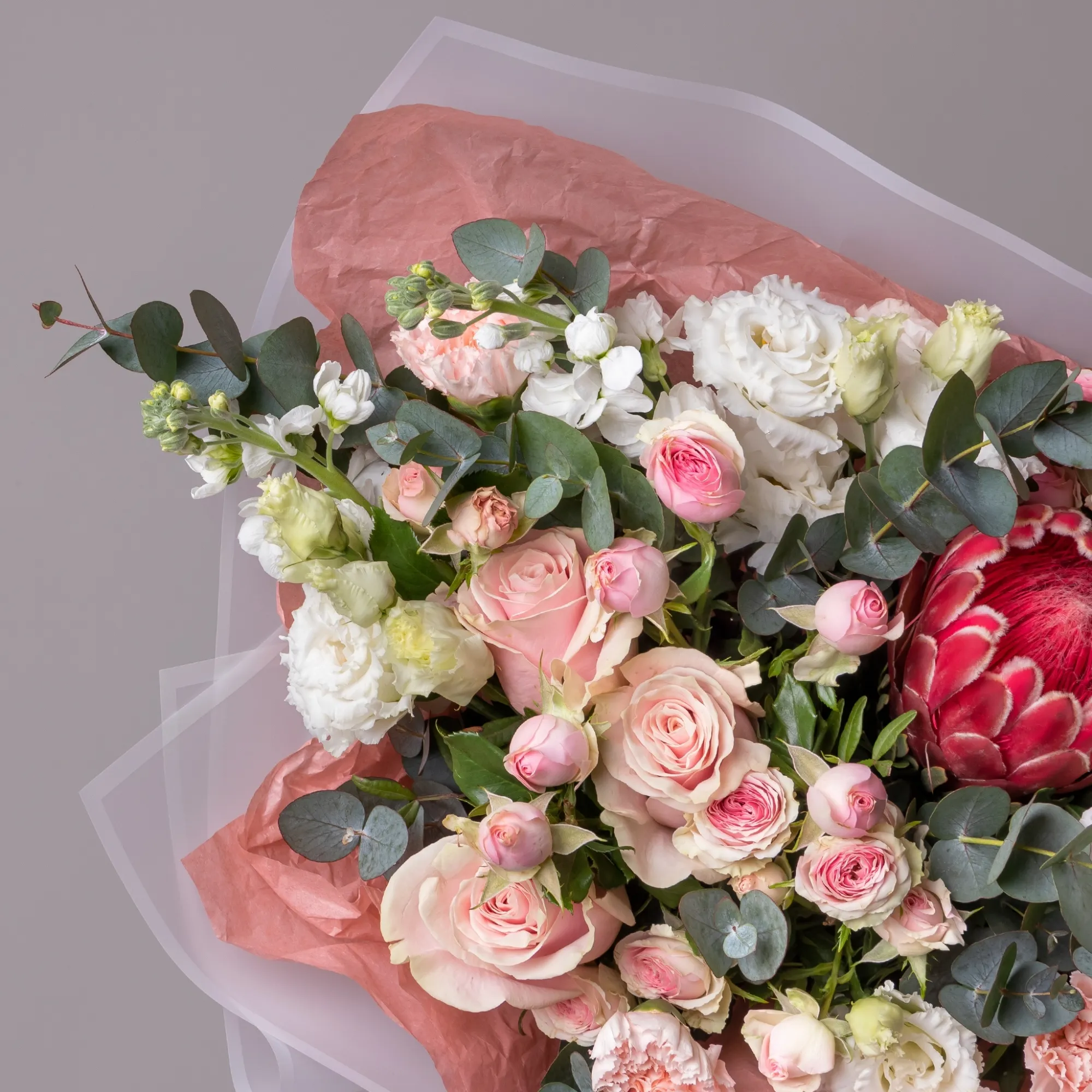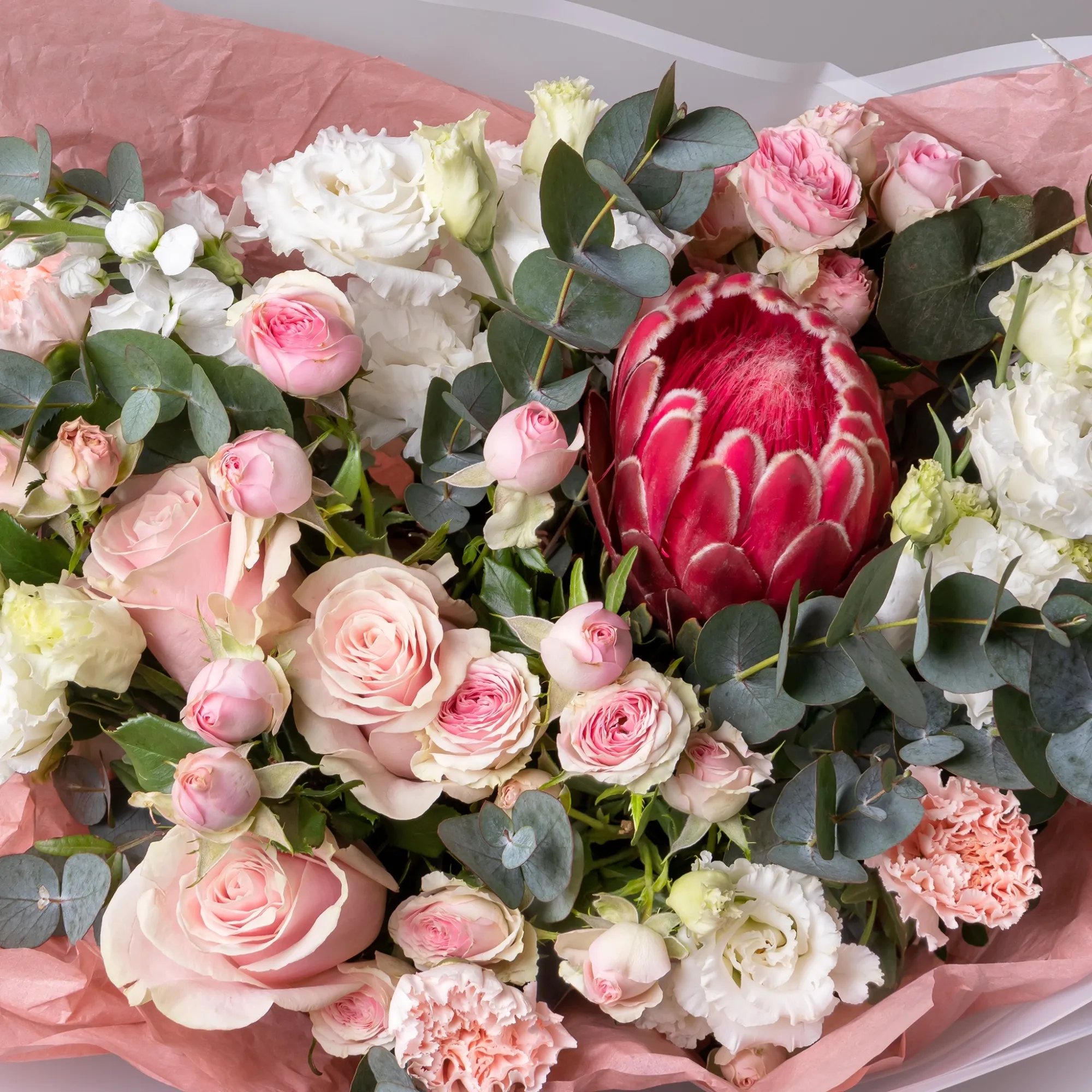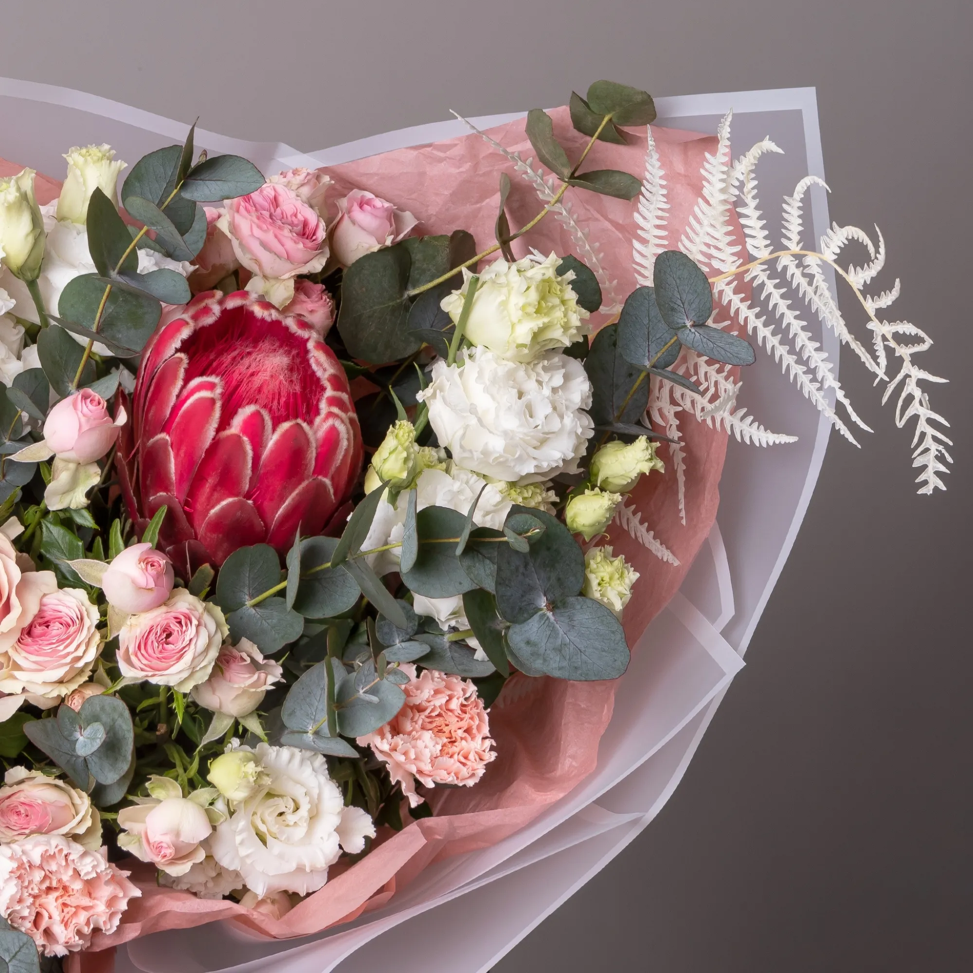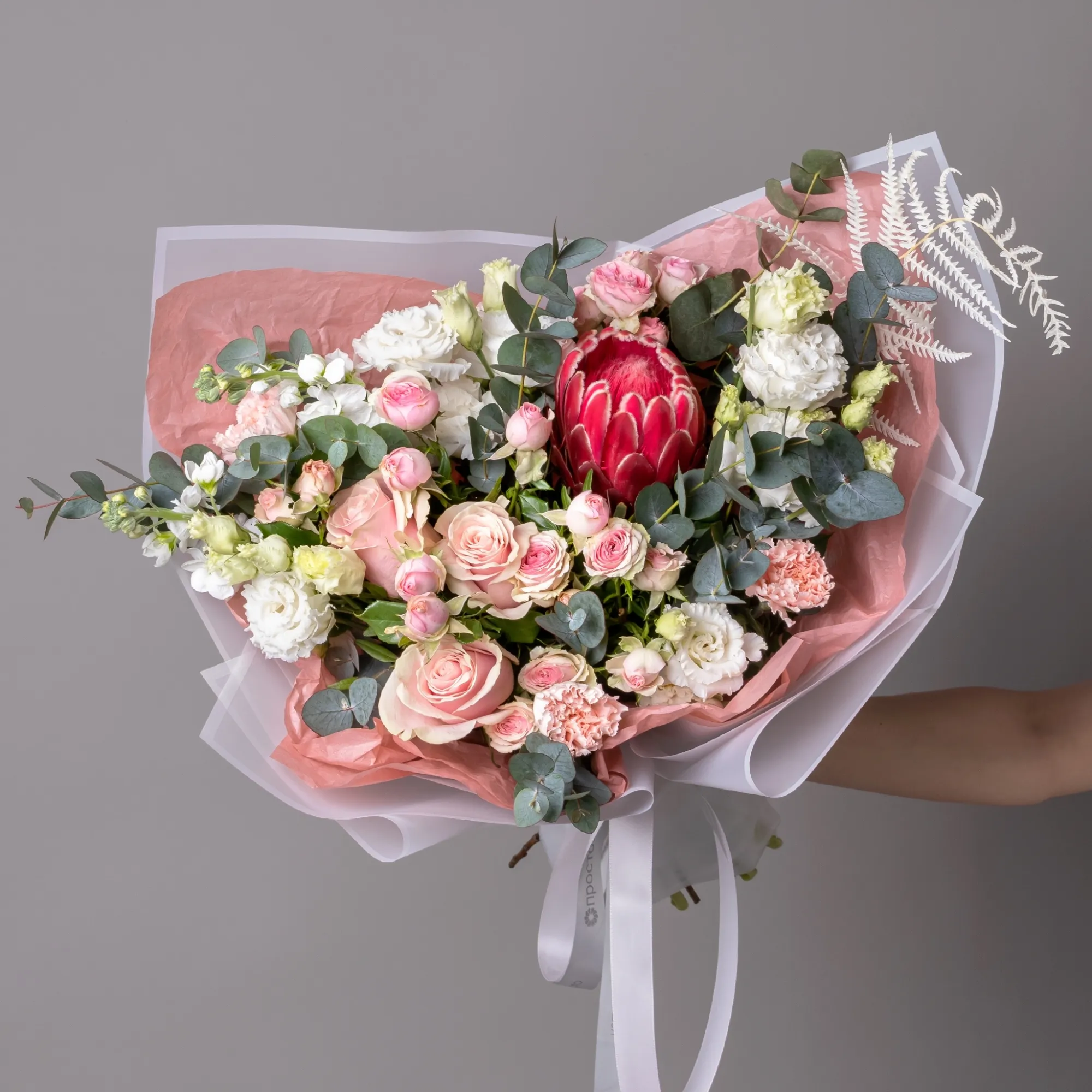 В составе букета "Путеводная звезда M" кустовая роза "Динара", белая маттиола, персиковая гвоздика, роза "Мондиал", белый лизиантус, красная протея, дополнен листьями фисташки и кремовым сухоцветом папоротник.Этот букет идеально подойдёт для следующих случаев:*День рождения близкого человека - насыщенные красные и персиковые оттенки в сочетании с нежными белыми цветами создают роскошный и торжественный вид букета, который станет прекрасным подарком для именинника и подчеркнет ваше особое отношение к этому событию. *Деловая встреча или презентация - строгая композиция букета с яркими акцентами протеи и элегантными розами символизирует профессионализм и успех, при этом нежные пастельные тона создают атмосферу дружелюбия и открытости к сотрудничеству.