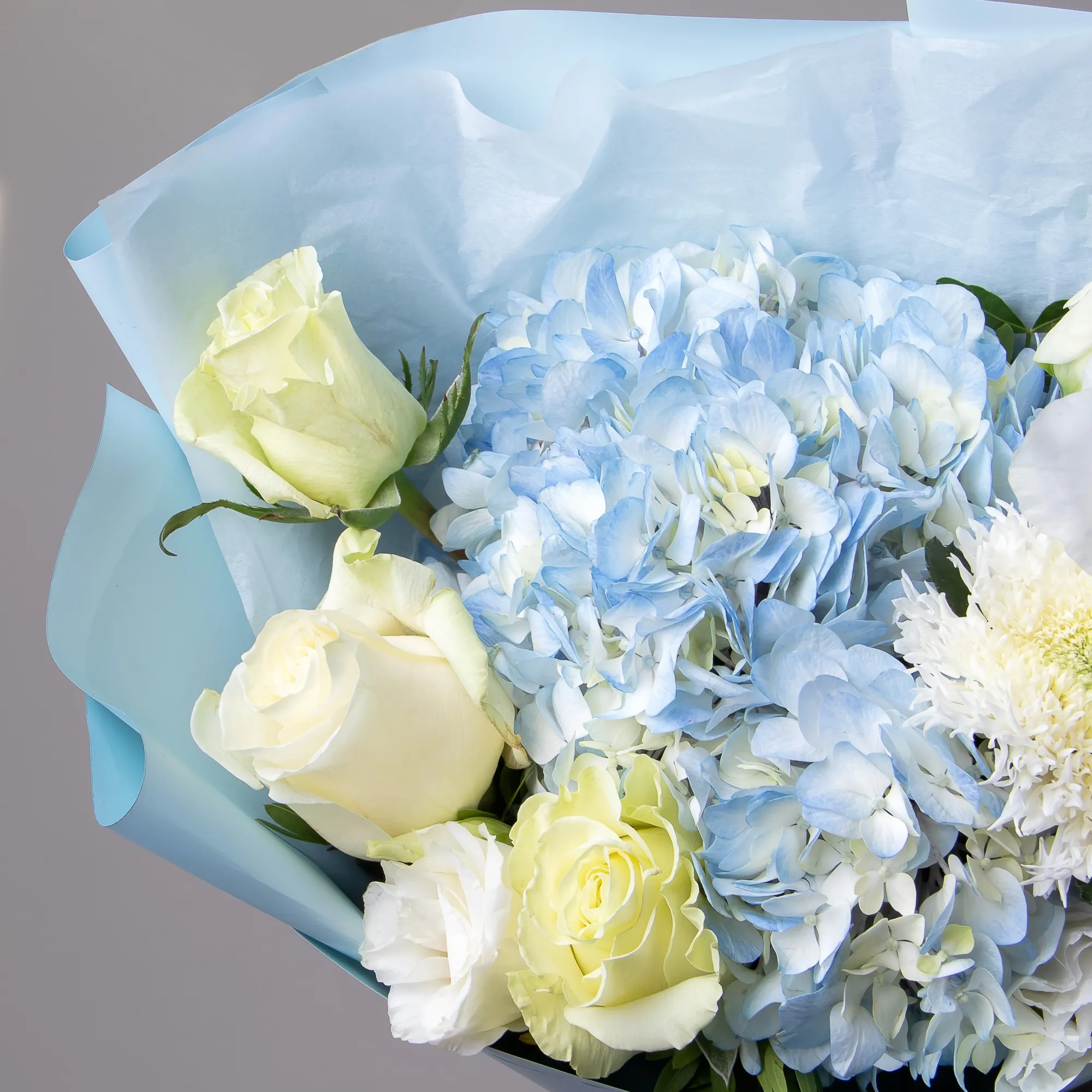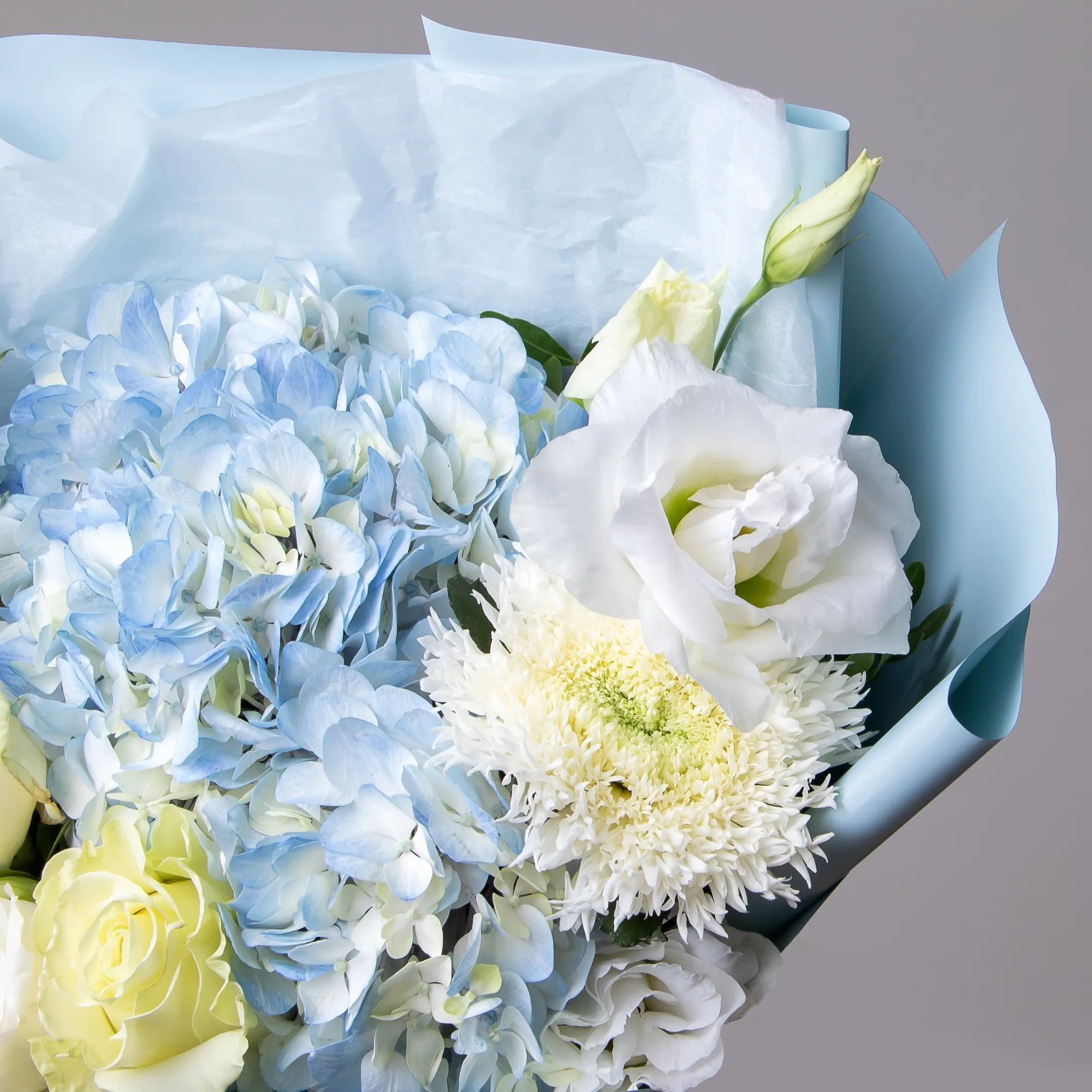 Гортензия-1, Роза-3, Хризантема-1, Эустома-1, Листья фисташки-4