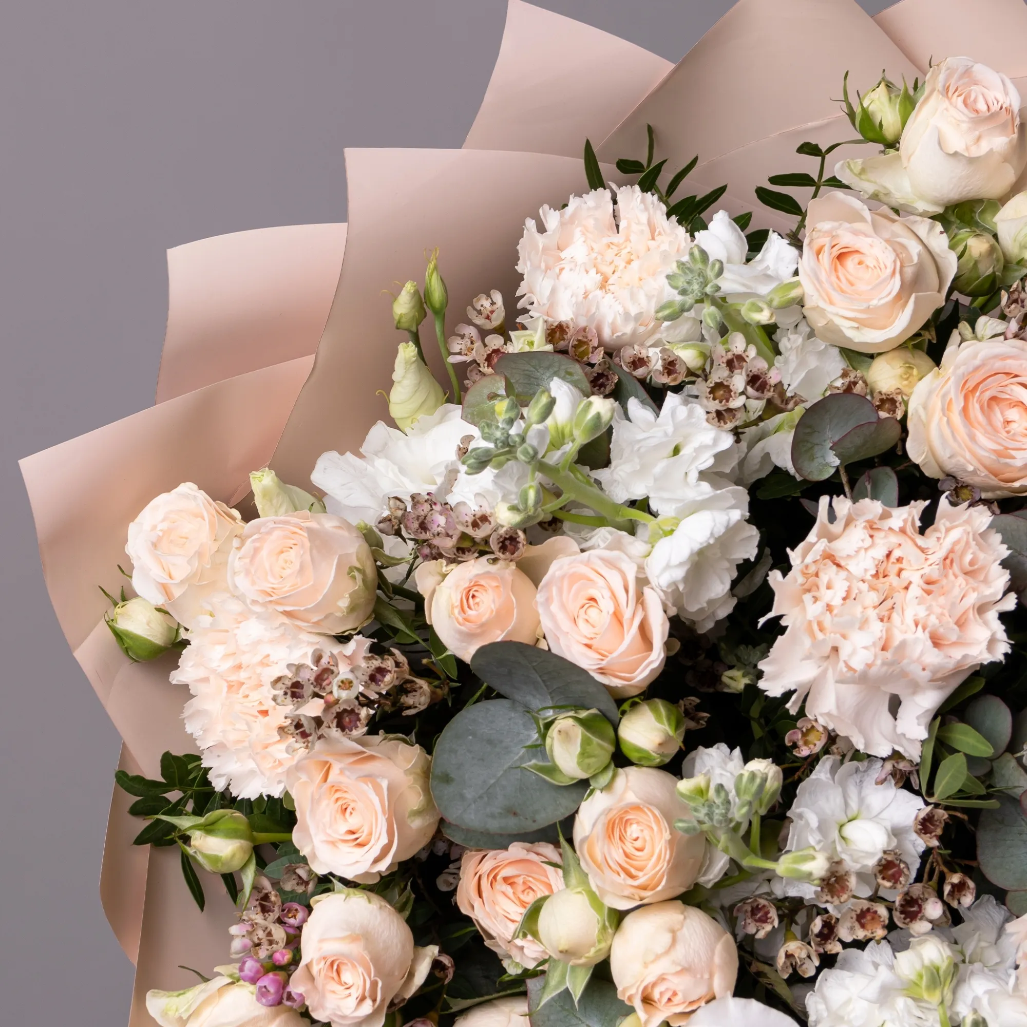 Гвоздика, Роза, Маттиола, Эустома, Листья фисташки, Листья эвкалипта