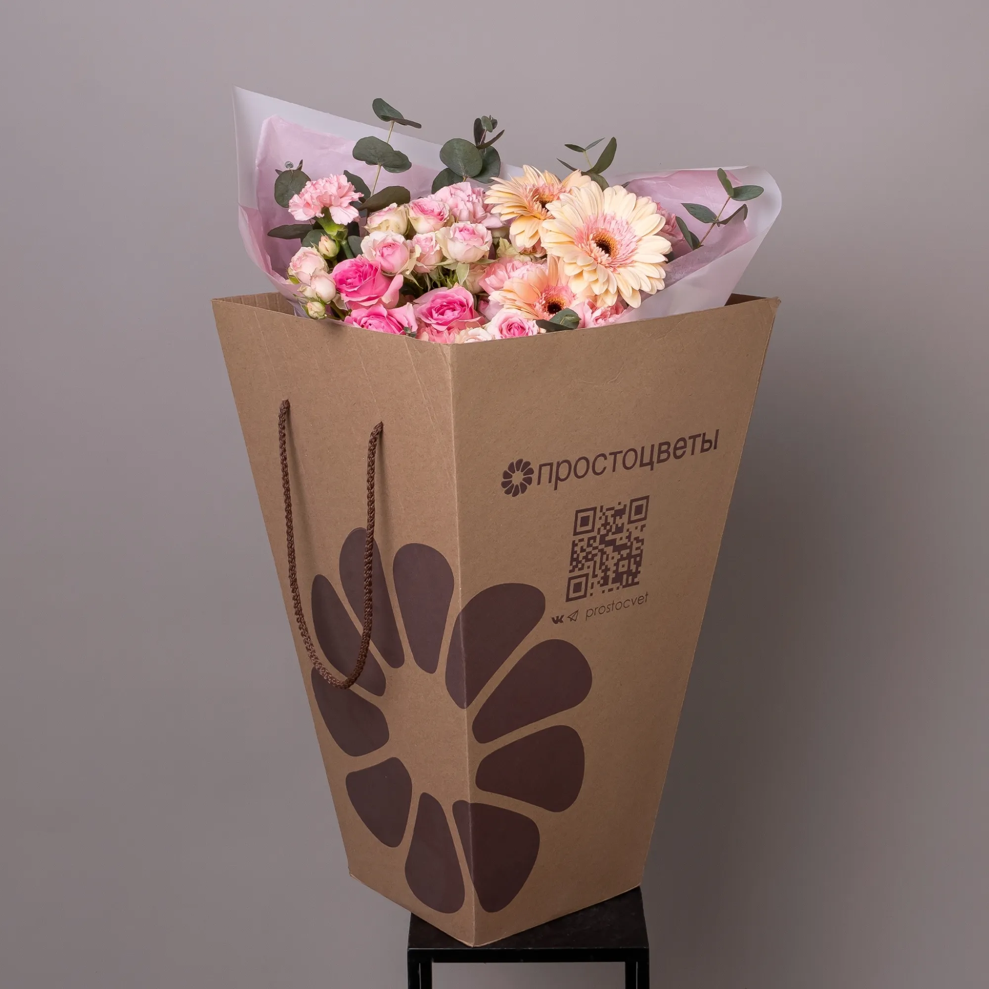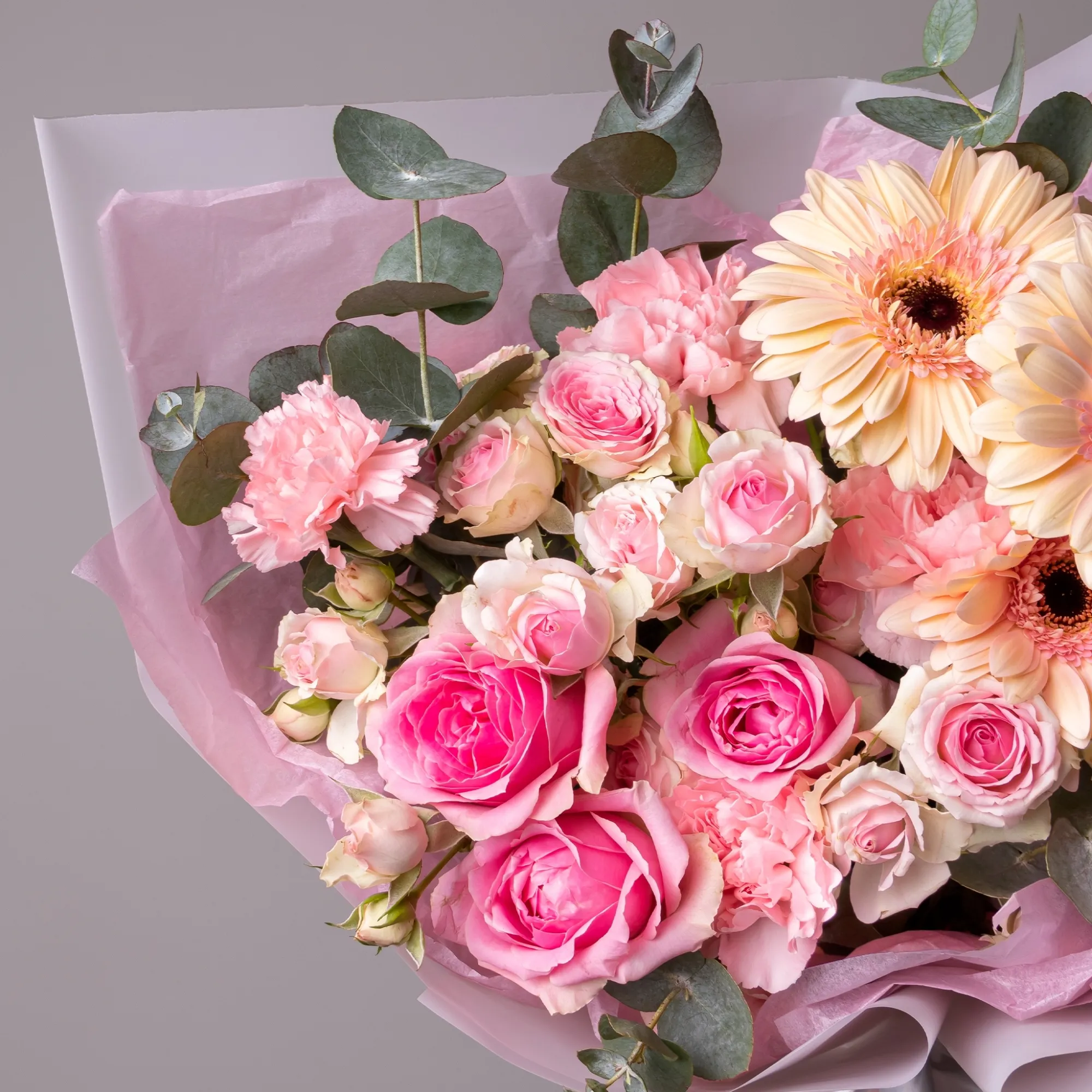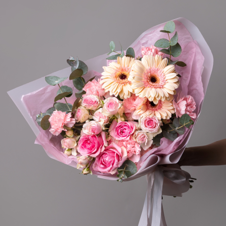 В составе букета "Розе" кустовая роза "Динара", роза "Вэм", розовая гвоздика, кремовая гербера, дополнен листьями фисташки и эвкалипта. Этот букет идеально подойдёт для следующих случаев: *Праздничного торжества* - когда хочется выразить самые искренние чувства и подарить незабываемые эмоции. *Особого признания* - когда слова становятся лишними, а цветы говорят громче любых признаний. Роскошные кустовые розы «Динара» в тандеме с изысканными розами «Вэм» создают неповторимую композицию, где каждый цветок рассказывает свою историю. Нежные розовые гвоздики и кремовые герберы добавляют букету очарования, а сочная зелень фисташки и эвкалипта подчеркивает природную красоту композиции. Закажите букет с доставкой или заберите самовывозом. И помните, что цветы - это просто.