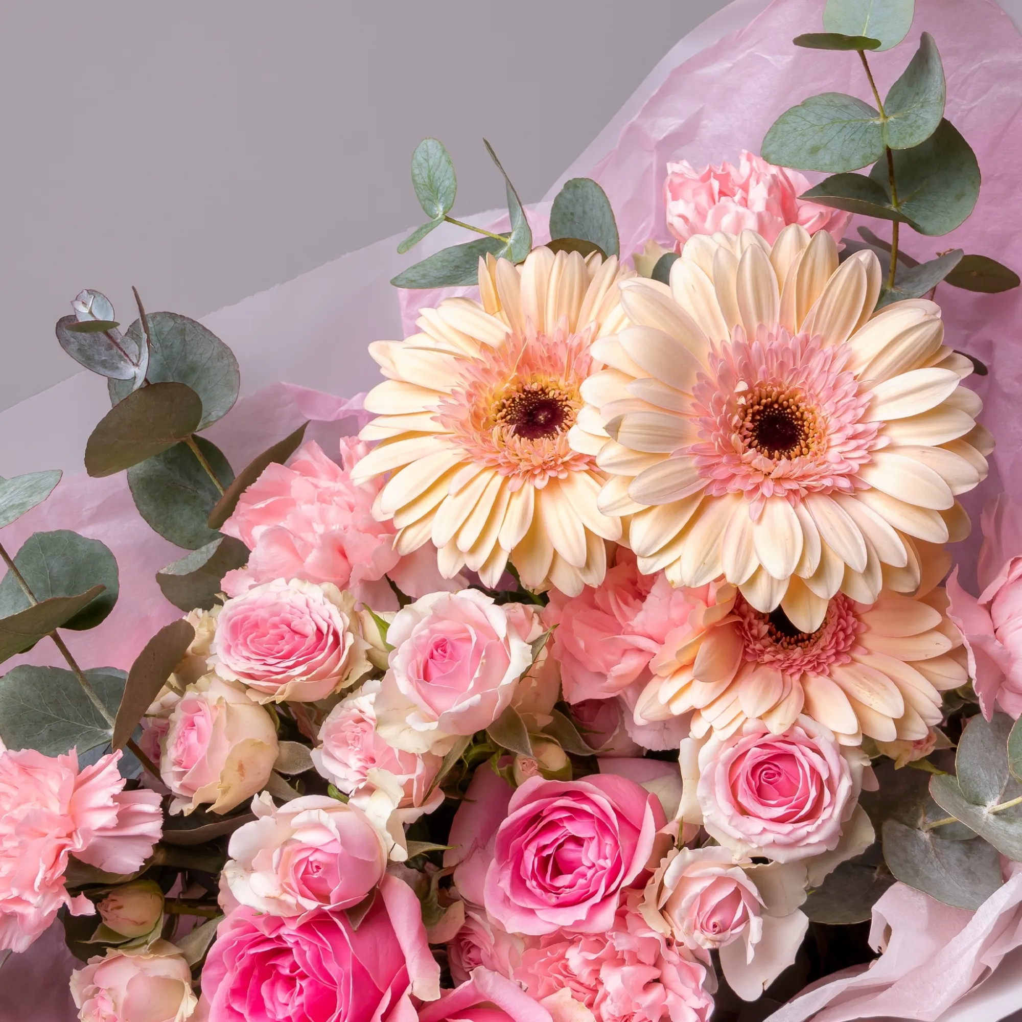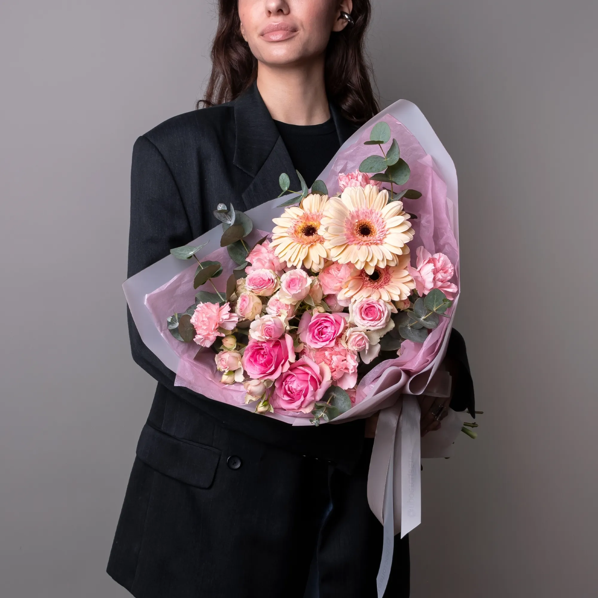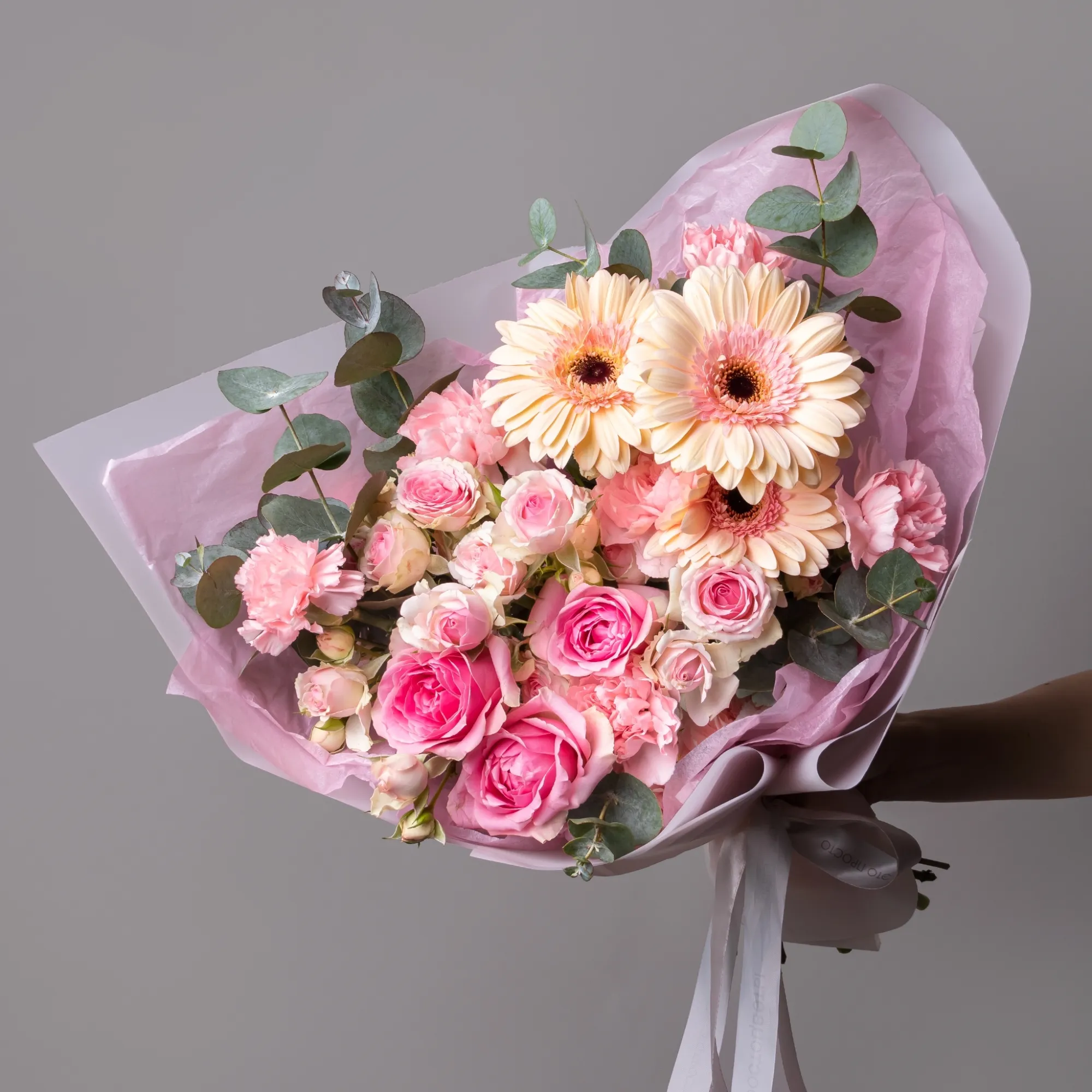 Гвоздика, Гербера, Роза, Листья фисташки, Листья эвкалипта