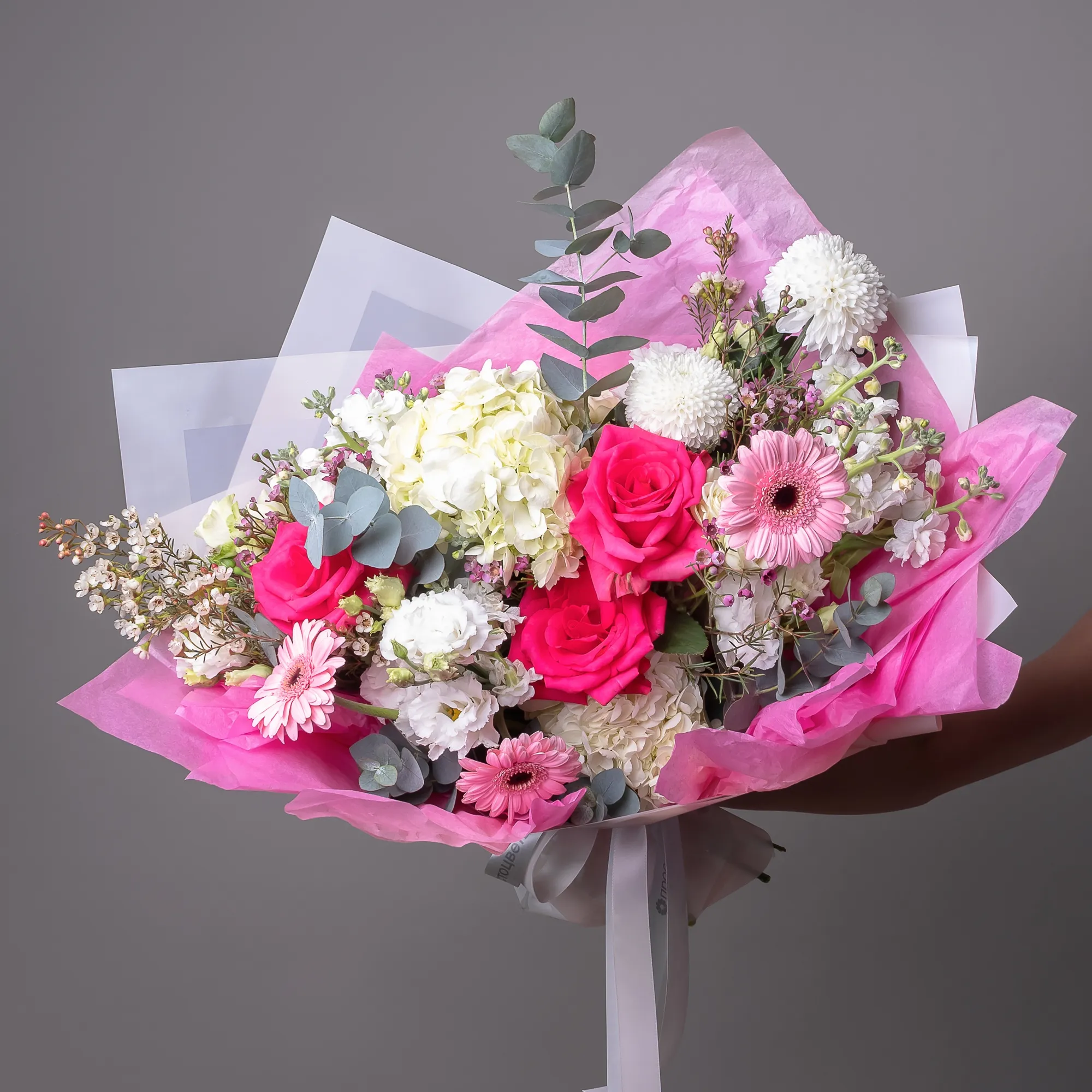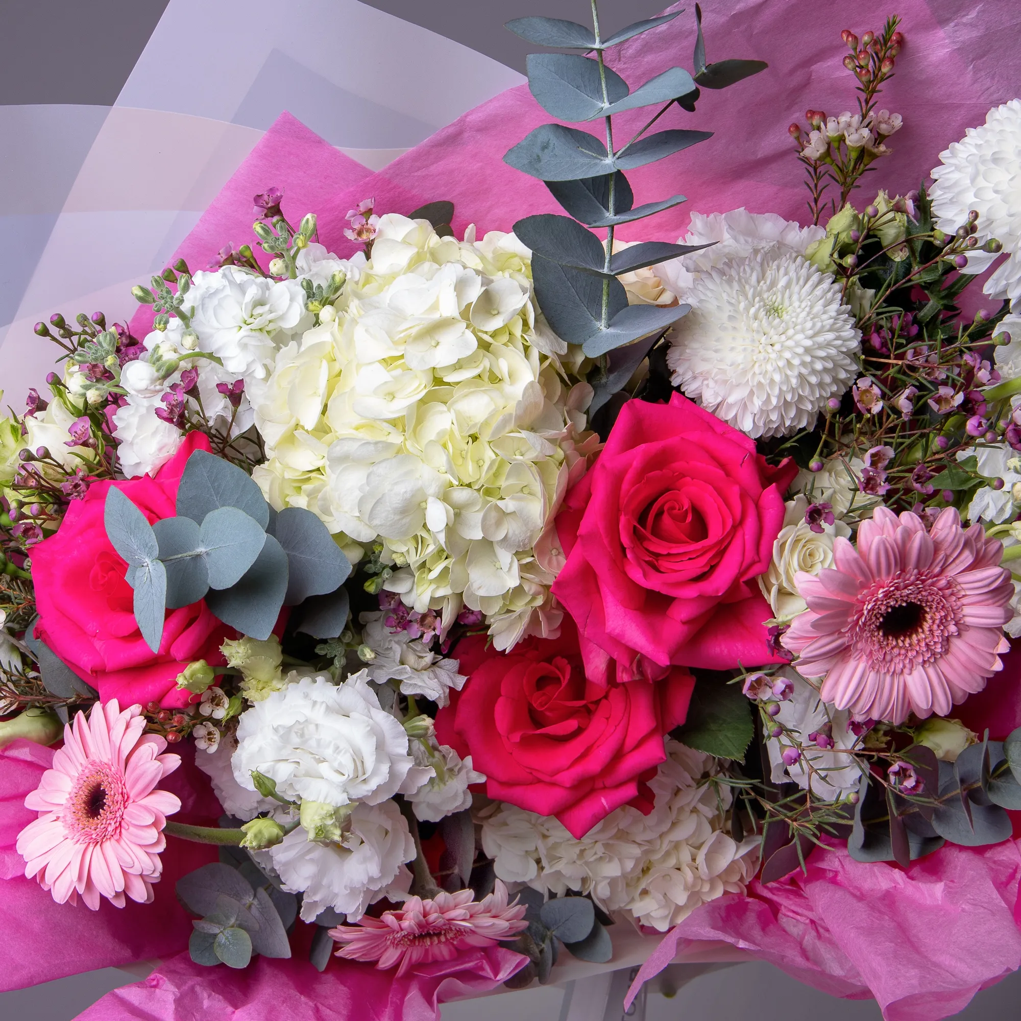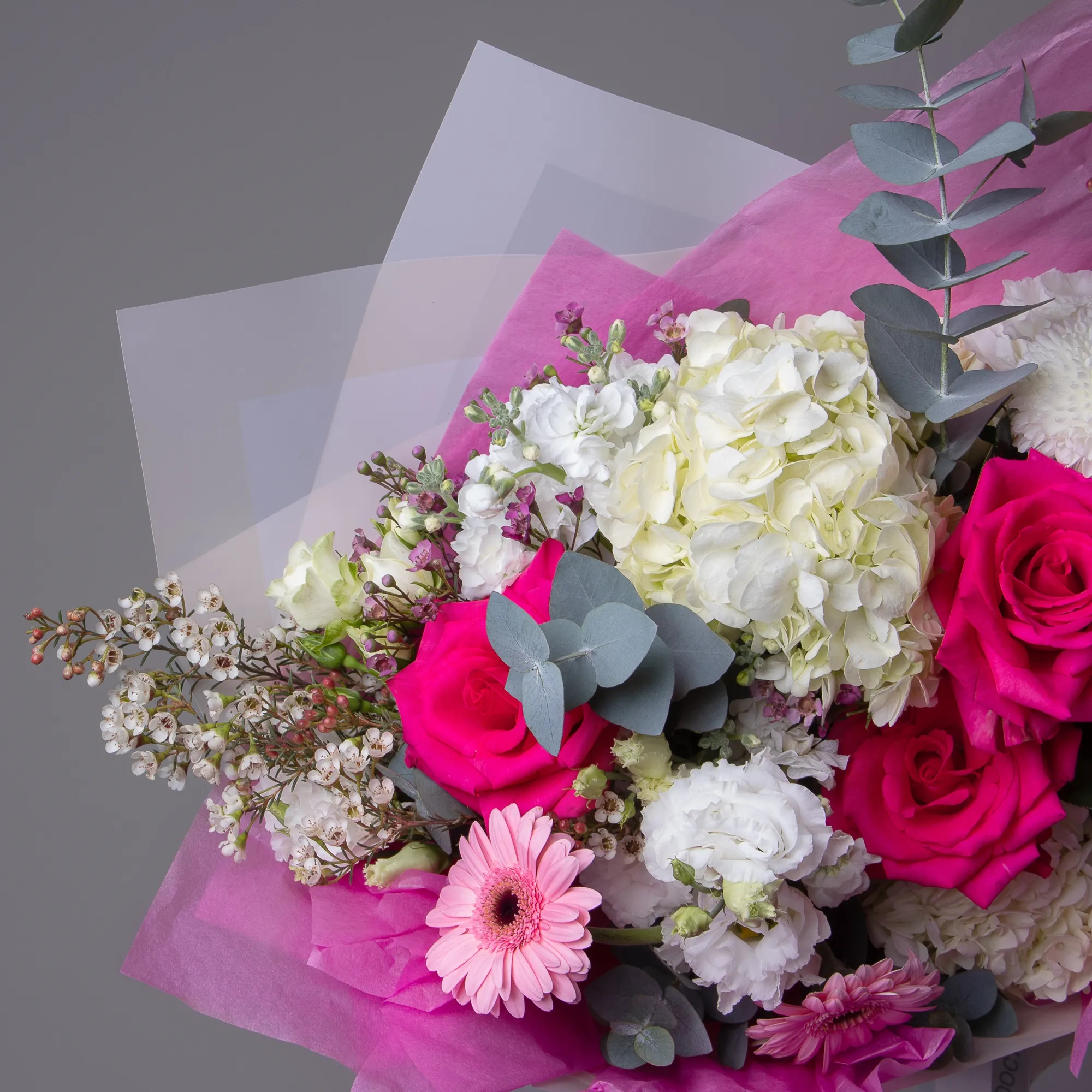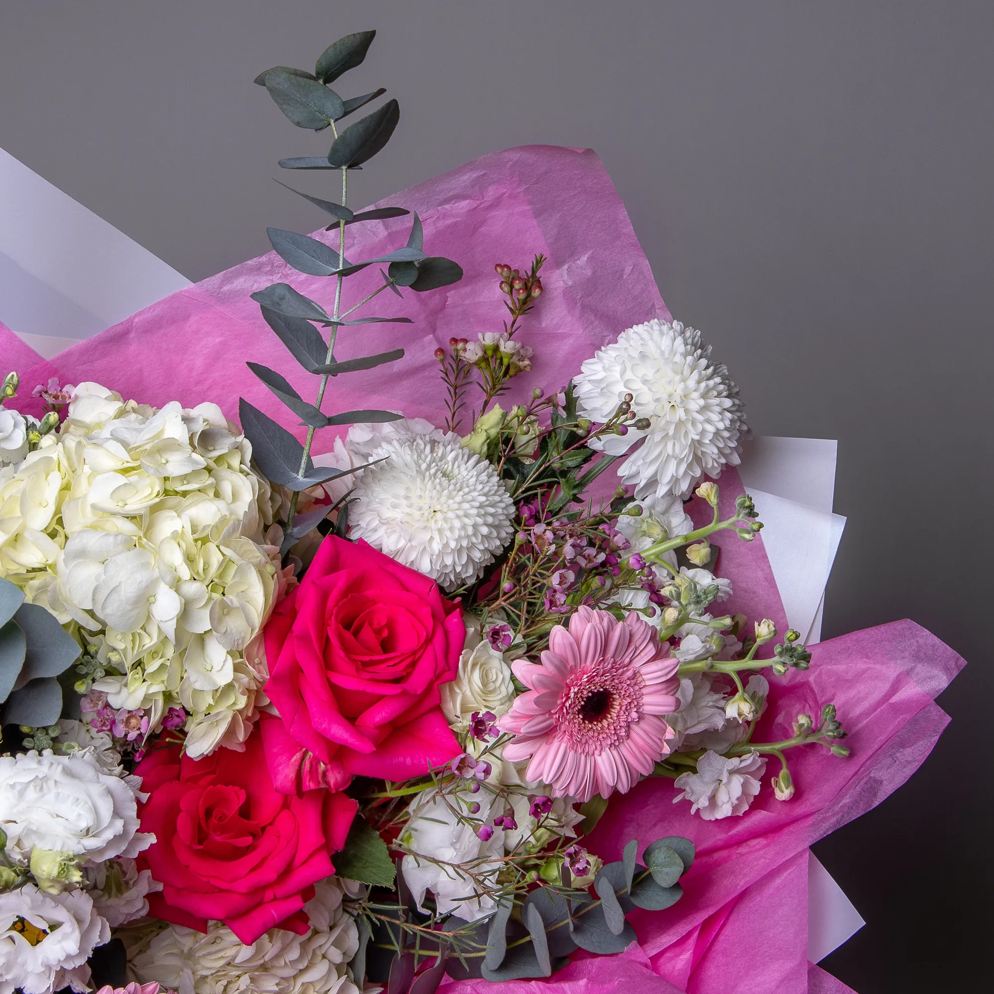 Гортензия-2, Роза-3, Хризантема-2, Маттиола-3, Гермини-3, Эустома-2, Роза кустовая-3, Листья эвкалипта-2