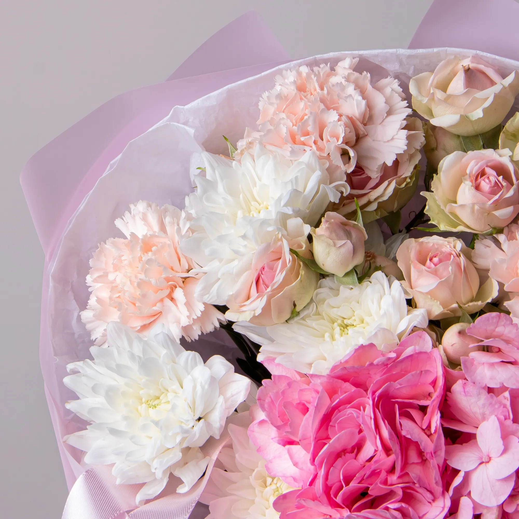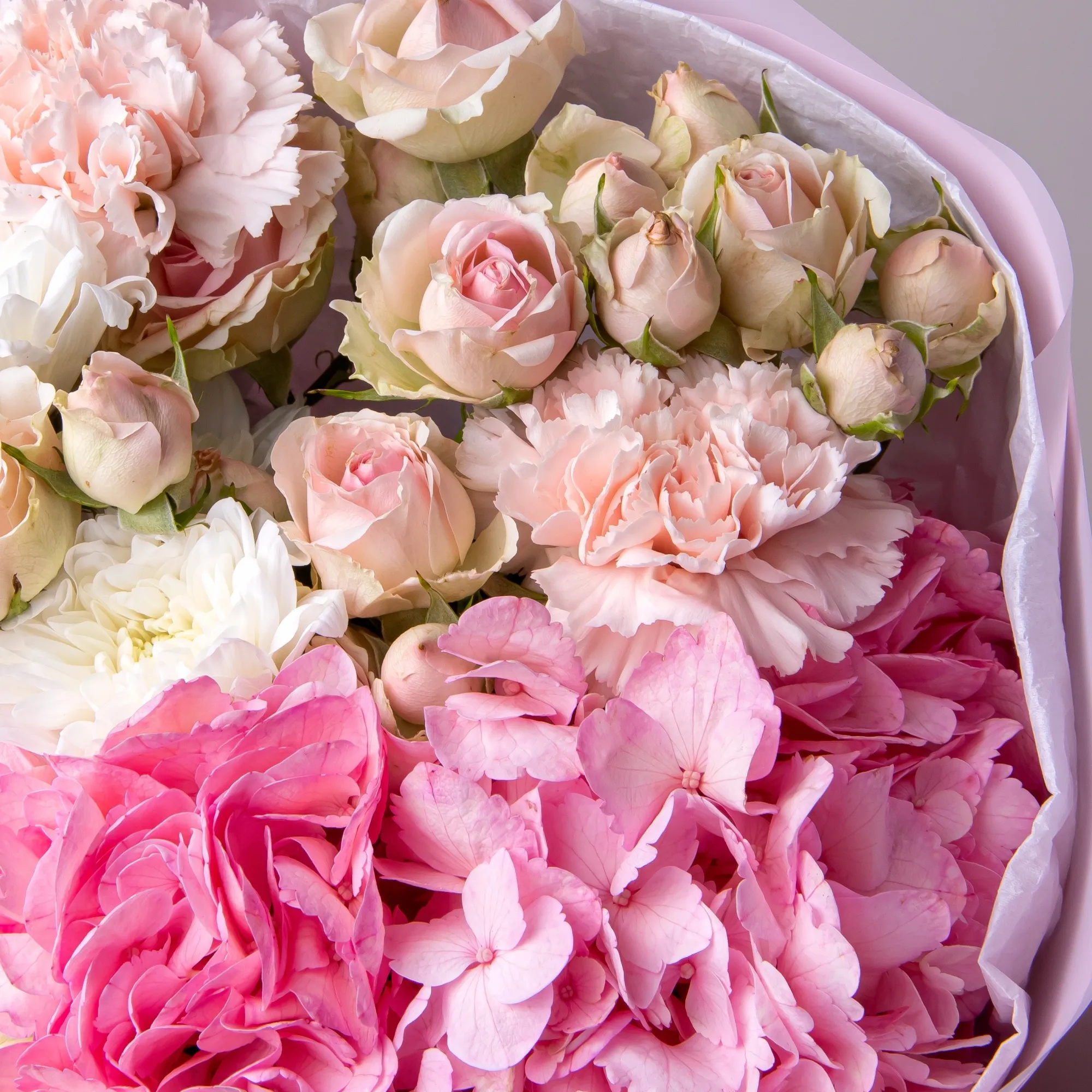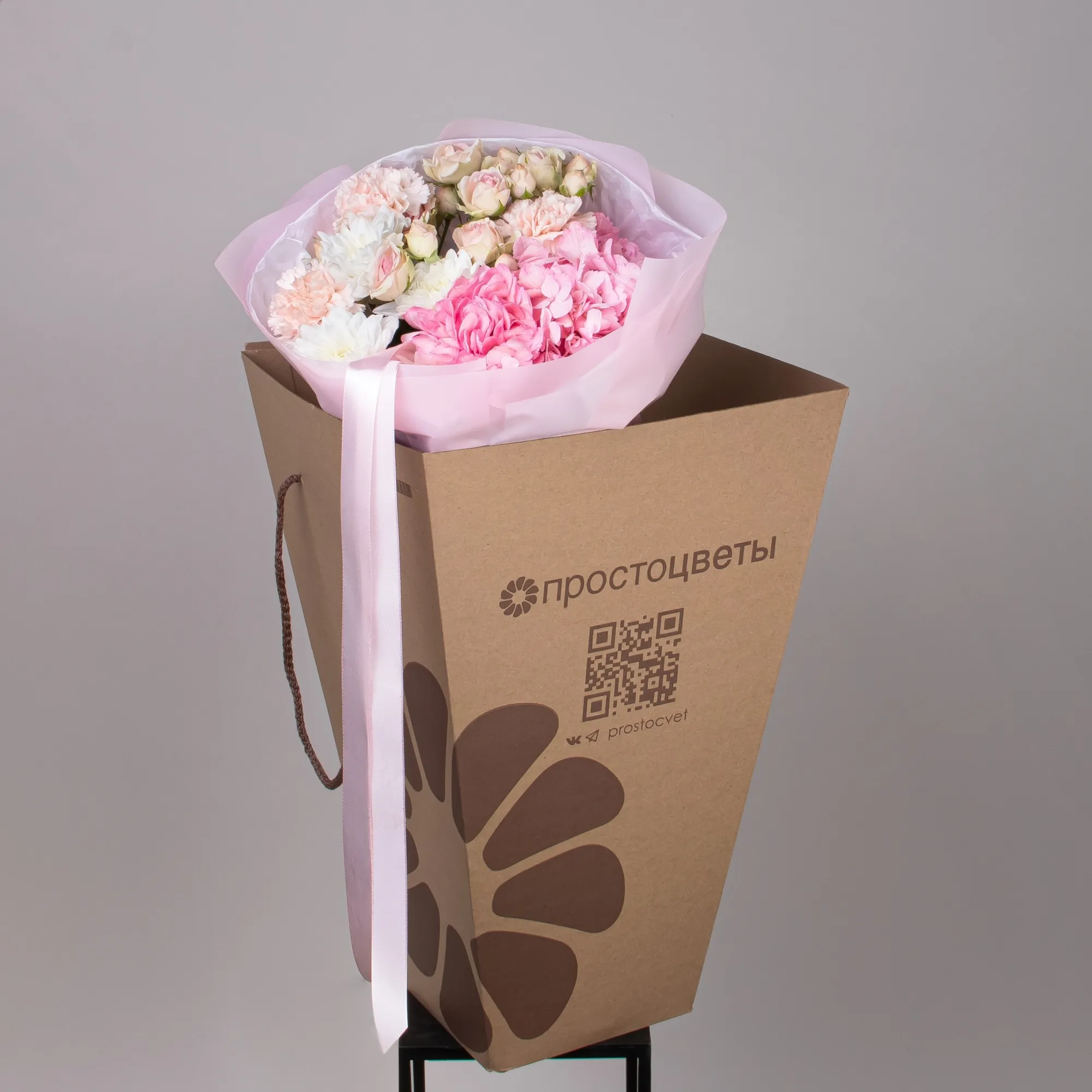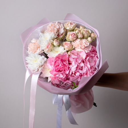 В составе букета "Розовое счастье XS" кустовая роза "Динара", белая хризантема, розовая гидрангия, розовая гвоздика. Этот букет идеальный подойдёт для следующего случая: *Первое свидание или романтическая встреча, небольшая, но изысканная композиция в нежных розовых тонах создаст уютную атмосферу и подчеркнет особый момент знакомства, компактный размер букета делает его идеальным для свидания в кафе или прогулки по городу. *Выражение благодарности или знак внимания - этот букет прекрасно подойдет, чтобы сказать спасибо близкому человеку, коллеге или подруге, небольшая, но стильная композиция в пастельных тонах будет уместна в любой ситуации и покажет ваше искреннее отношение к человеку, не перегружая ситуацию масштабностью. Закажите букет с доставкой или заберите самовывозом. И помните, что цветы - это просто.