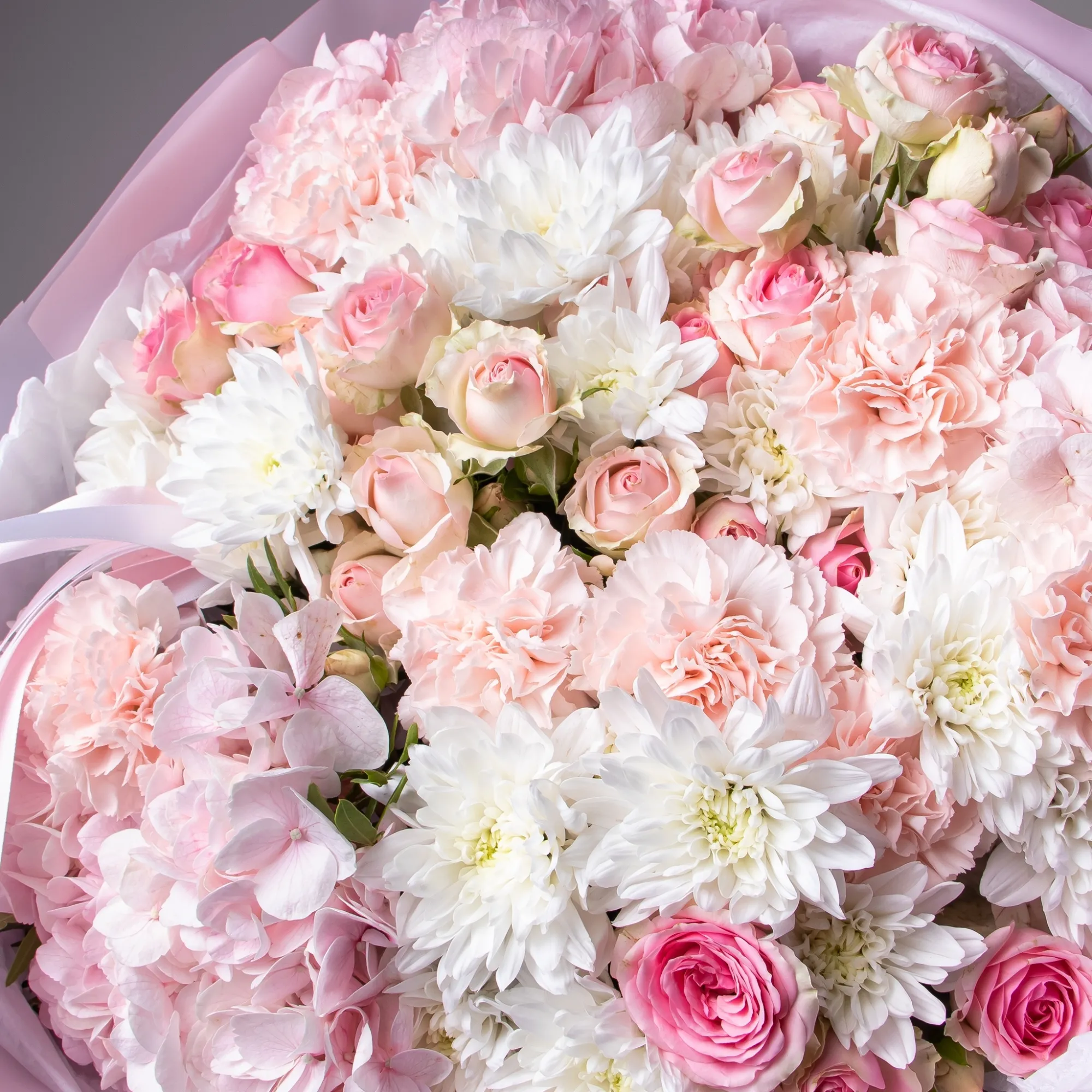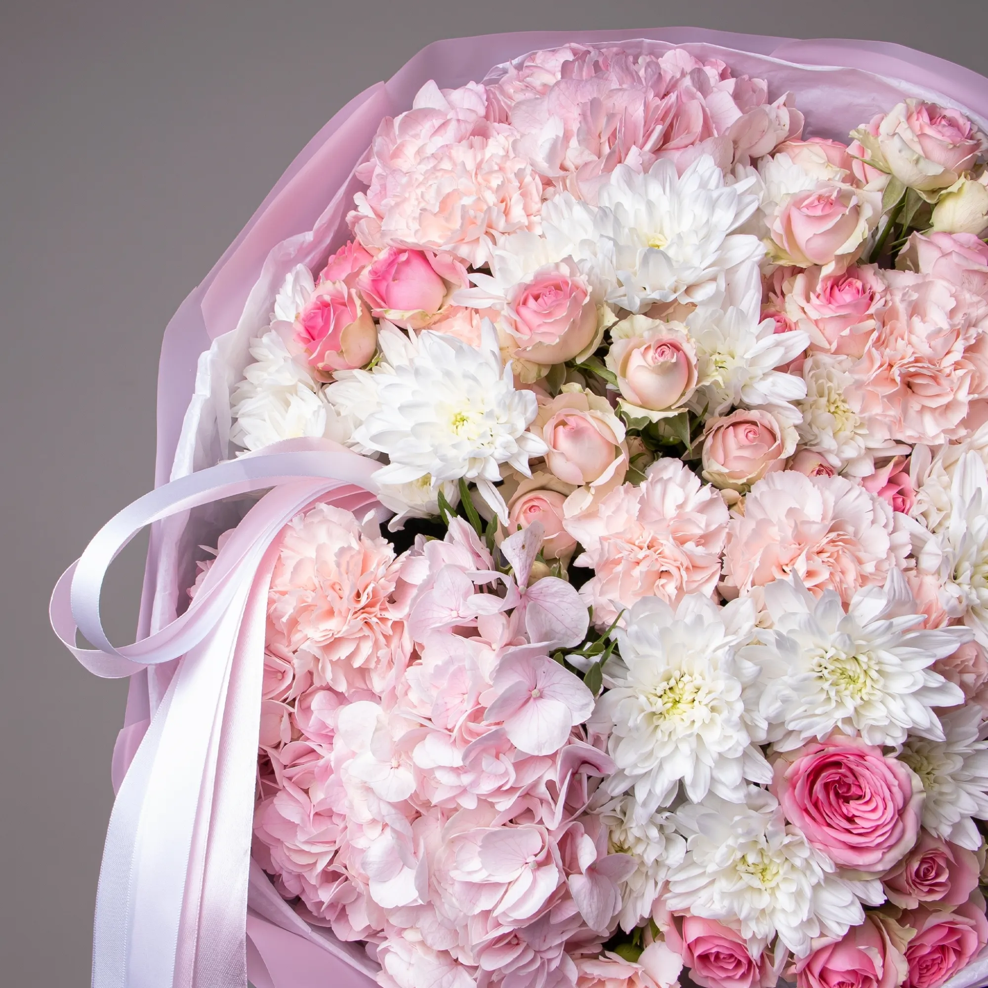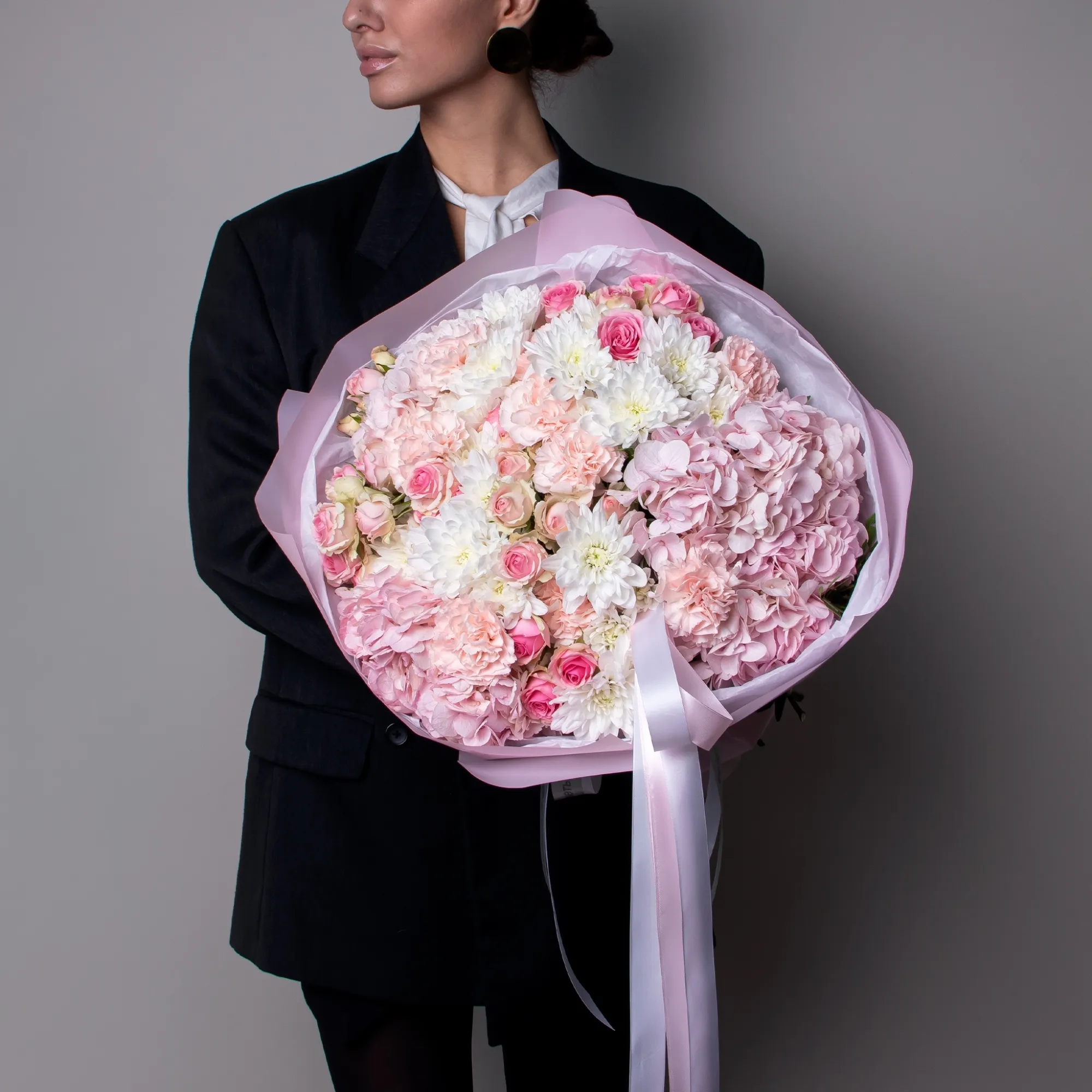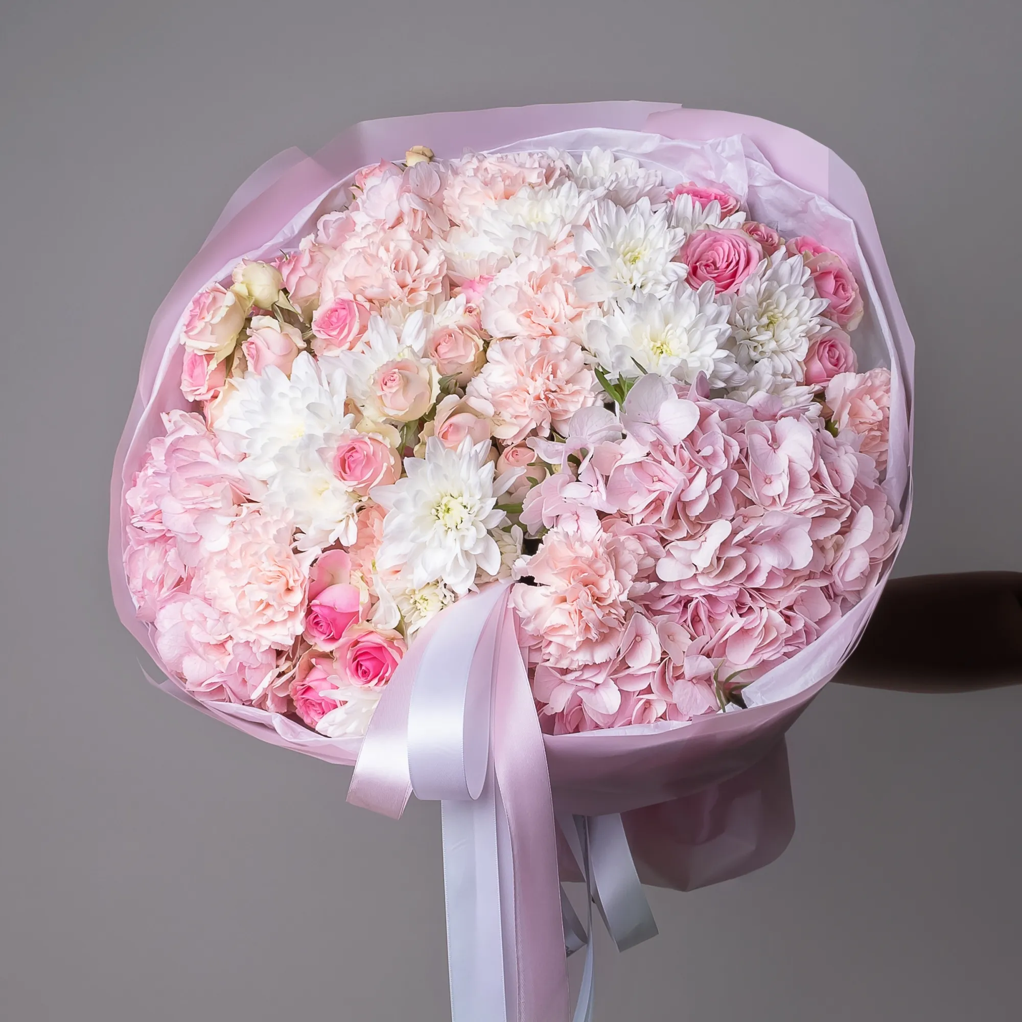 В составе букета "Розовое счастье XL" кустовая роза "Динара", белая хризантема, розовая гидрангия, розовая гвоздика. Этот букет идеально подойдёт для следующих случаев: *Свадебного торжества - роскошная композиция подчеркнет торжественность момента. *Праздничного корпоратива - яркие розовые оттенки создадут праздничное настроение. .Этот букет – настоящий шедевр флористического искусства, где каждый элемент находится на своем месте, создавая гармоничную симфонию красоты. Он словно рассказывает историю о любви, нежности и восхищении, не нуждаясь в словах. Закажите букет с доставкой или заберите самовывозом. И помните, что цветы - это просто.