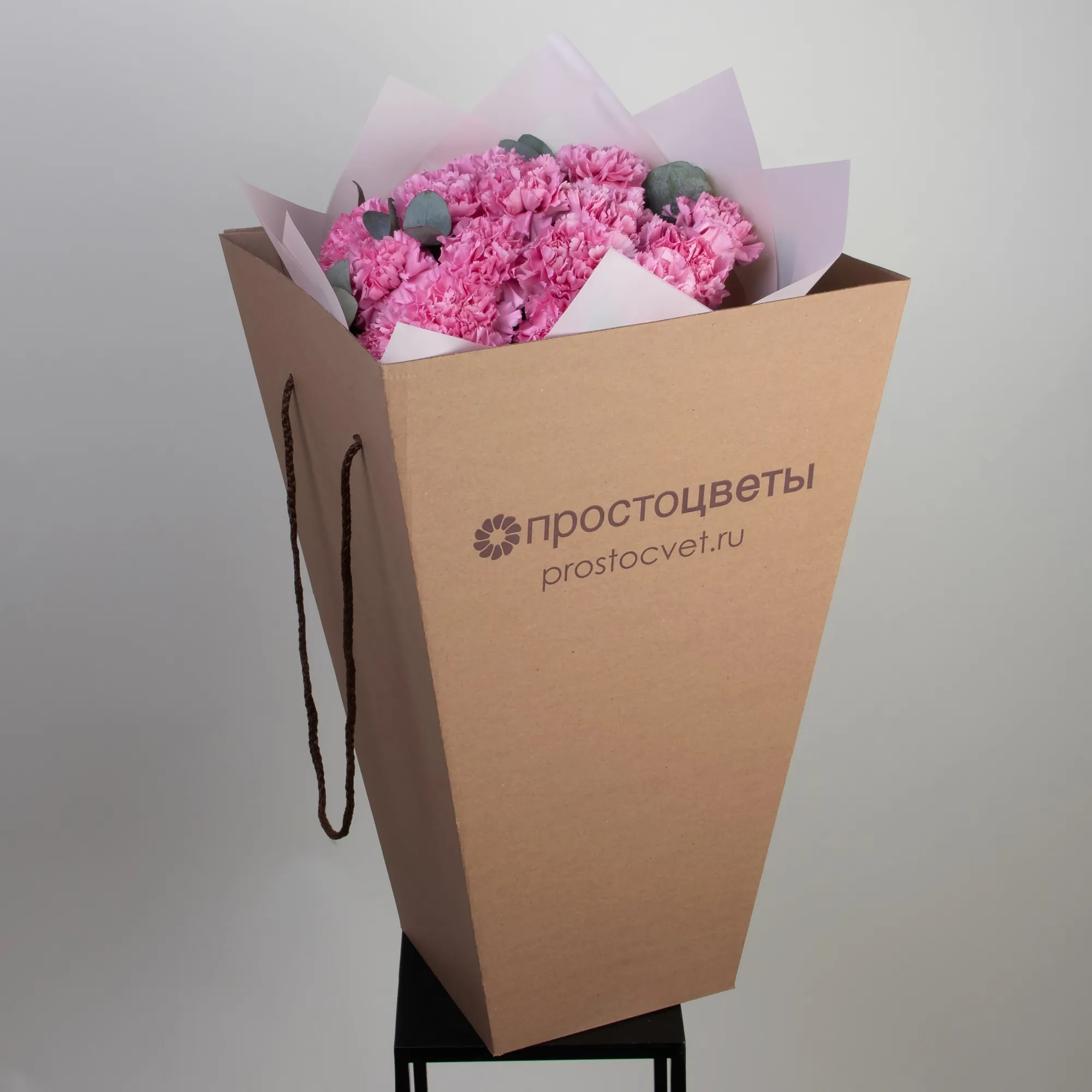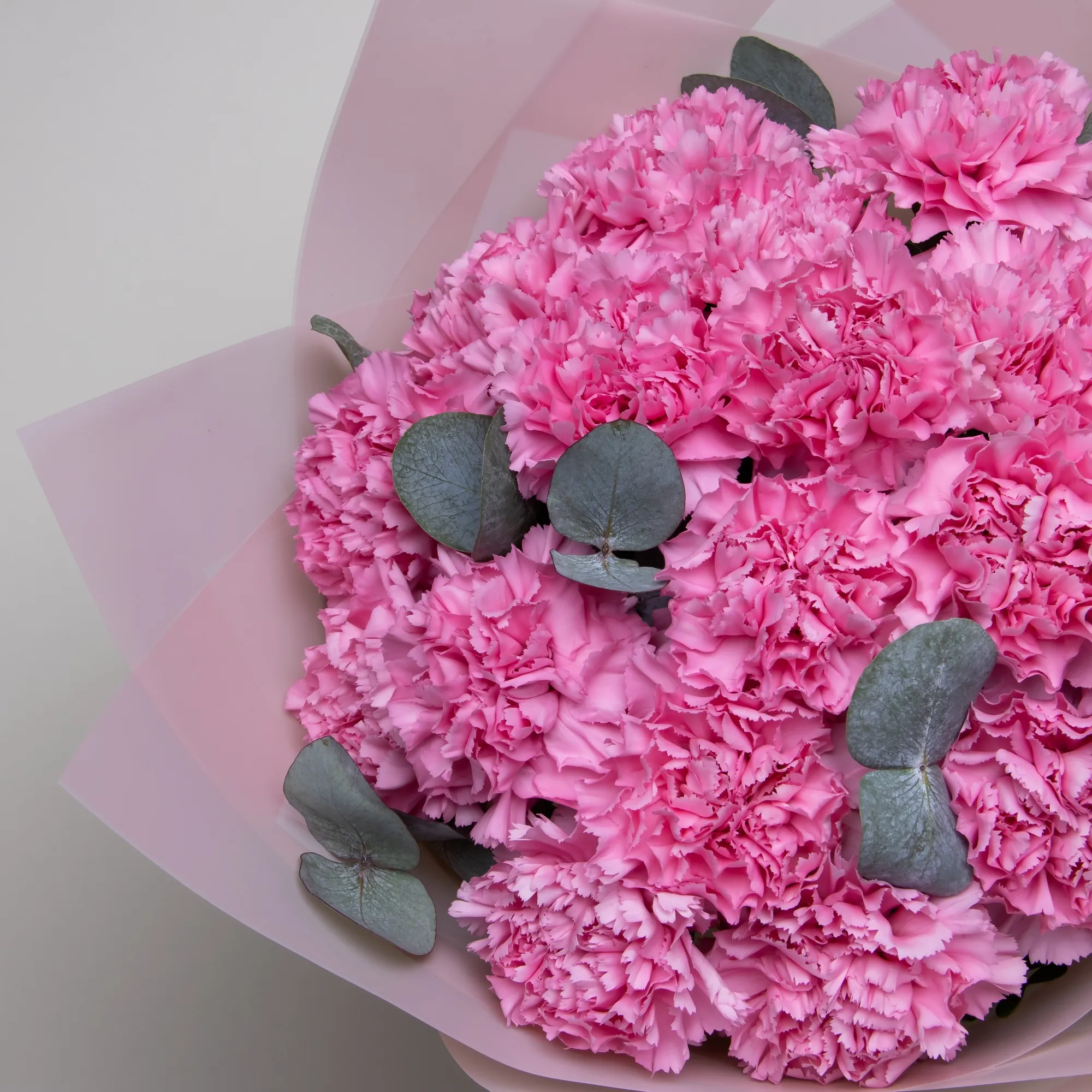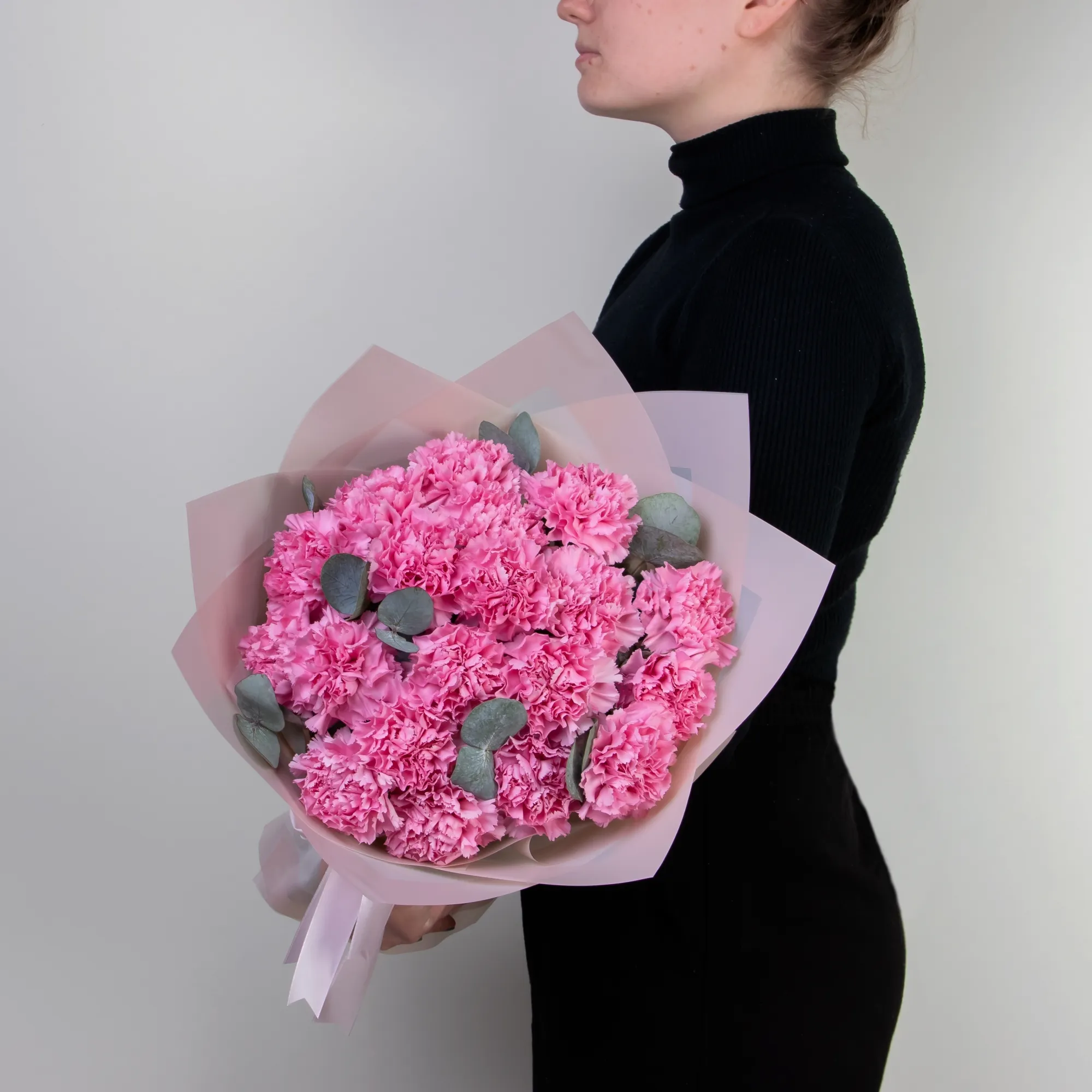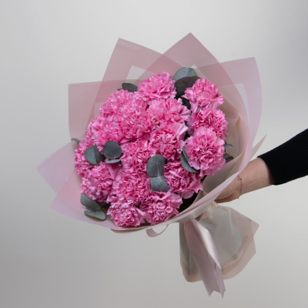 Монобукет из кружевной розовой гвоздики сорта "Лотус" и листьев эвкалипта. Дополнен лаконичной пыльно-розовой упаковкой и лентой.