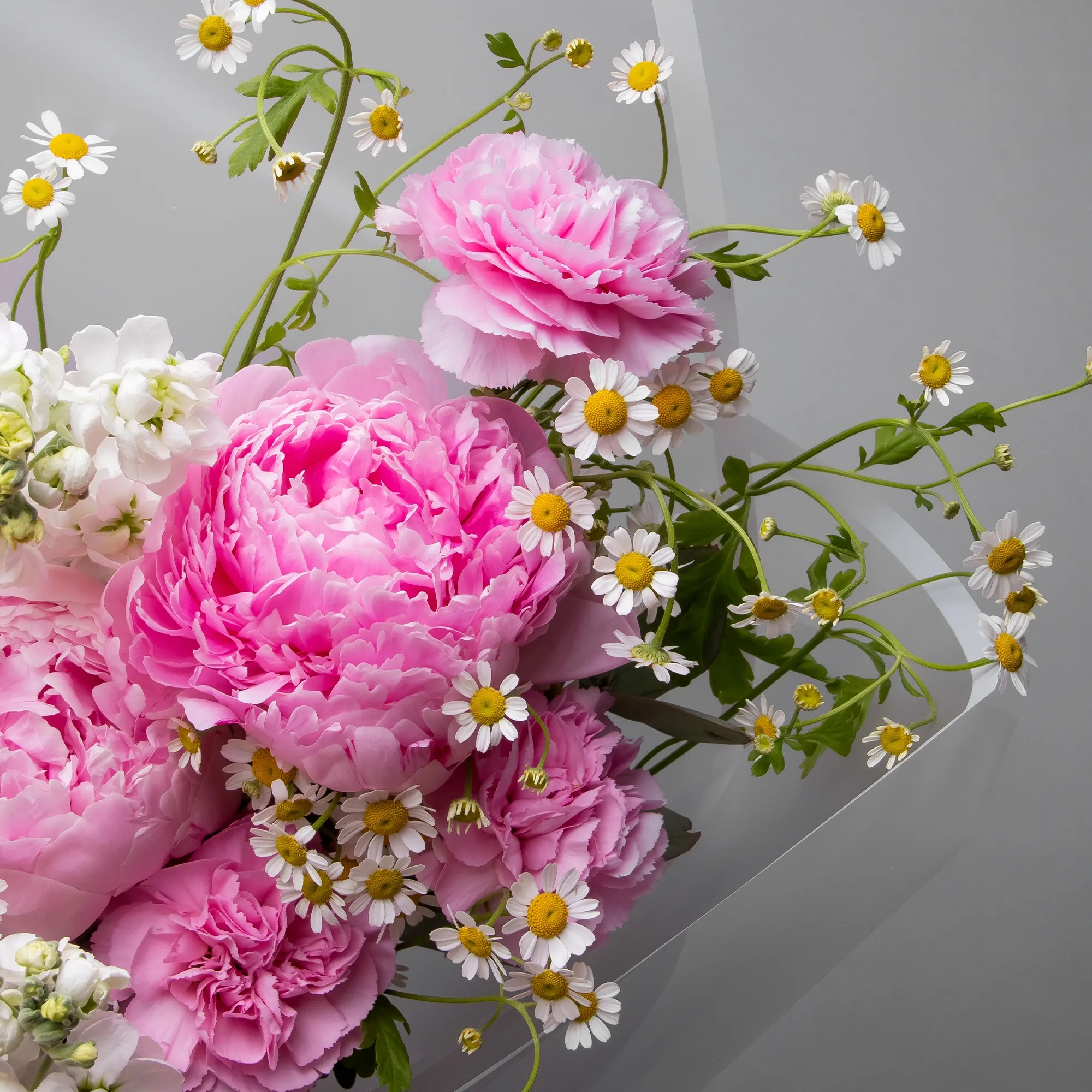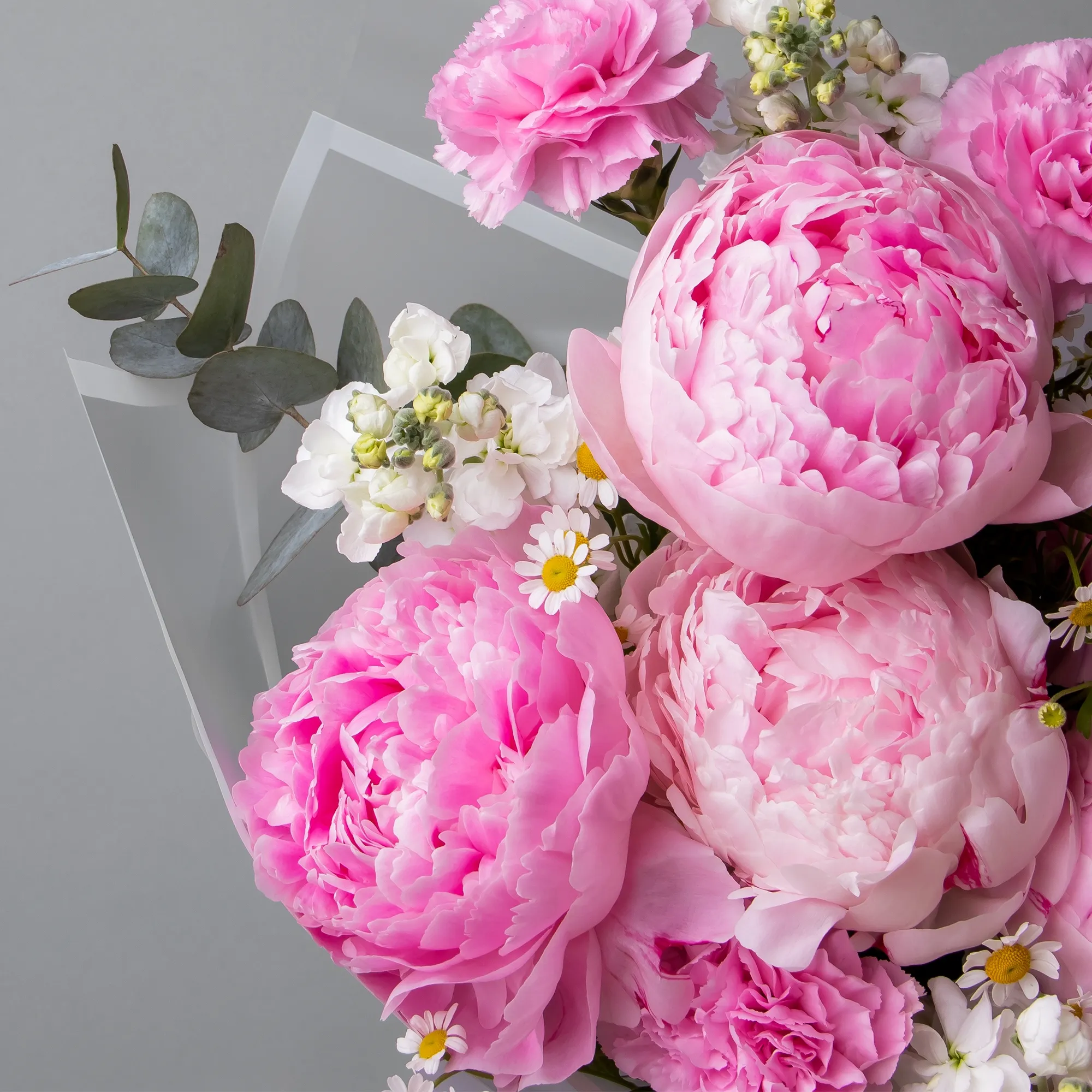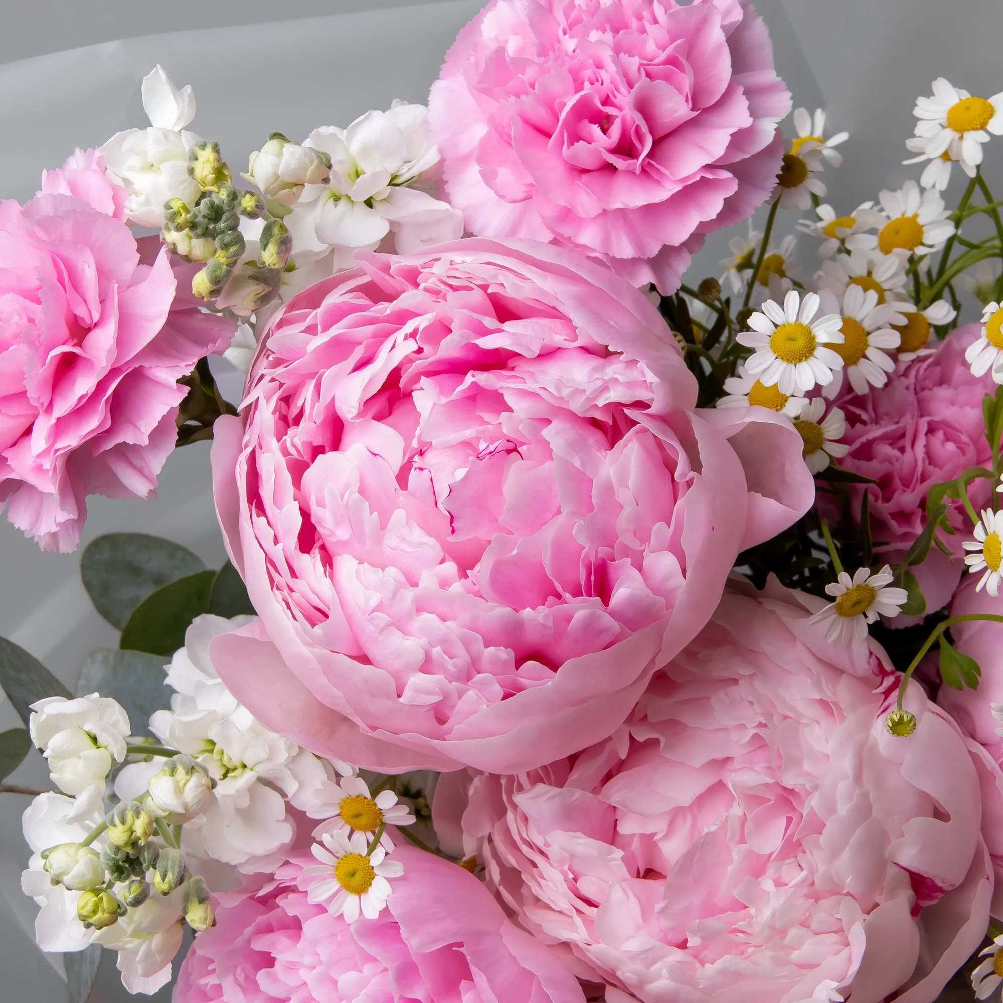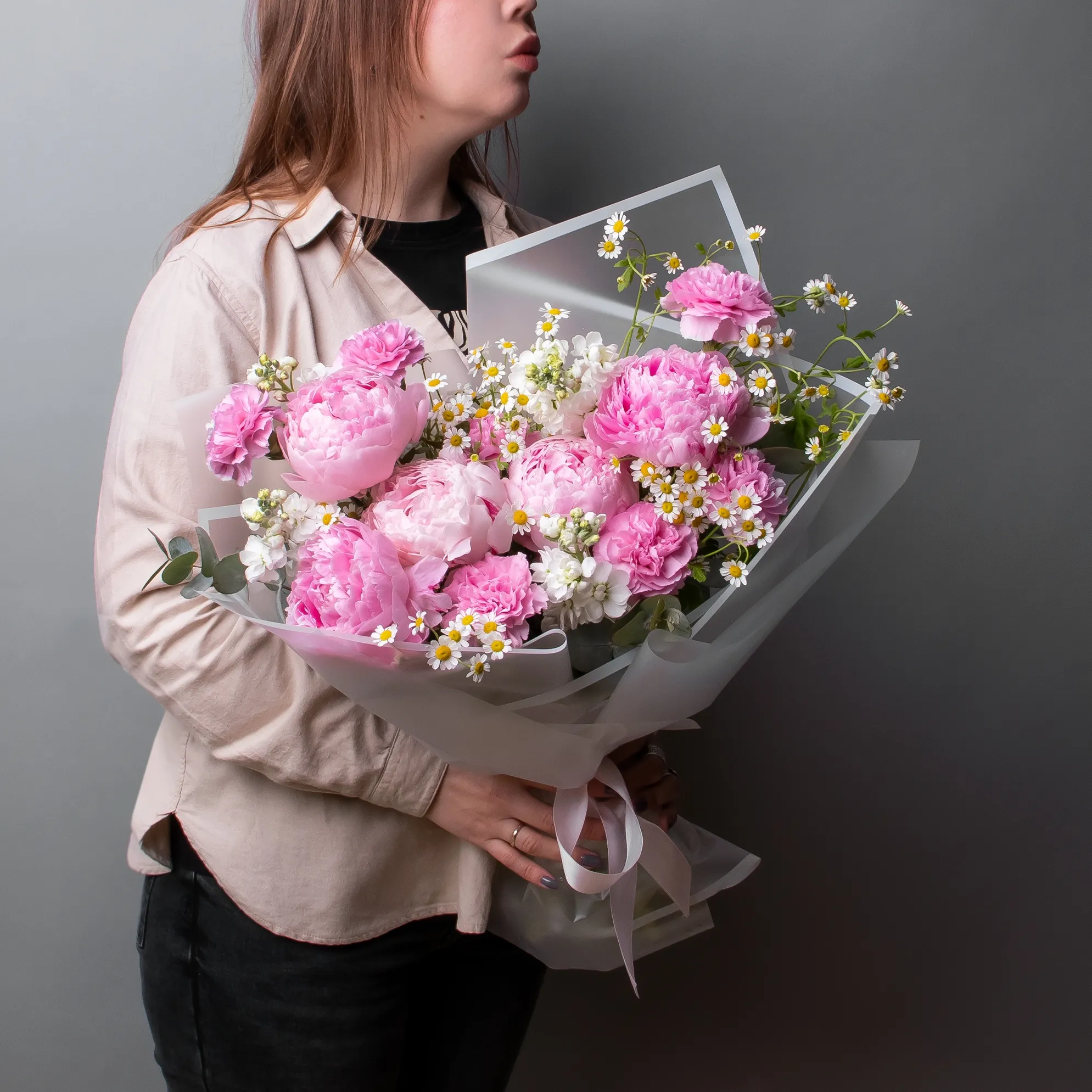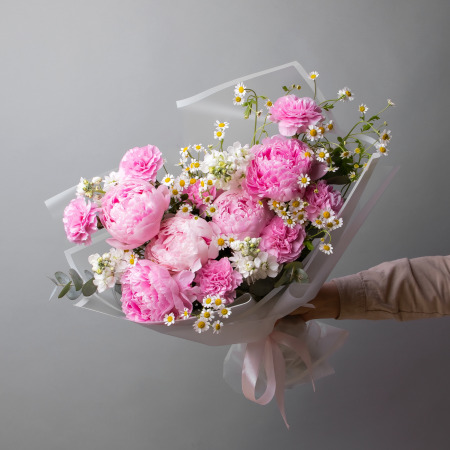 В составе букета "Розовые грезы L" белая маттиола, пион "Сара Бернард розовый", белая матрекария, розовая гвоздика, дополнен листьями фисташки и эвкалипта. Этот букет идеально подойдёт для следующих случаев:*День матери или поздравление с рождением ребенка - нежные пастельные тона букета символизируют материнство и заботу., пионы традиционно ассоциируются с плодородием и благополучием, а белая маттиола добавляет композиции особую нежность и теплоту. *Романтический подарок для любимой женщины - сочетание розового и белого цветов создает романтичную атмосферу, а пышные пионы символизируют любовь и восхищение, зелень в букете придает композиции легкость и свежесть, что делает её идеальным подарком для выражения нежных чувств. Закажите букет с доставкой или заберите самовывозом. И помните, что цветы - это просто.
