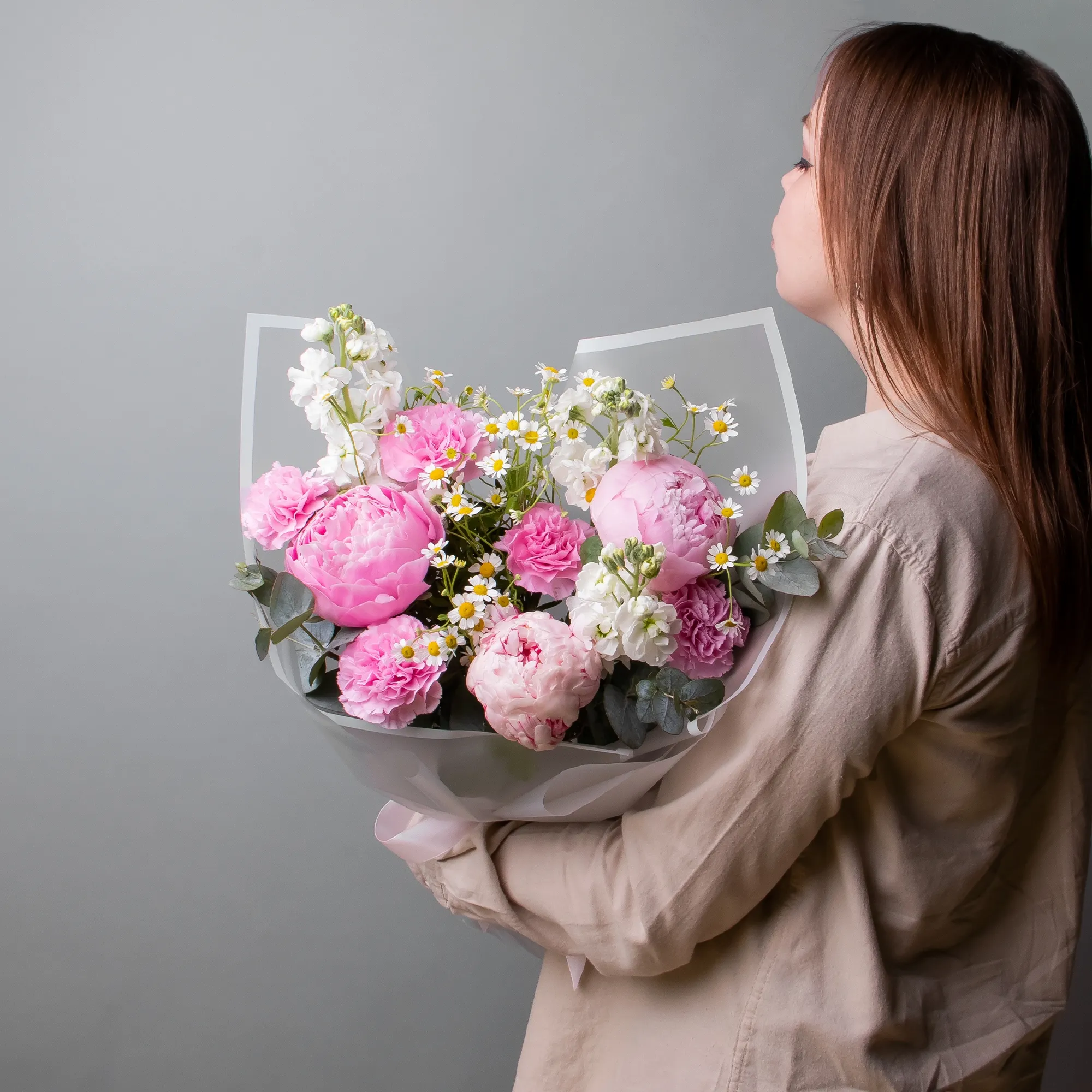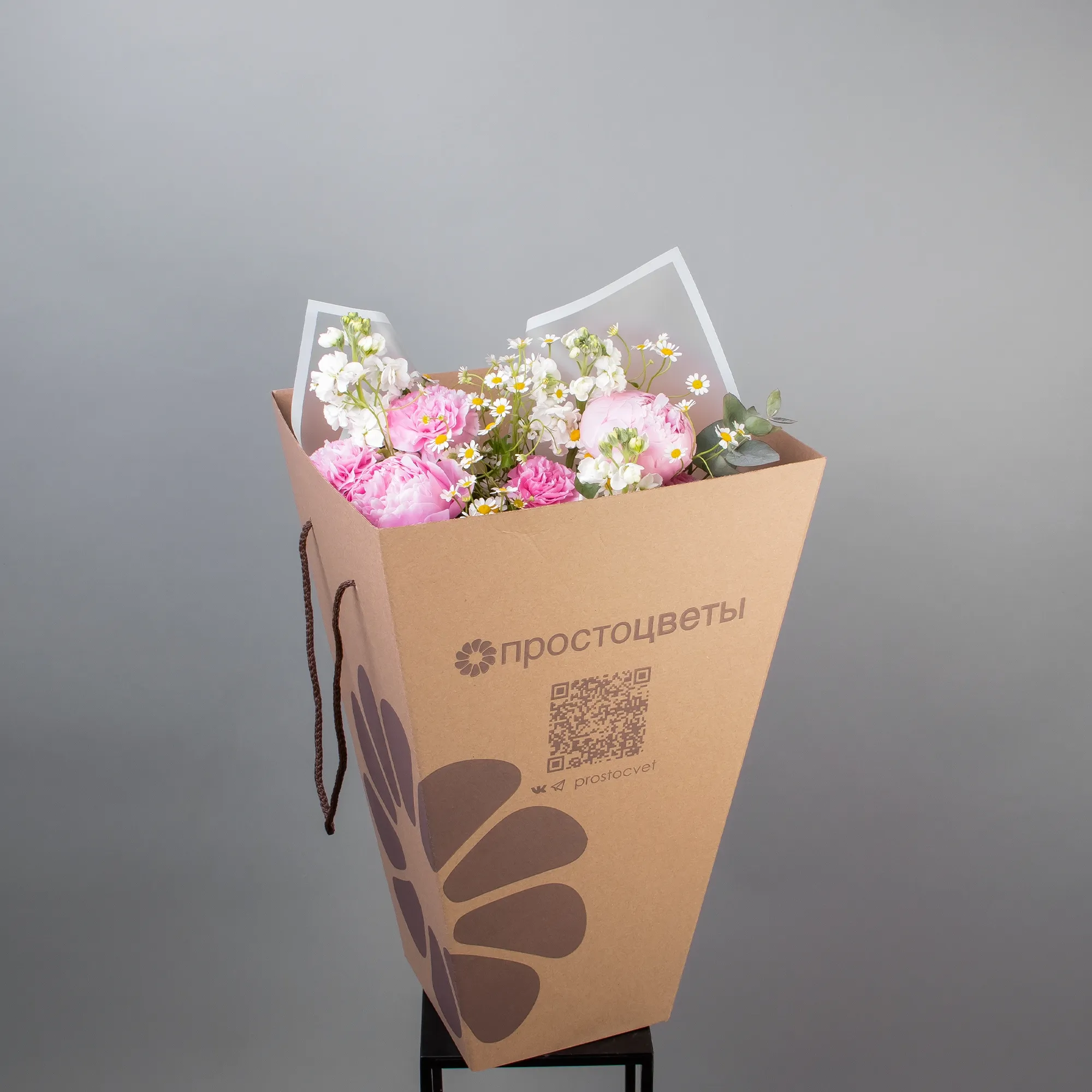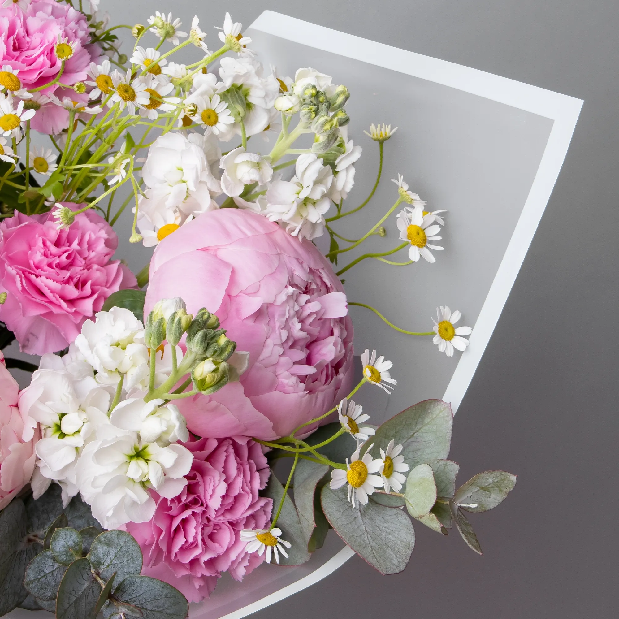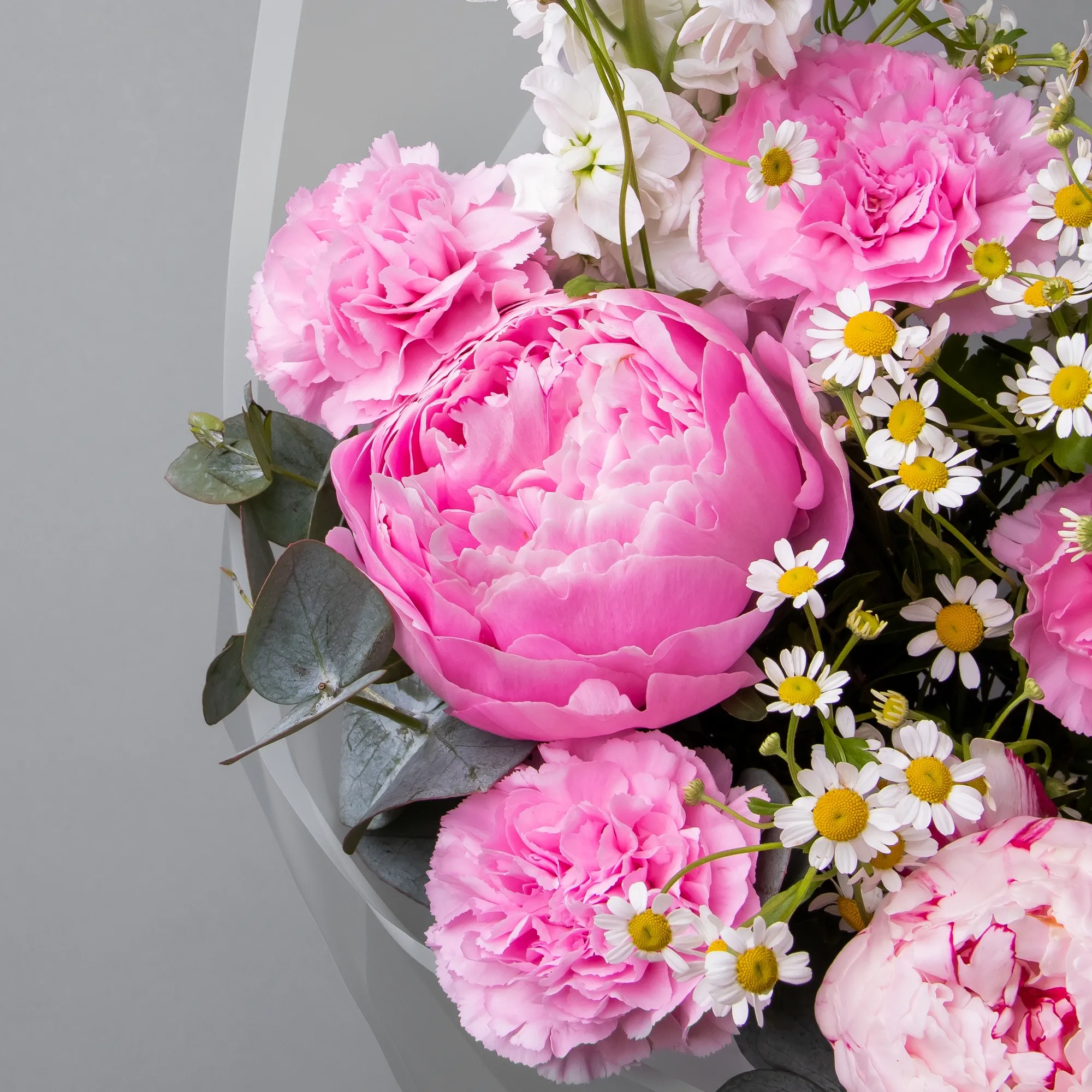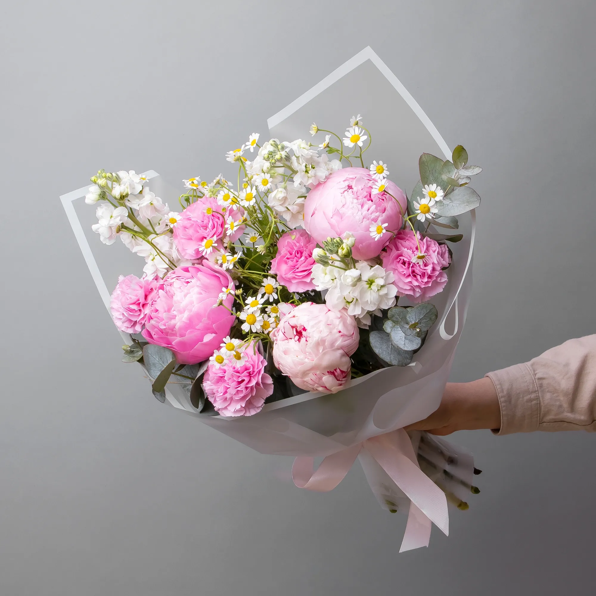 В составе букета "Розовые грезы M" белая маттиола, пион "Сара Бернард розовый", белая матрекария, розовая гвоздика, дополнен листьями фисташки и эвкалипта. Этот букет идеально подойдёт для следующих случаев: *Поздравление с юбилеем или важным достижением, средний размер букета делает его идеальным для официальных торжеств, где требуется элегантность, но без излишней помпезности. Роскошные пионы символизируют успех и благополучие, а сочетание розовых и белых оттенков создает атмосферу праздника. *Выражение благодарности или знак внимания близкому человеку, компактная, но изысканная композиция в нежных тонах подойдет для выражения признательности или теплых чувств, такой букет будет уместен как в домашней обстановке, так и в офисе, не перегружая пространство, но создавая приятное впечатление. Закажите букет с доставкой или заберите самовывозом. И помните, что цветы - это просто.