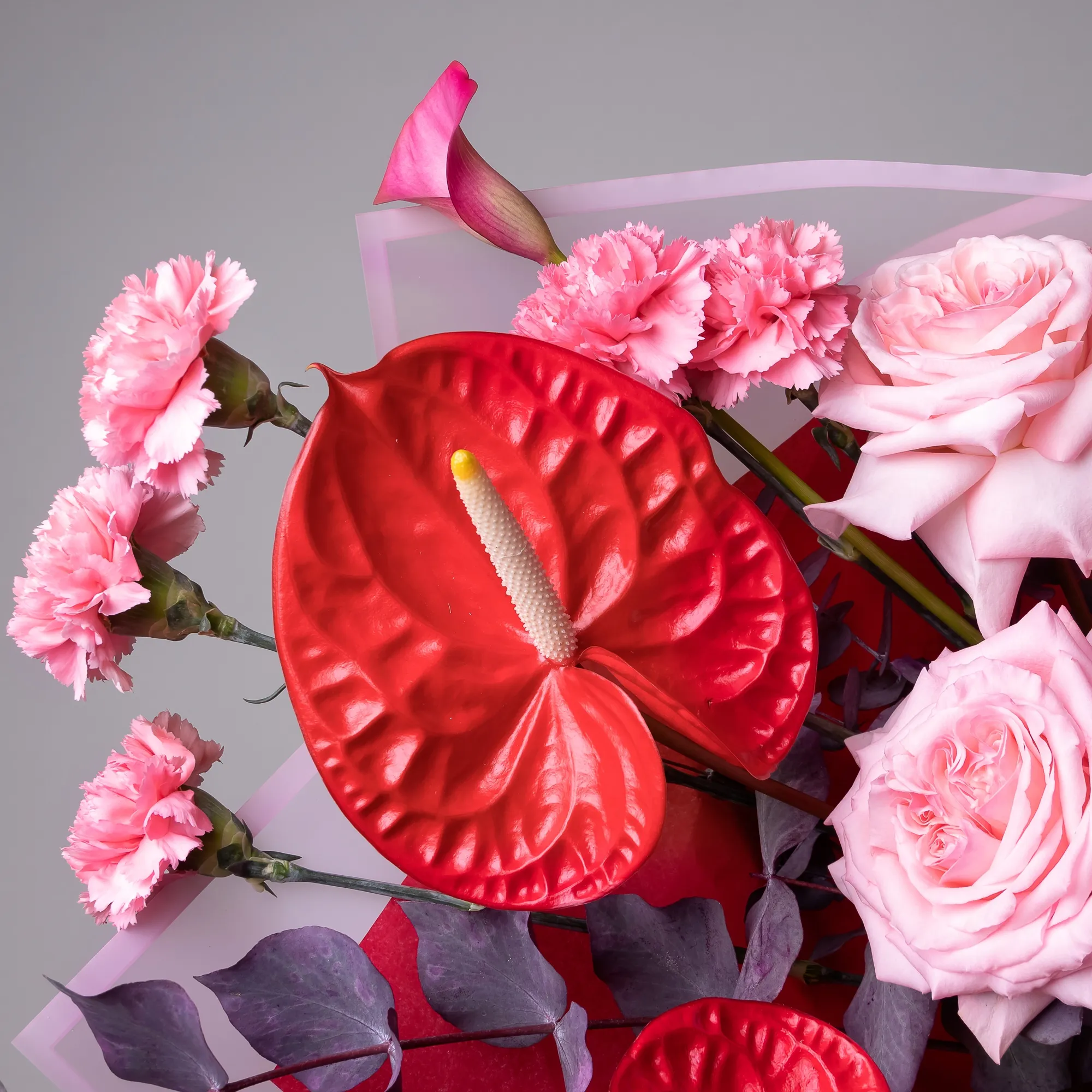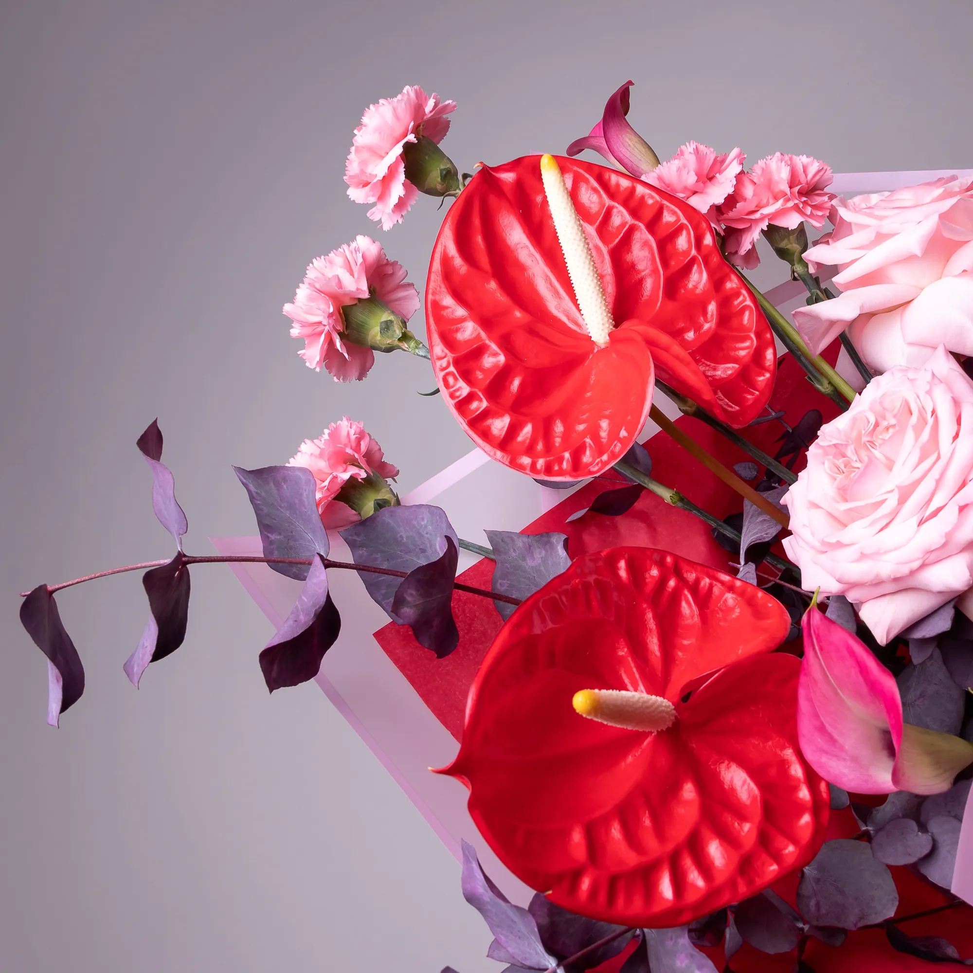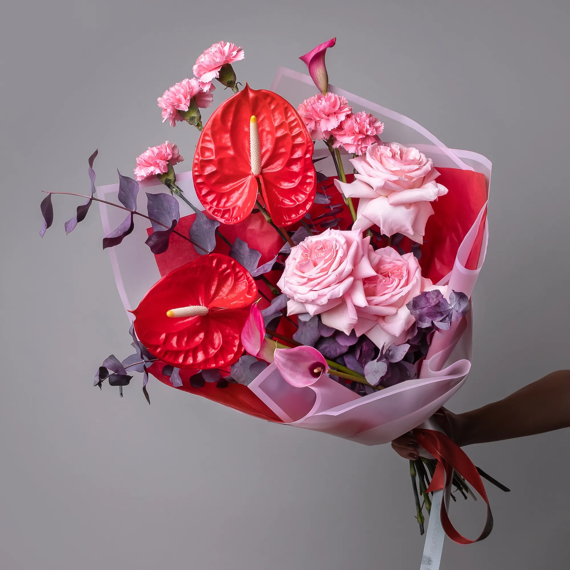 Гвоздика-5, Антуриум-2, Калла-3, Роза пионовидная-3, Листья эвкалипта-2