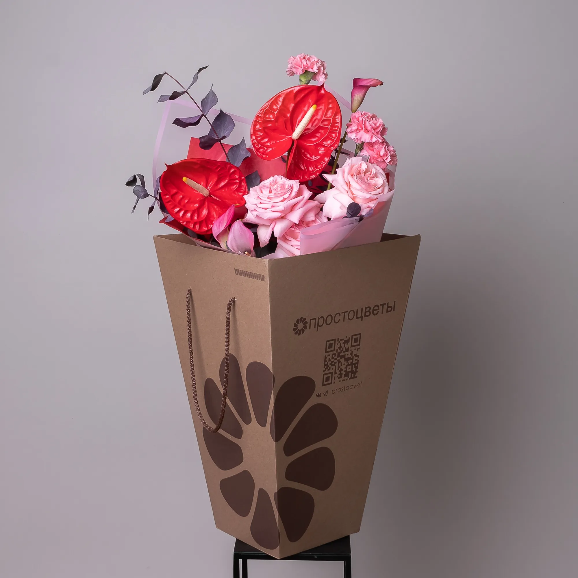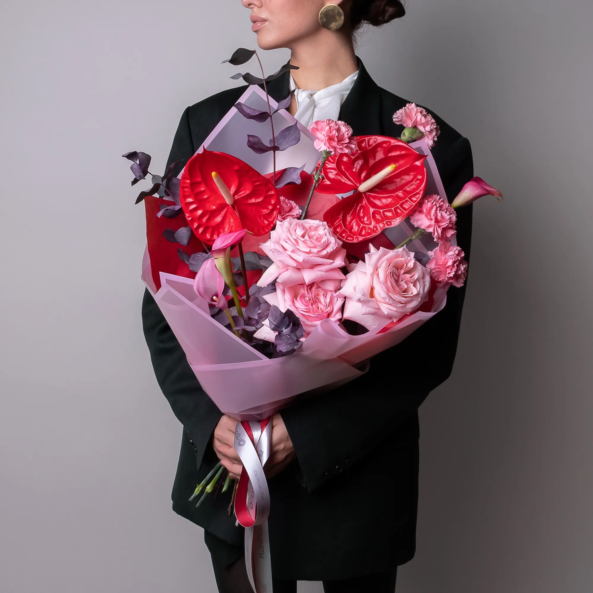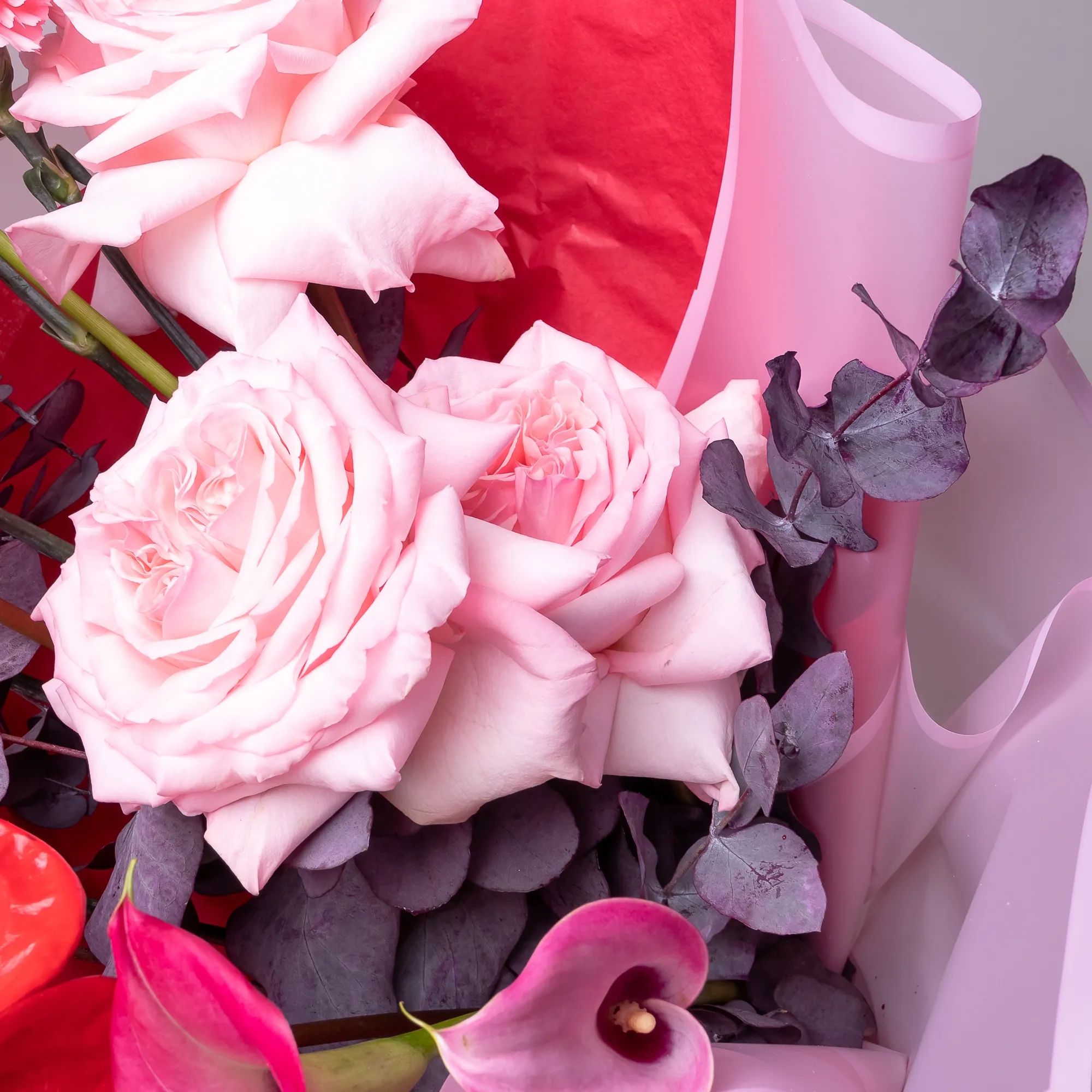 Гвоздика-5, Антуриум-2, Калла-3, Роза пионовидная-3, Листья эвкалипта-2