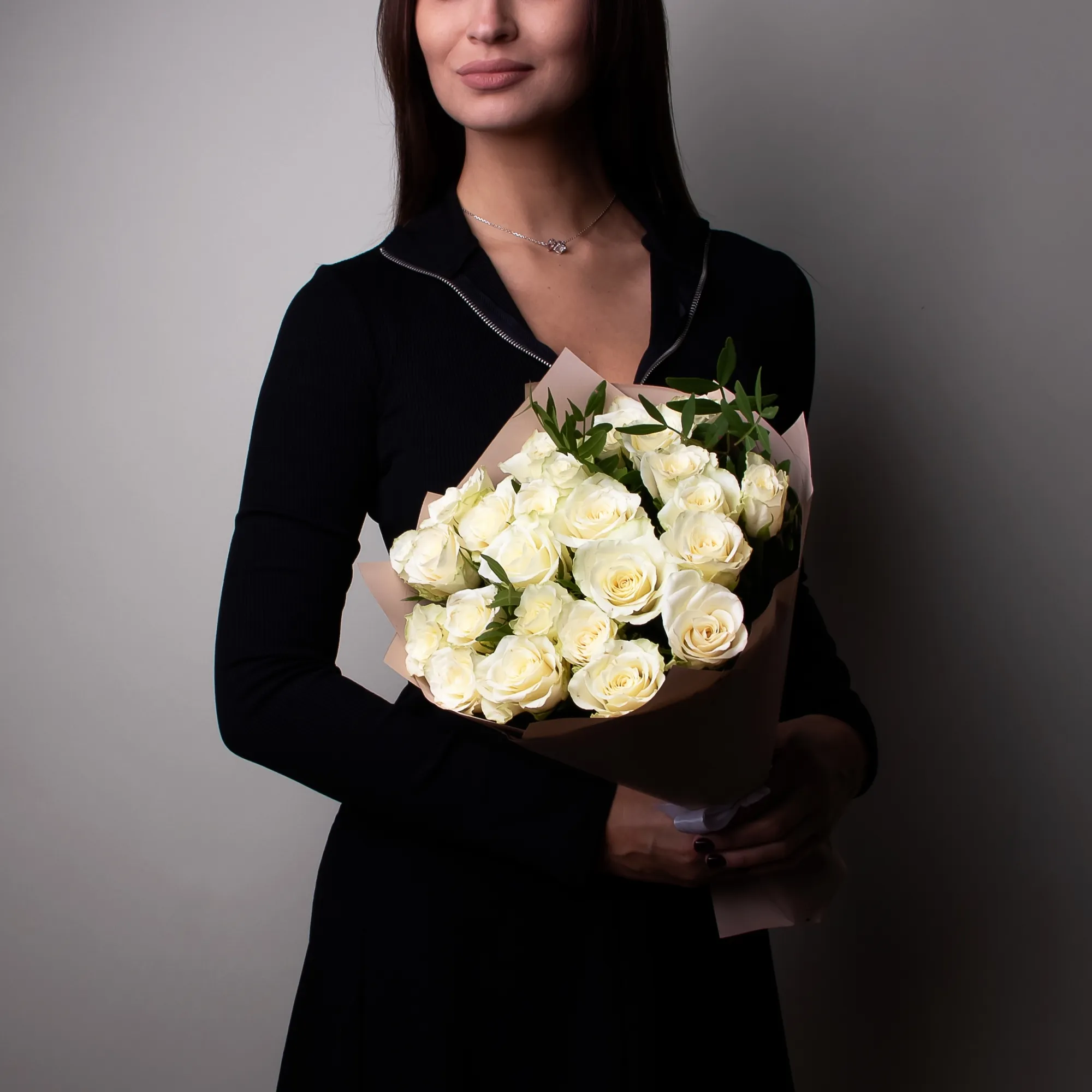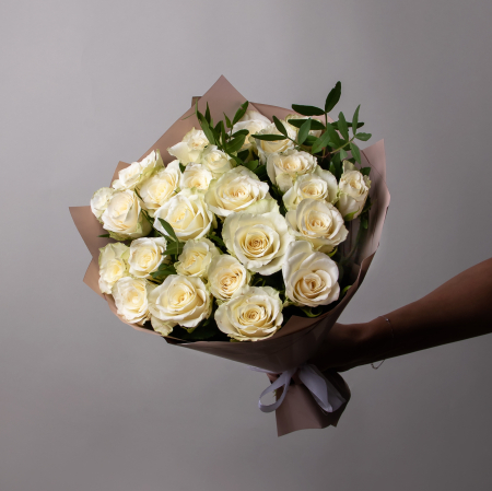 Компактный небольшой монобукет из 25 белых роз высотой 35-40 см.