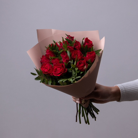 Компактный небольшой монобукет из 15 красных роз высотой 35-40 см.