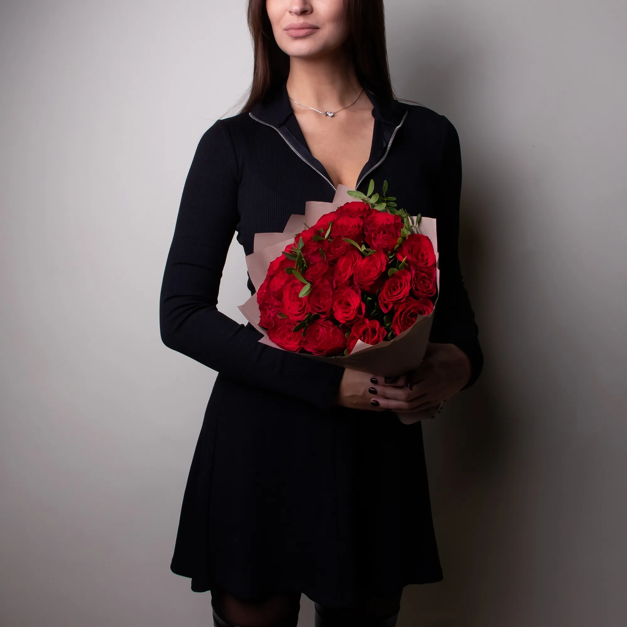 Компактный небольшой монобукет из 25 красных роз высотой 35-40 см.