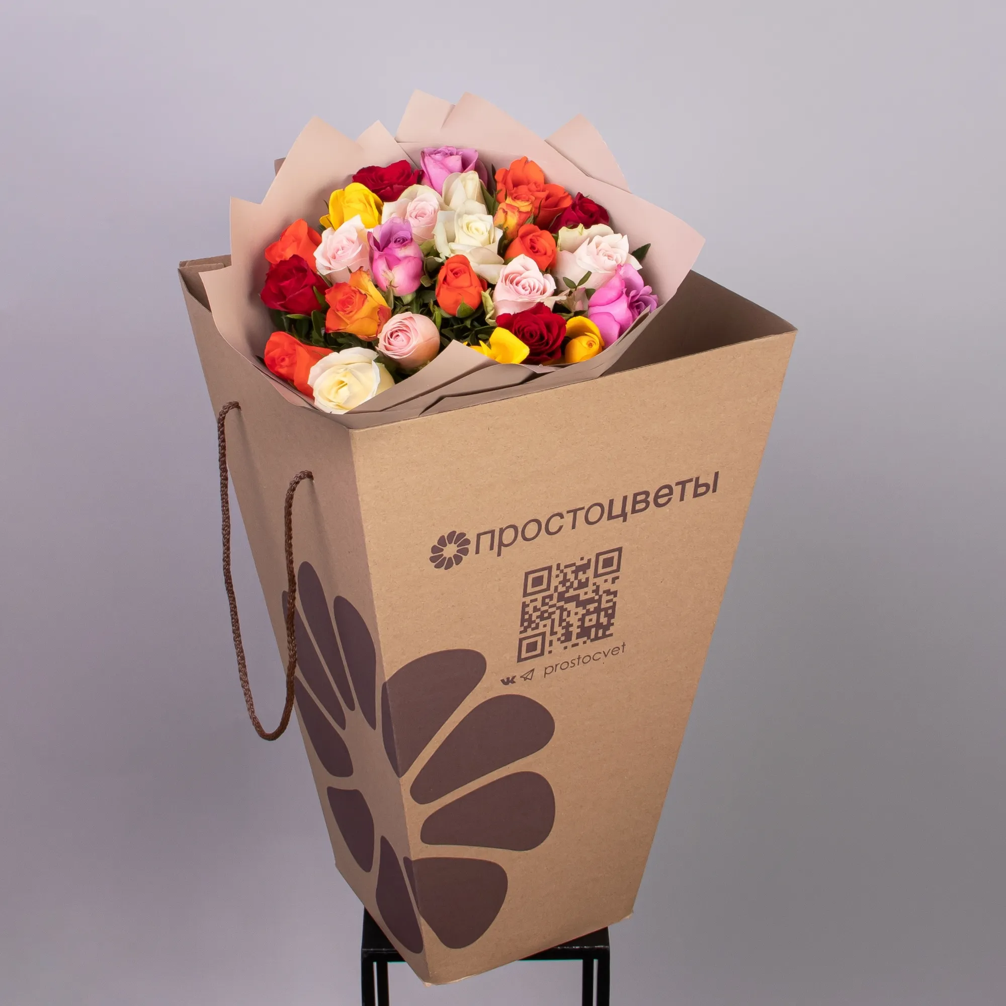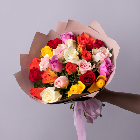 Выбор конкретного цвета роз в рамках этой позиции не предусмотрен. Идеальное решение для подарка от лица ребенка на праздник 1 сентября, Последнего звонка или выпускной из детского сада или школы. Дополнен лаконичной упаковкой бежево-кофейного цвета.