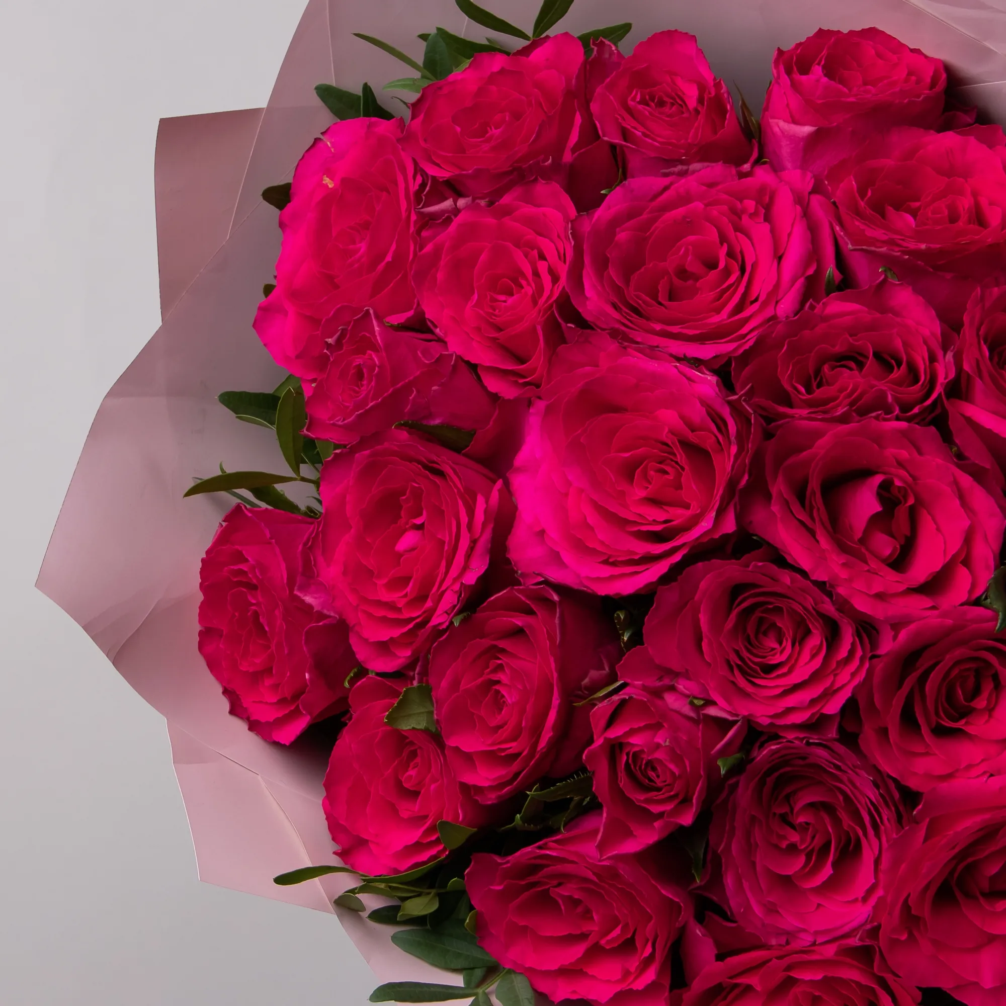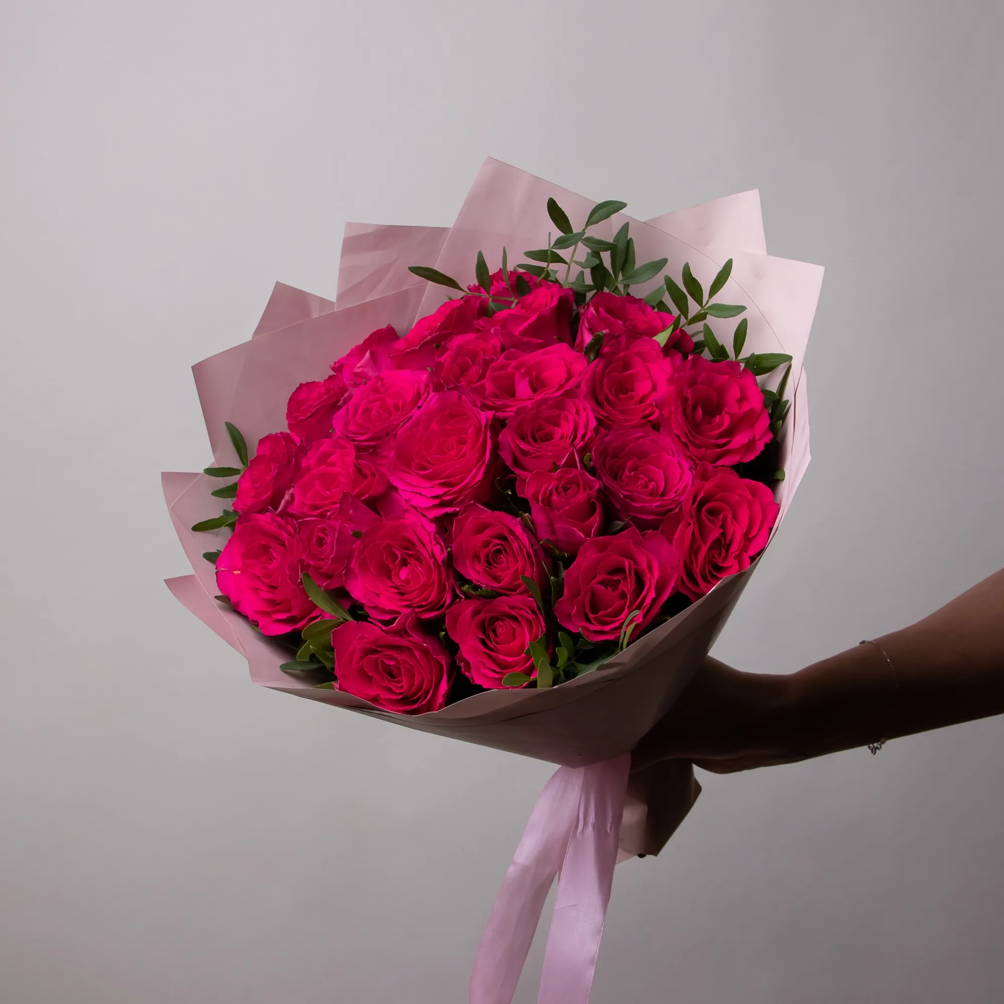 Компактный небольшой монобукет из 25 розовых роз высотой 35-40 см.