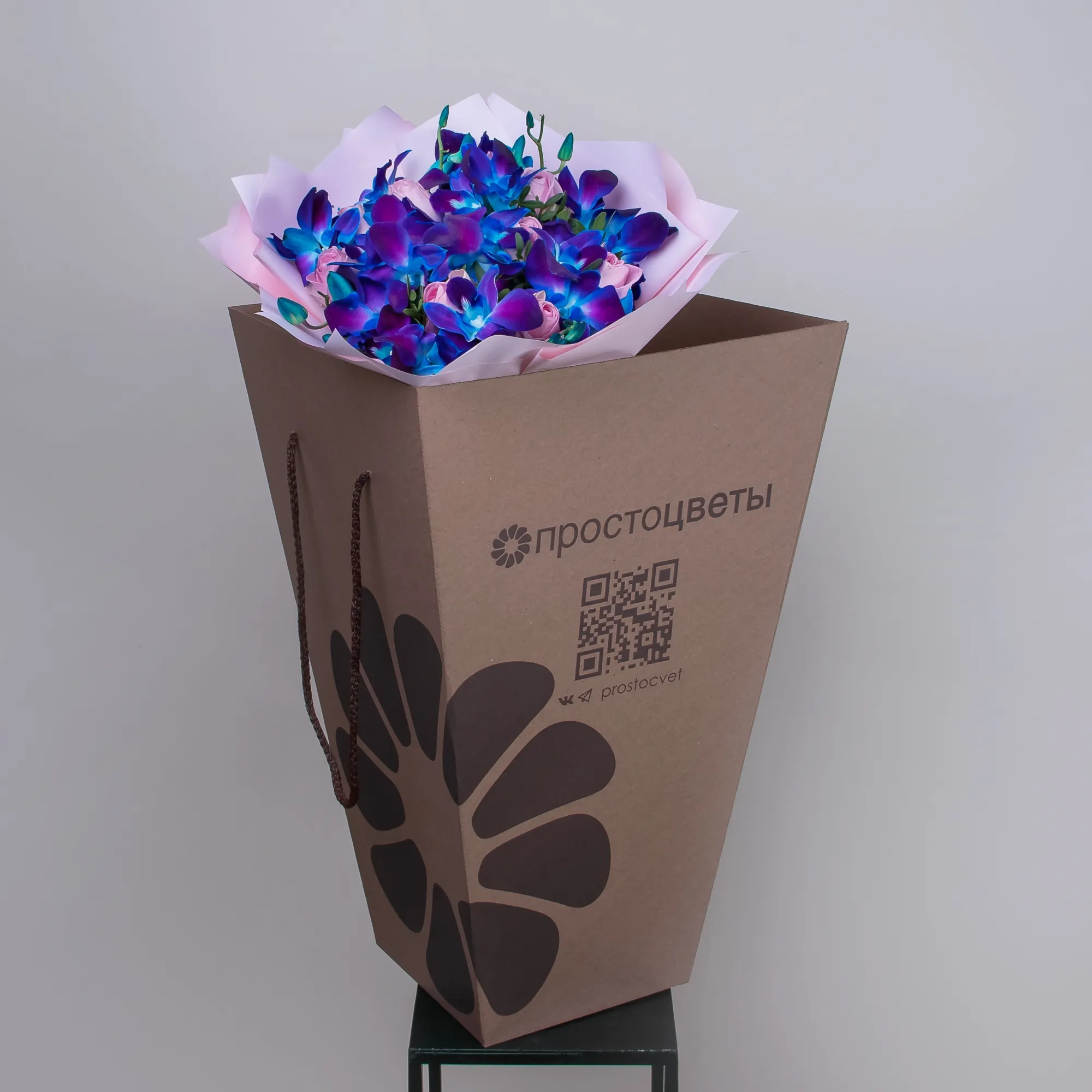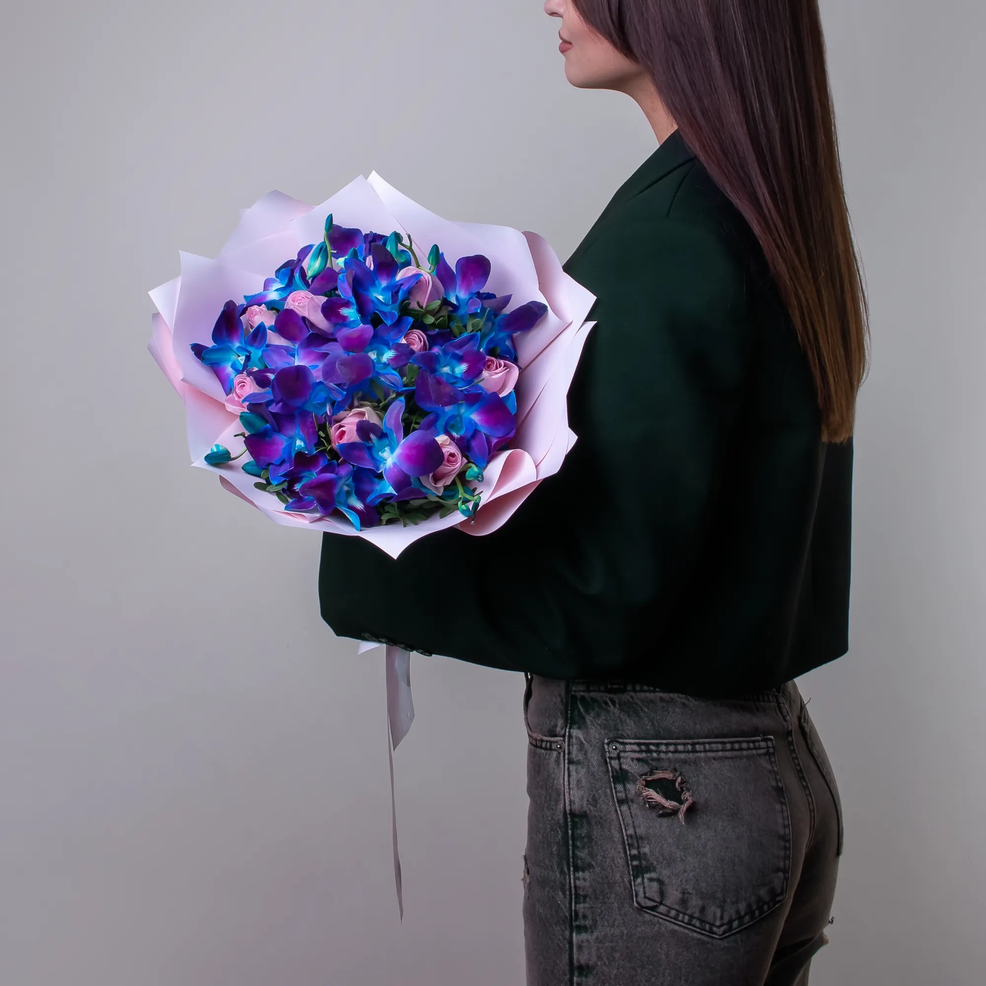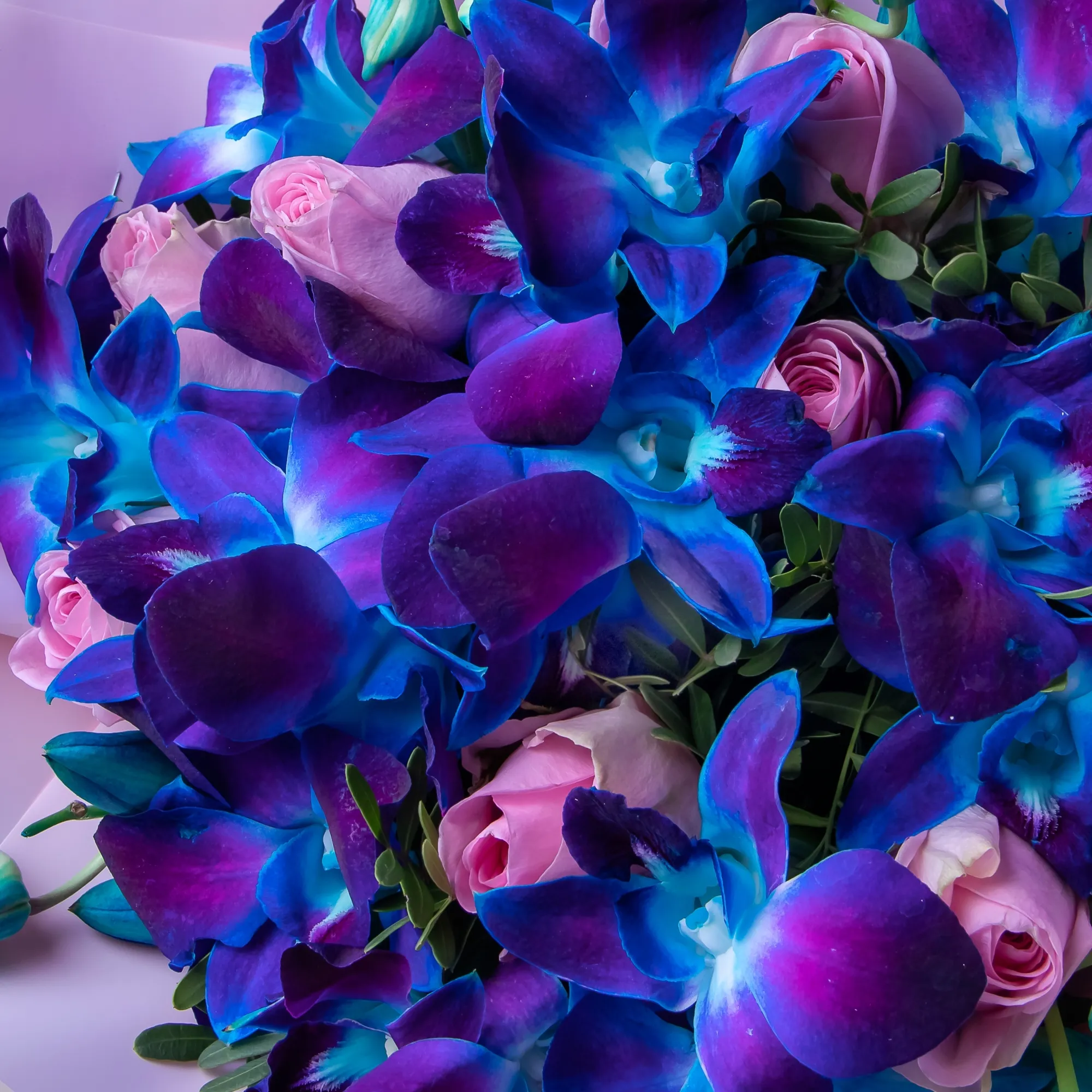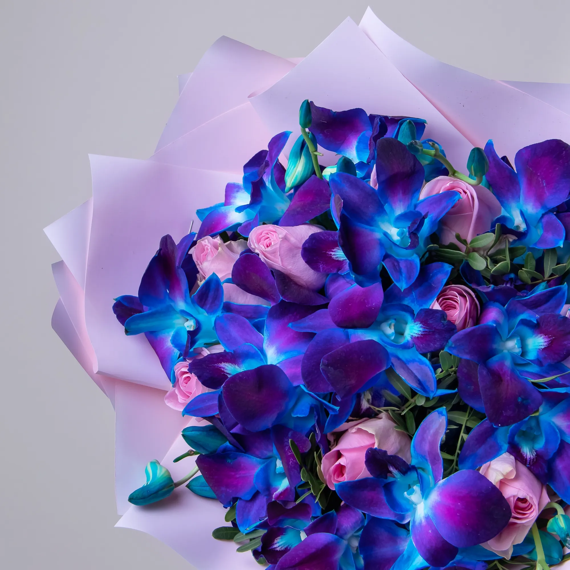 Букет из розовых роз и синих орхидей "Салют"